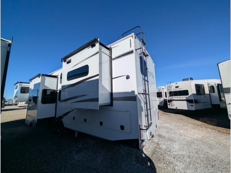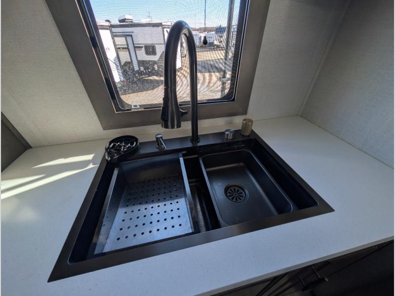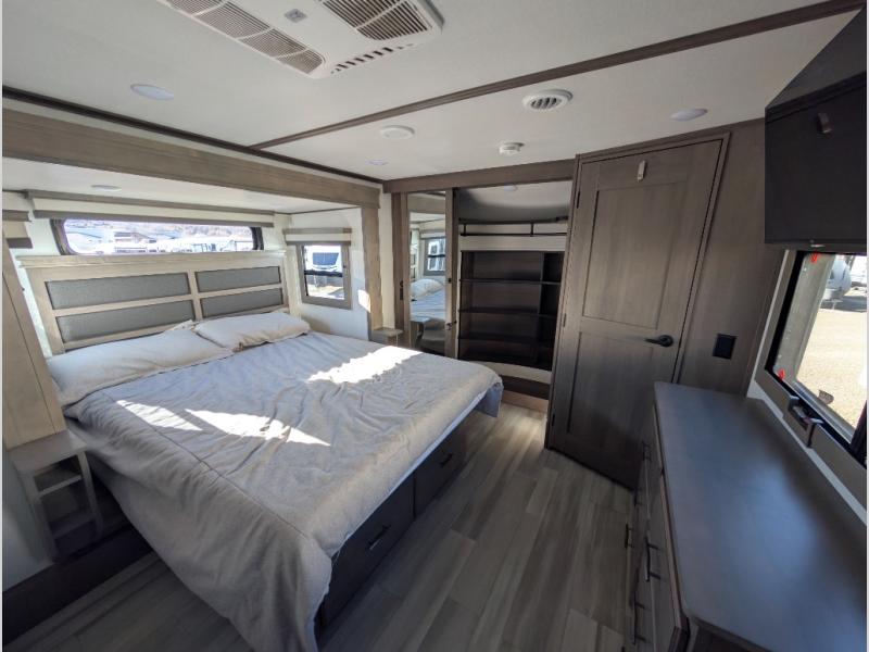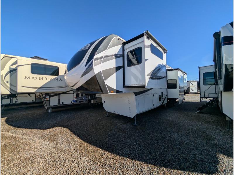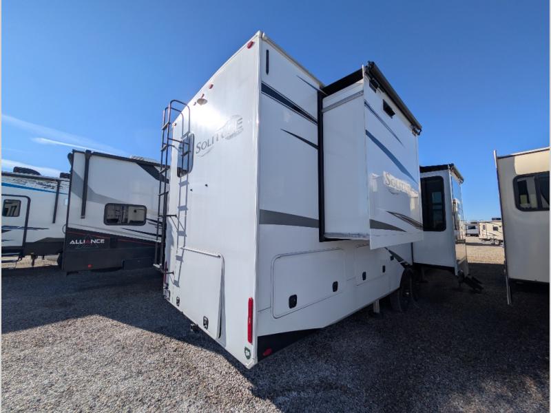 Each Solitude fifth wheel by Grand Design features a 101" wide-body construction, heavy duty 7,000 lb. axles, frameless tinted windows, and high-gloss gel coat sidewalls. You can camp year around thanks to the Weather-Tek Package that includes a 35K BTU high-capacity furnace, an all-in-one enclosed and heated utility center, and a fully enclosed underbelly with heated tanks and storage. Inside, you'll love the premium roller shades, hardwood cabinet doors, solid surface countertops and sinks, plus residential finishes throughout to make you truly feel at home. Each model also includes a MORryde CRE3000 suspension system, self adjusting brakes, and a MORryde pin box that will provide smooth towing from home to campground. Affordable luxury is possible with the Solitude fifth wheels; choose yours today!