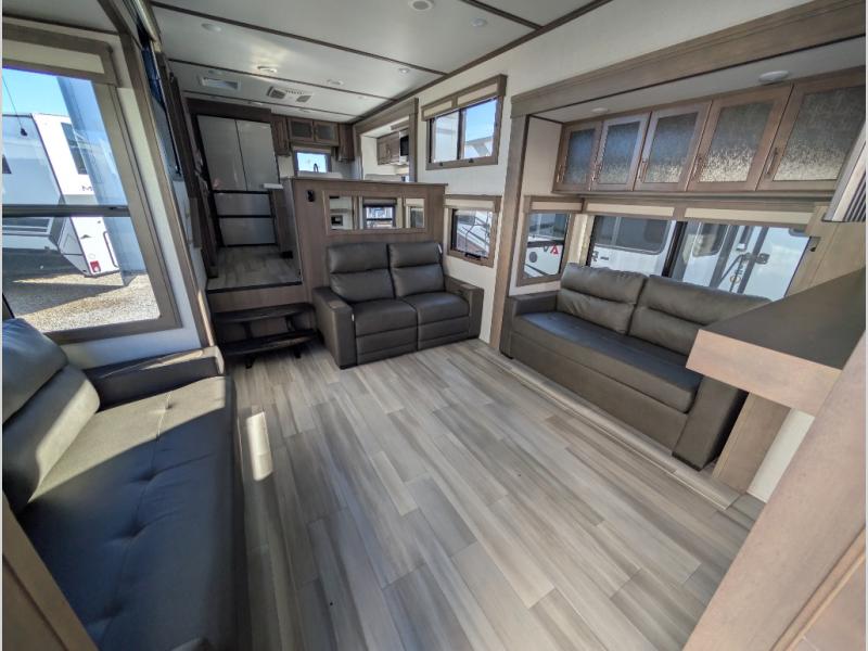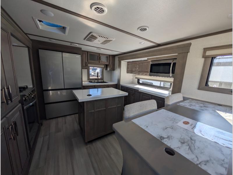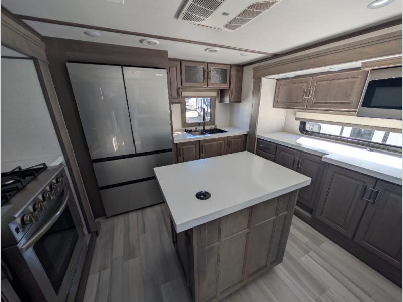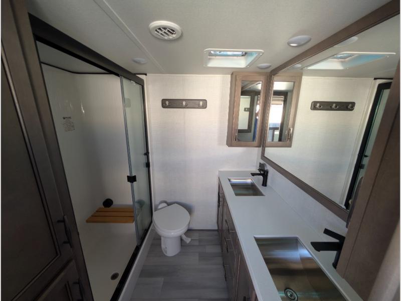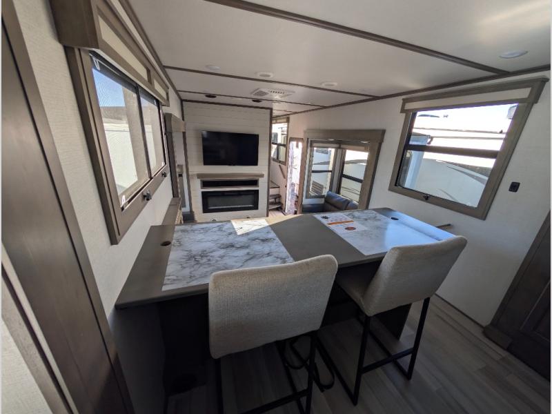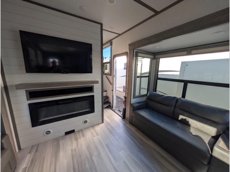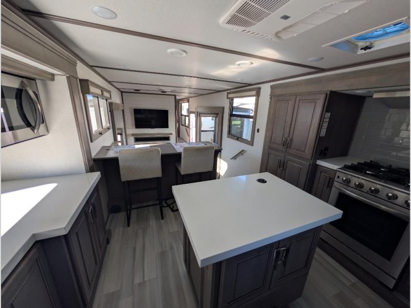 Enjoy each and every vacation, month-long trips, or even extended stays at an RV park in this spacious fifth wheel! The raised rear kitchen gives the cook plenty of room to whip up any type of meal using the stainless steel appliances including a 24" residential oven, an oversized pantry, and the raised bar top will provide you even more counter space on top of dining with two chairs that overlook the middle living area. Relaxing is made easy thanks to two tri-fold sofas and theatre seating while watching the big game on the LED Smart TV and enjoying the fireplace below. Dual sinks in the full bathroom allow two people to easily get ready at once, and the flip up teak seat in the shower is a nice convenience. At night, retire to your own queen bed which slides out to provide more floor space, and enjoy a show on the LED TV above the flip-top dresser once in bed.