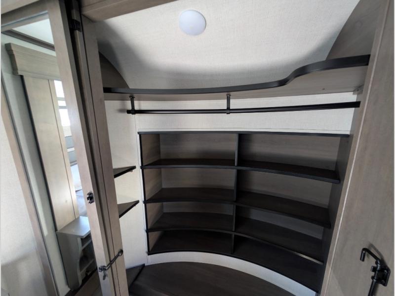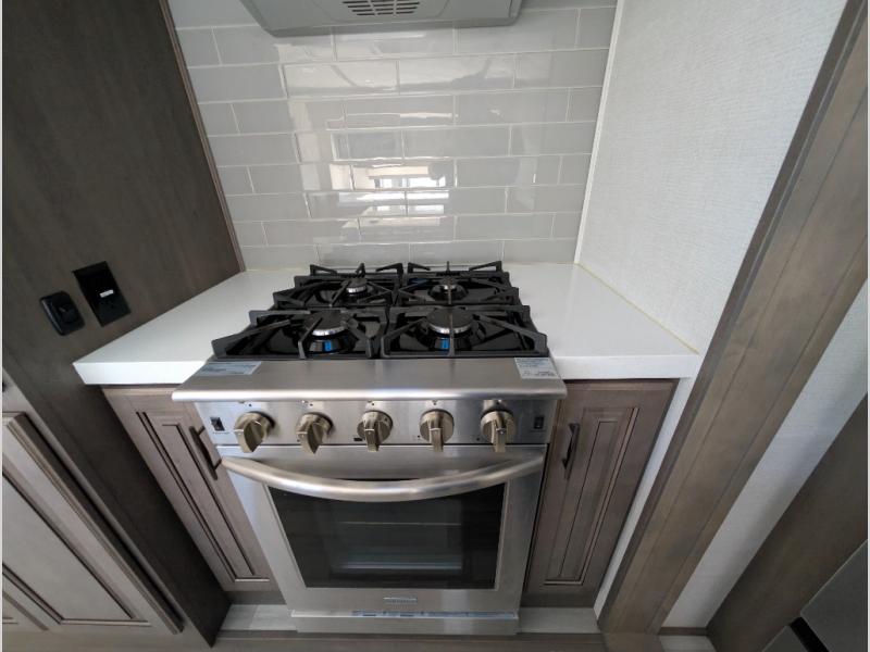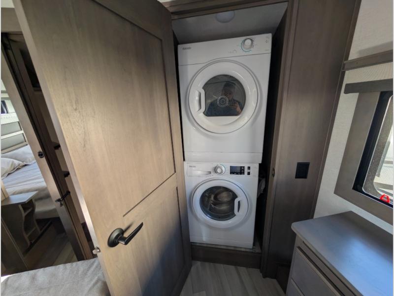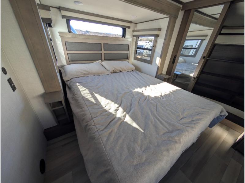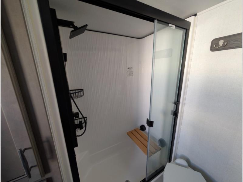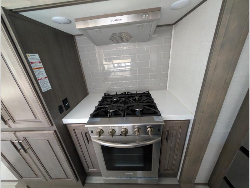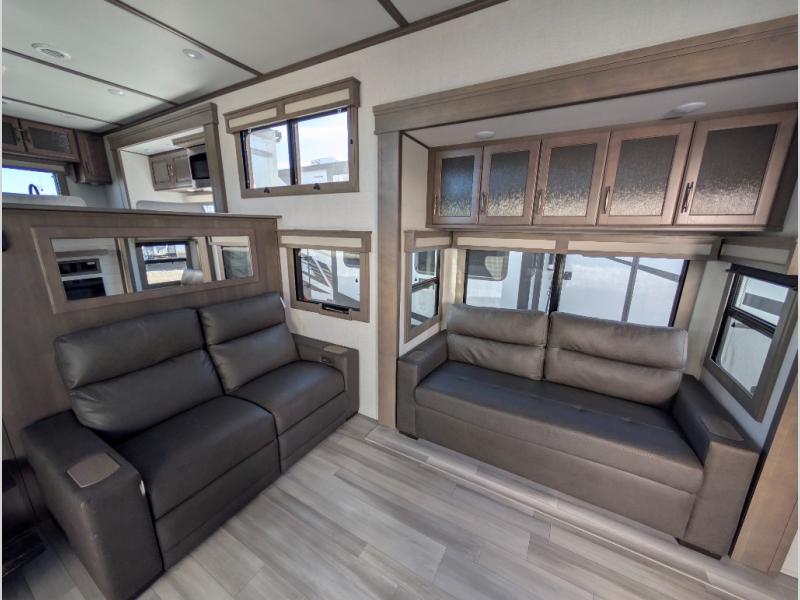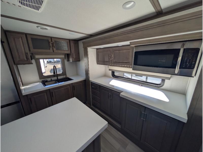 Enjoy each and every vacation, month-long trips, or even extended stays at an RV park in this spacious fifth wheel! The raised rear kitchen gives the cook plenty of room to whip up any type of meal using the stainless steel appliances including a 24" residential oven, an oversized pantry, and the raised bar top will provide you even more counter space on top of dining with two chairs that overlook the middle living area. Relaxing is made easy thanks to two tri-fold sofas and theatre seating while watching the big game on the LED Smart TV and enjoying the fireplace below. Dual sinks in the full bathroom allow two people to easily get ready at once, and the flip up teak seat in the shower is a nice convenience. At night, retire to your own queen bed which slides out to provide more floor space, and enjoy a show on the LED TV above the flip-top dresser once in bed.