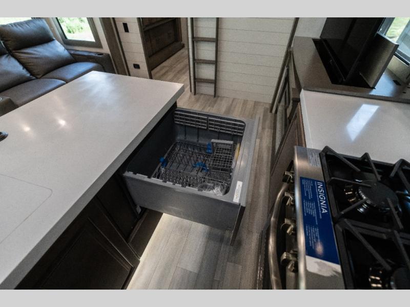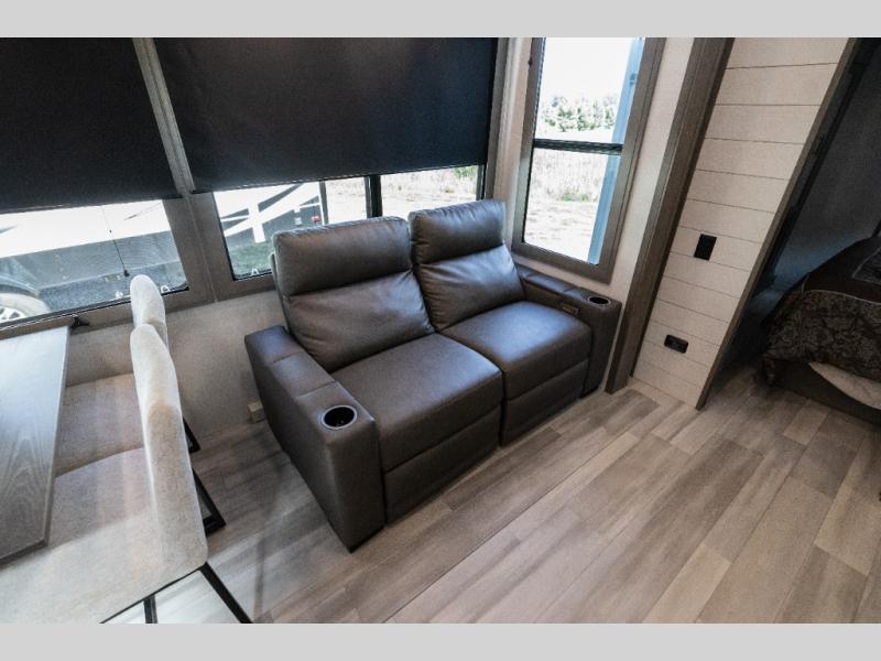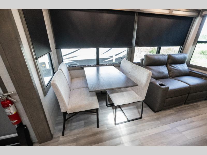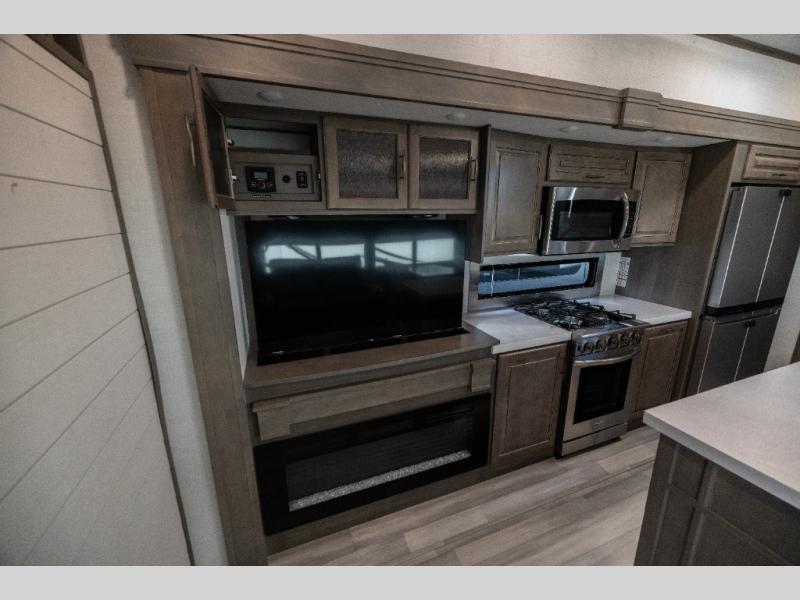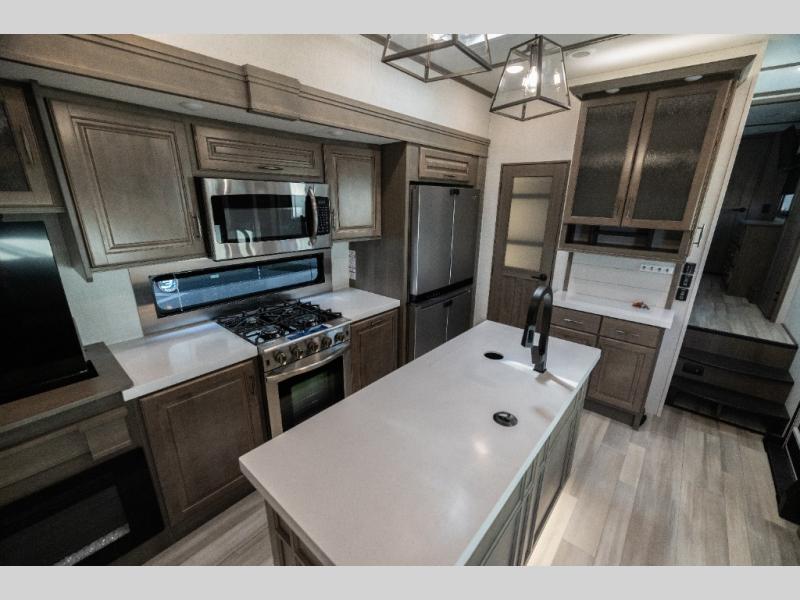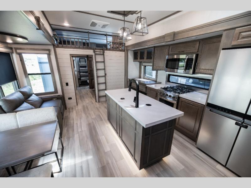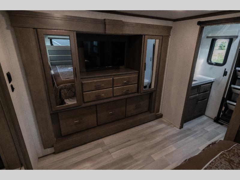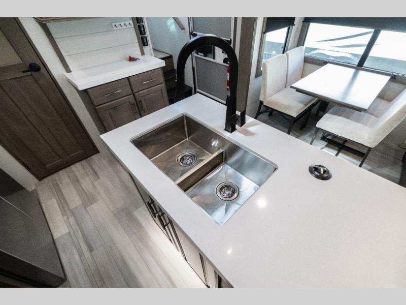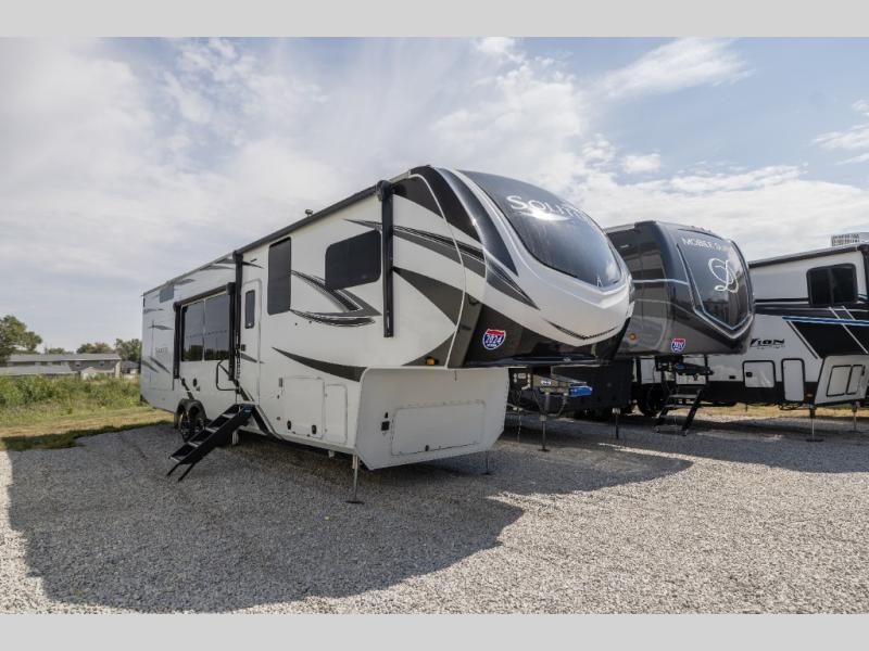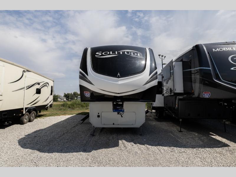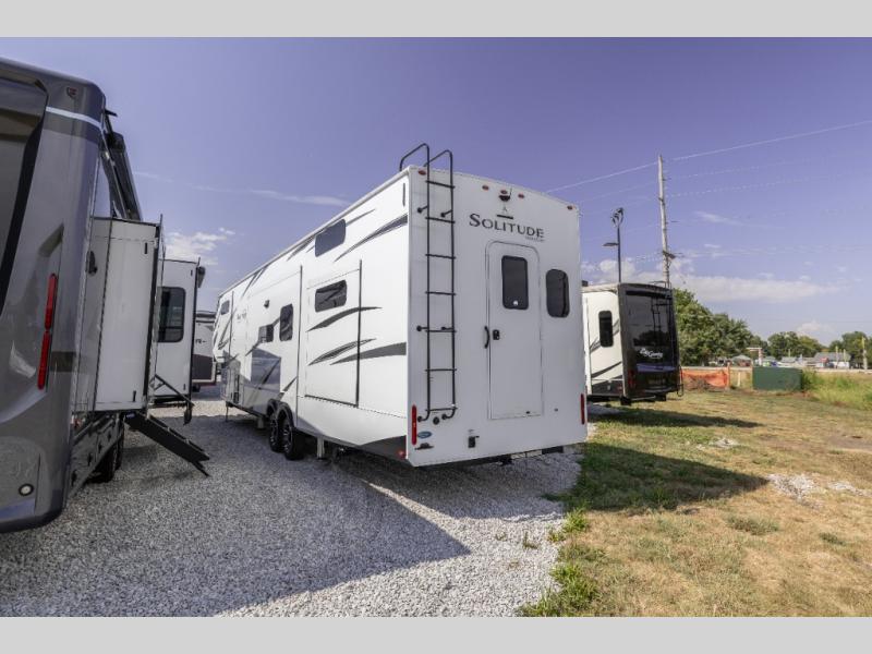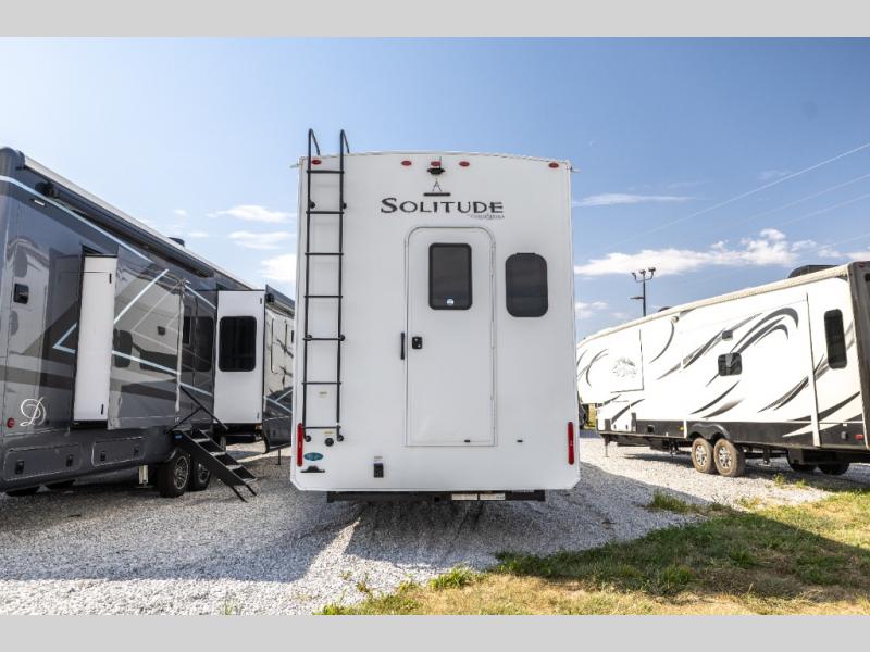 Each Solitude fifth wheel by Grand Design features a 101" wide-body construction, heavy duty 7,000 lb. axles, frameless tinted windows, and high-gloss gel coat sidewalls. You can camp year around thanks to the Weather-Tek Package that includes a 35K BTU high-capacity furnace, an all-in-one enclosed and heated utility center, and a fully enclosed underbelly with heated tanks and storage. Inside, you'll love the premium roller shades, hardwood cabinet doors, solid surface countertops and sinks, plus residential finishes throughout to make you truly feel at home. Each model also includes a MORryde CRE3000 suspension system, self adjusting brakes, and a MORryde pin box that will provide smooth towing from home to campground. Affordable luxury is possible with the Solitude fifth wheels; choose yours today!