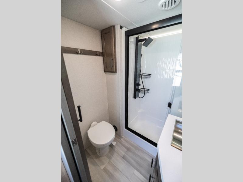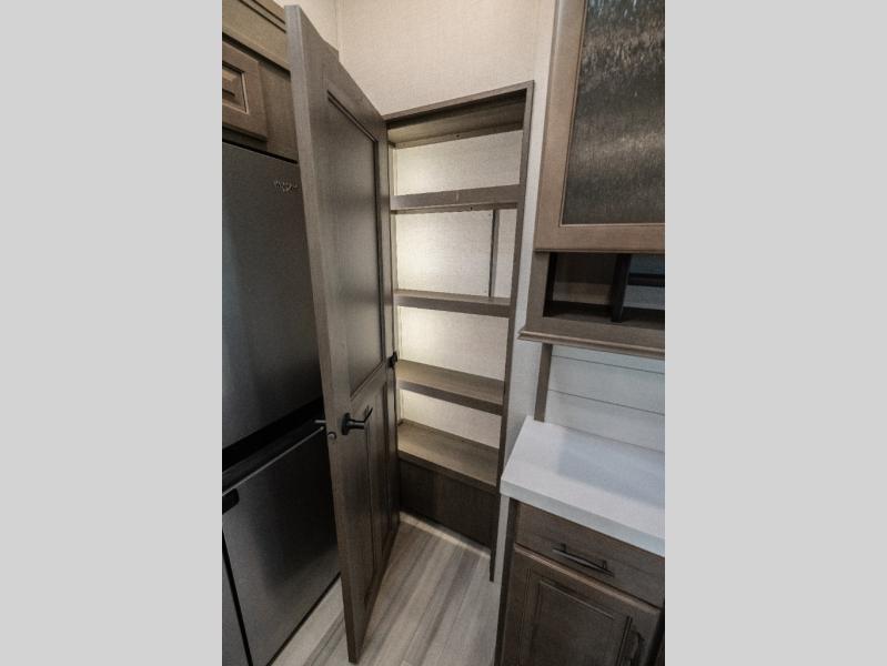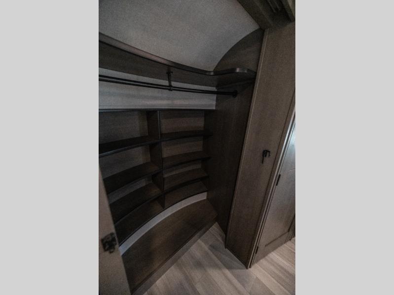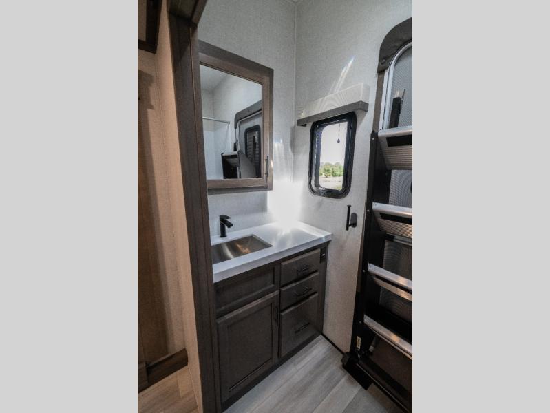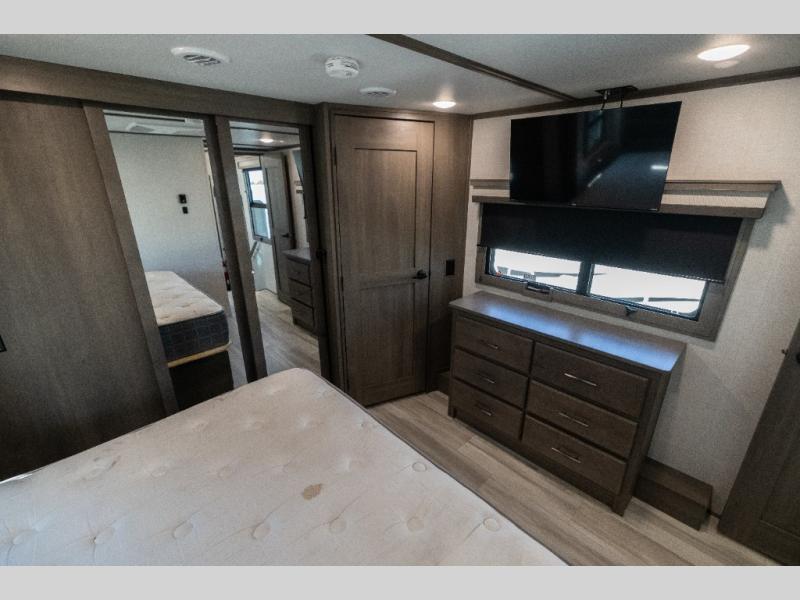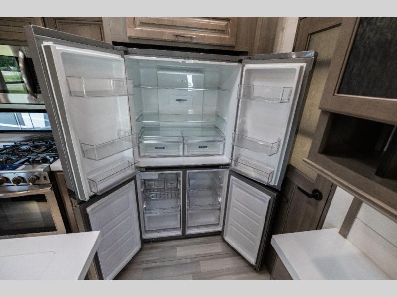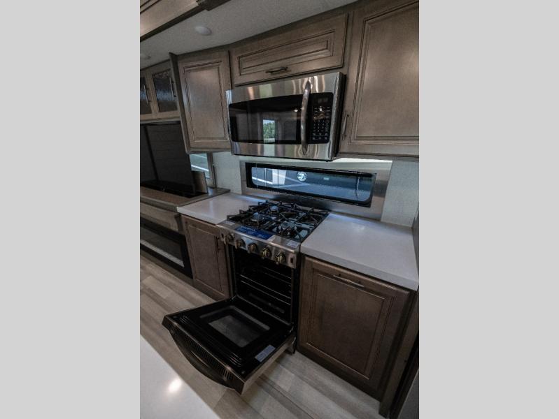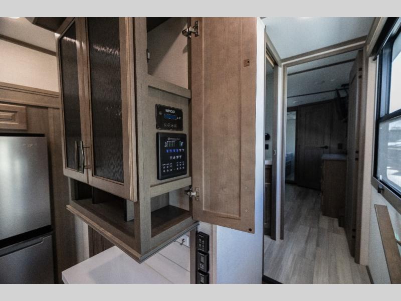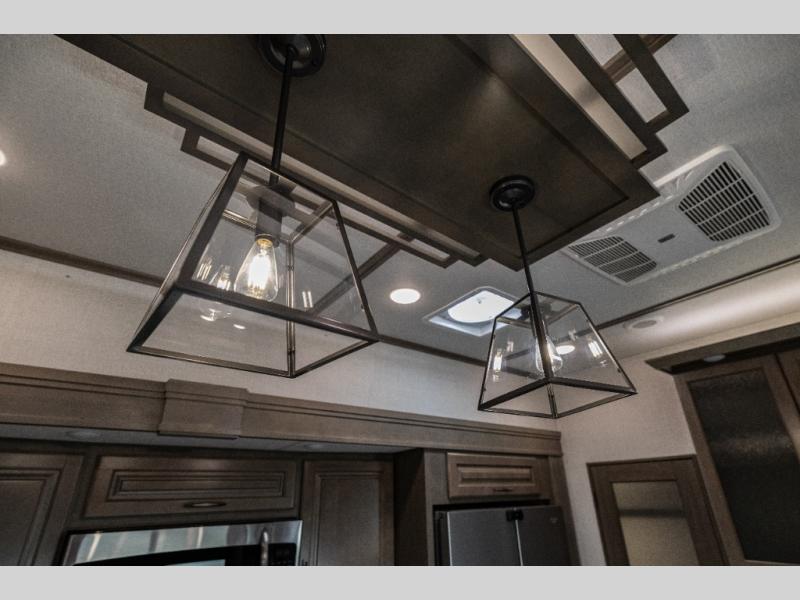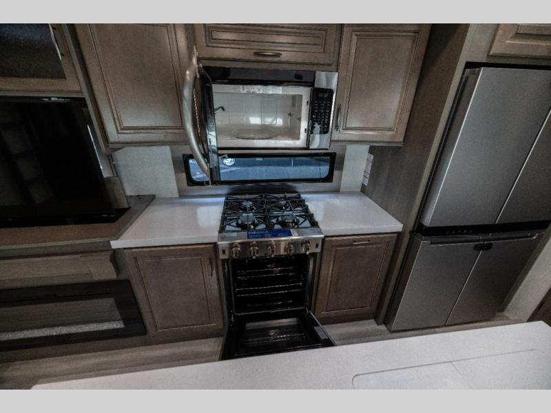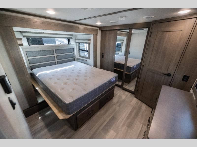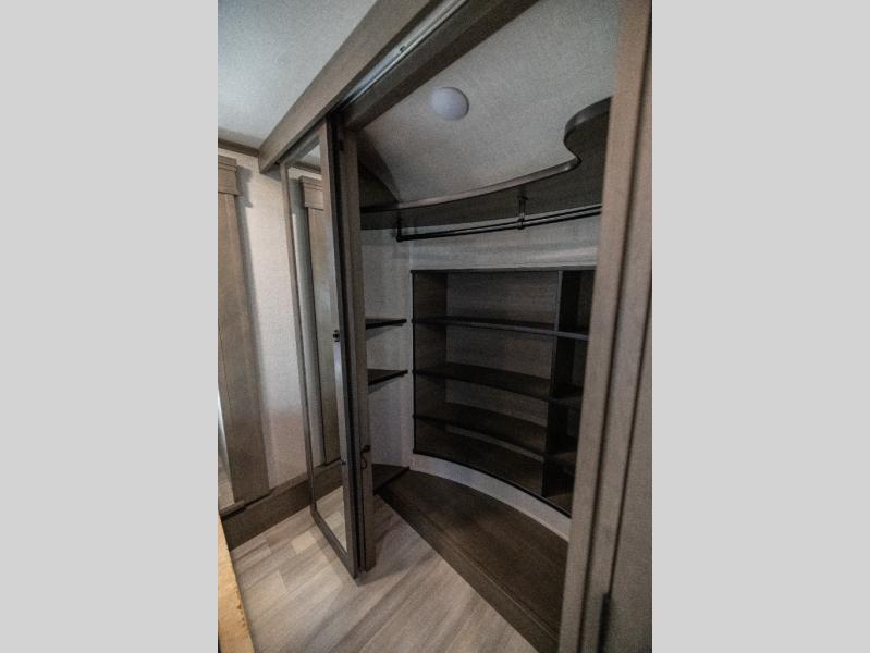 Each Solitude fifth wheel by Grand Design features a 101" wide-body construction, heavy duty 7,000 lb. axles, frameless tinted windows, and high-gloss gel coat sidewalls. You can camp year around thanks to the Weather-Tek Package that includes a 35K BTU high-capacity furnace, an all-in-one enclosed and heated utility center, and a fully enclosed underbelly with heated tanks and storage. Inside, you'll love the premium roller shades, hardwood cabinet doors, solid surface countertops and sinks, plus residential finishes throughout to make you truly feel at home. Each model also includes a MORryde CRE3000 suspension system, self adjusting brakes, and a MORryde pin box that will provide smooth towing from home to campground. Affordable luxury is possible with the Solitude fifth wheels; choose yours today!