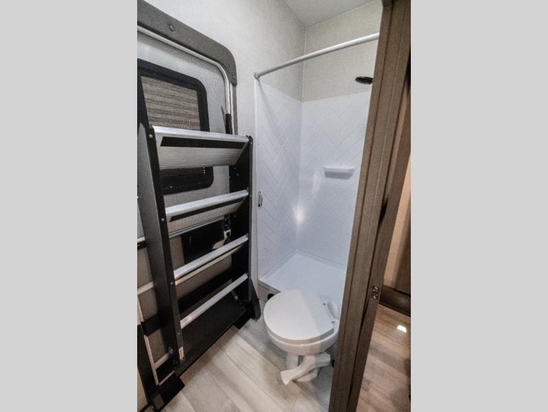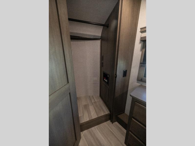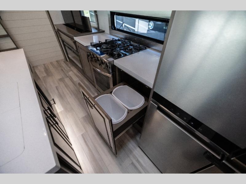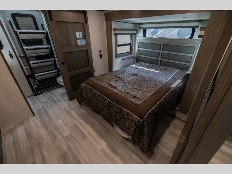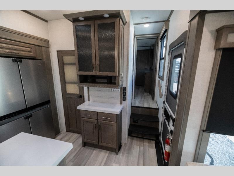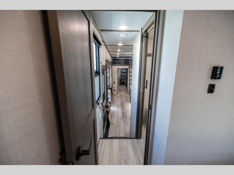 For an affordable luxury extended stay for your family, this Solitude is it! Two private bedrooms plus an overhead Sky Suite loft above the rear bedroom which also has it's own private rear entry/exit door is just the beginning of what is in store for your camping convenience. You will love the spacious feel that the Solitude provides with taller ceilings, larger scenic windows, and an interior width of 8' 5", not to mention FIVE slides in this unit alone. You may not even want to go home once you get a look inside. The upscale kitchen features an island with dishwasher prep, a large single bowl sink, a 12V 20 cu. ft. refrigerator for your perishables, and a 24" residential oven, not to mention you will also enjoy a microwave, pantry, and hutch for your dishes, plus a free standing dinette! You can easily take along extra family and friends with the second private bedroom featuring it's own private bath and entry which is great for another couple, and there is even loft space above this rear private bedroom for added storage or sleeping for children. Both bathrooms feature a shower with a skylight, vanity and sink, plus a toilet. And, you will find ample storage for clothing and belongings throughout with nice size closets, overhead cabinets, plus loads of outside storage. Speaking of outside, this unit features a spray port for rinsing off before heading inside, two awnings, a USB charging outlet, and four step aluminum shock assist entry steps at both entrances.