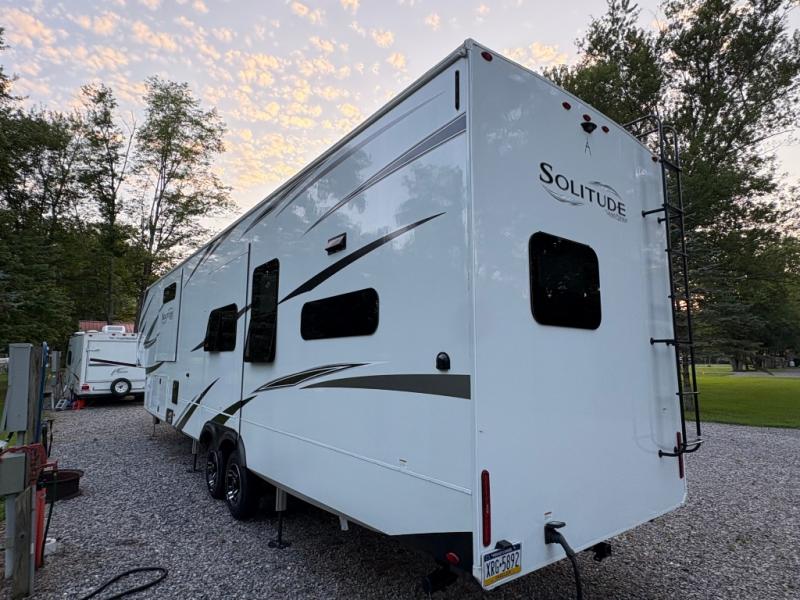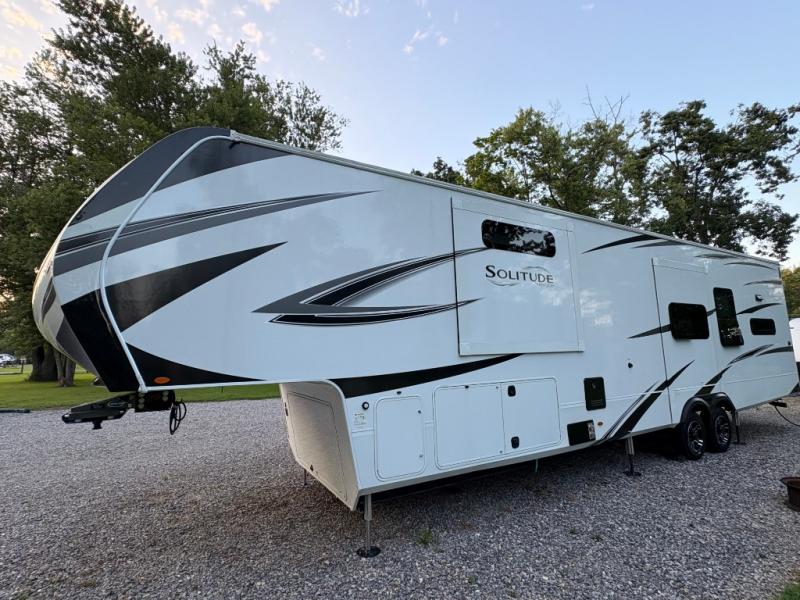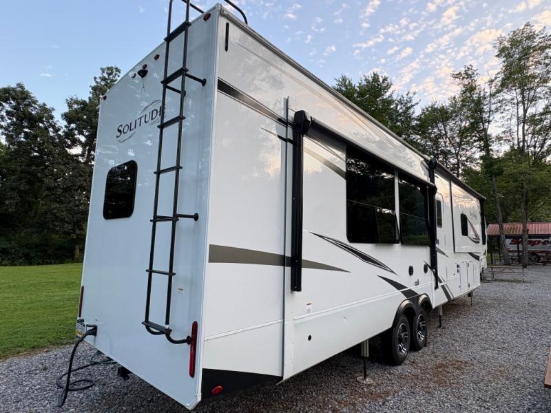 Each Solitude fifth wheel by Grand Design features a 101" wide-body construction, heavy duty 7,000 lb. axles, frameless tinted windows, and high-gloss gel coat sidewalls. You can camp year around thanks to the Weather-Tek Package that includes a 35K BTU high-capacity furnace, an all-in-one enclosed and heated utility center, and a fully enclosed underbelly with heated tanks and storage. Inside, you'll love the premium roller shades, hardwood cabinet doors, solid surface countertops and sinks, plus residential finishes throughout to make you truly feel at home. Each model also includes a MORryde CRE3000 suspension system, self adjusting brakes, and a MORryde pin box that will provide smooth towing from home to campground. Affordable luxury is possible with the Solitude fifth wheels; choose yours today!