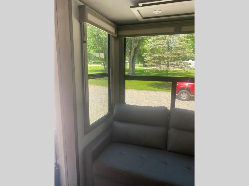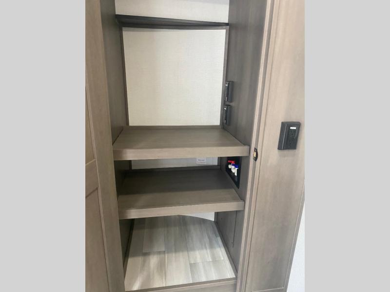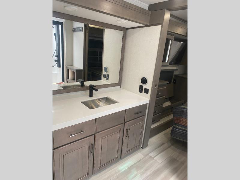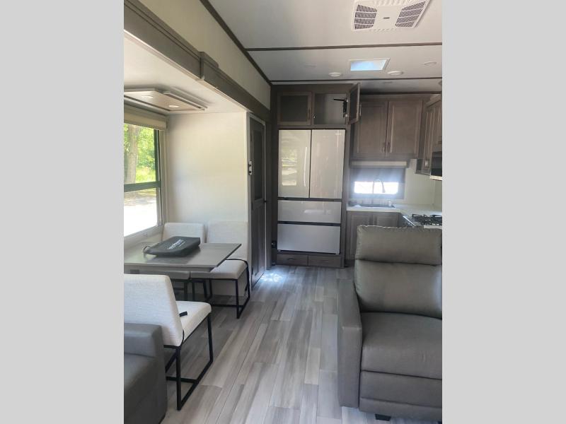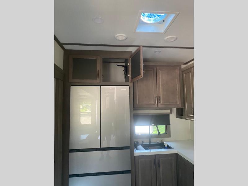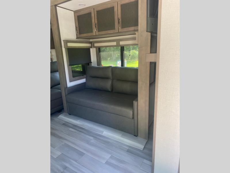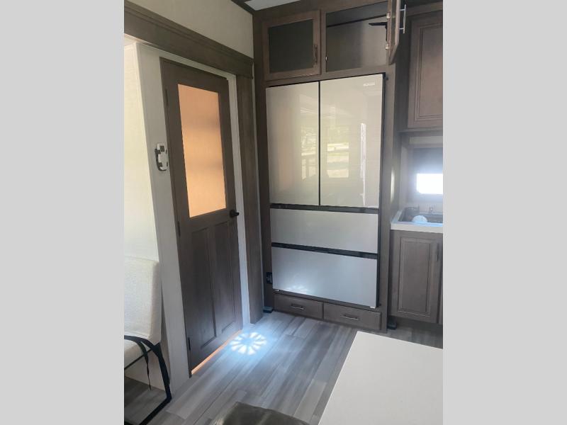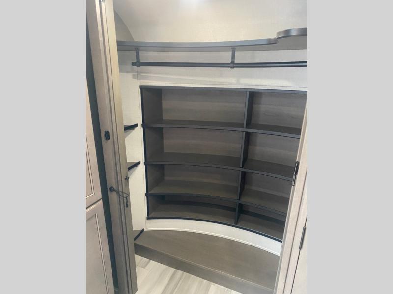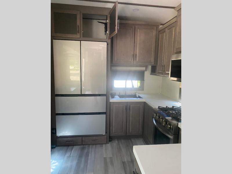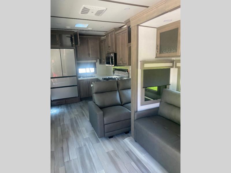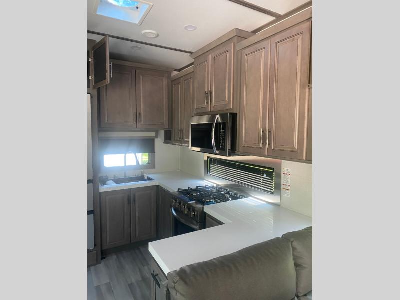 Comfort will come easy in this four slide out fifth wheel! You will feel right at home with a master bedroom that includes a queen bed slide out (king bed optional), dual dressers with a seat in between, plus a large front bath with tons of space. The convenient half bath is right as you enter the unit, and there is even shoe storage to keep your space tidy. Your crew can get cozy on the dual tri-fold sofas within dual opposing slides, or on the theater seating across from the LED TV and fireplace. One feature you will love about this fifth wheel is the rear kitchen with wrap-around counter space, a 24" residential oven, plus a 10 cu. ft. 12V refrigerator and a large pantry to keep food fresh.