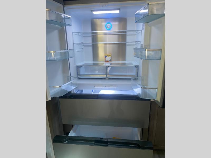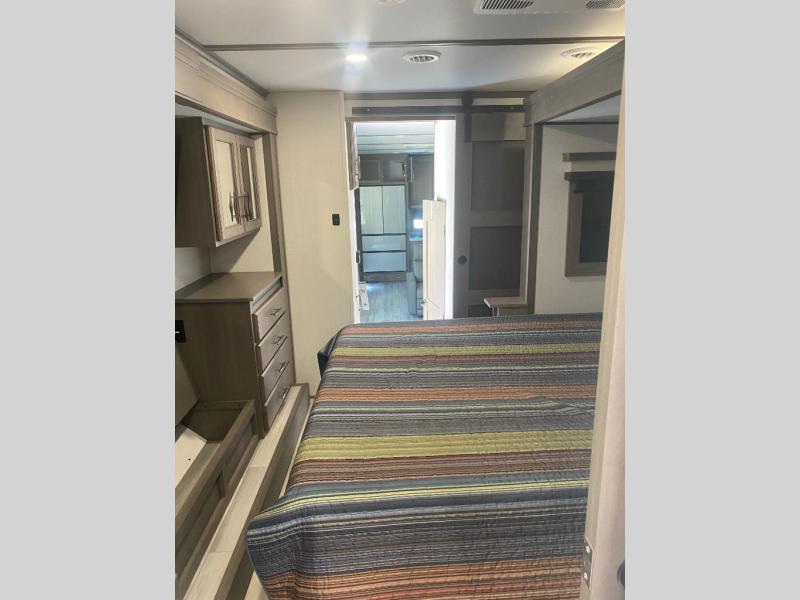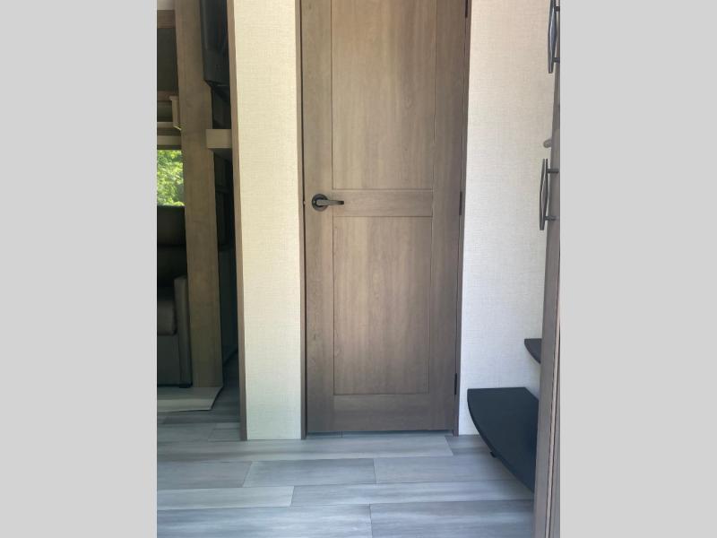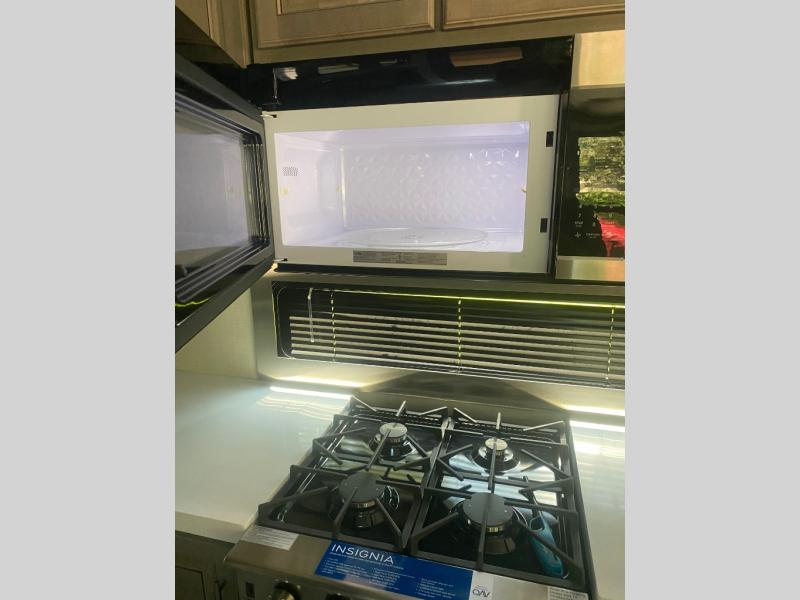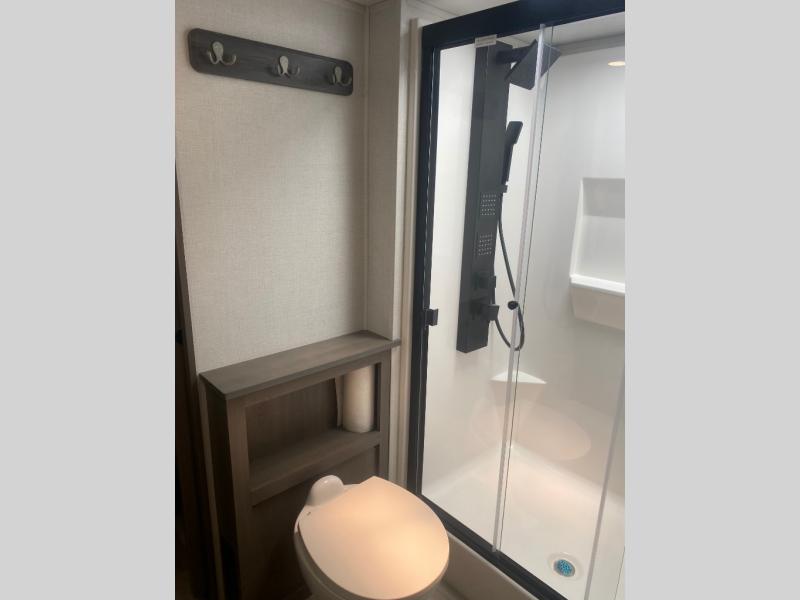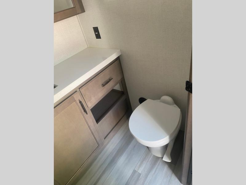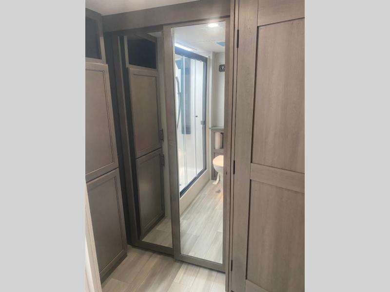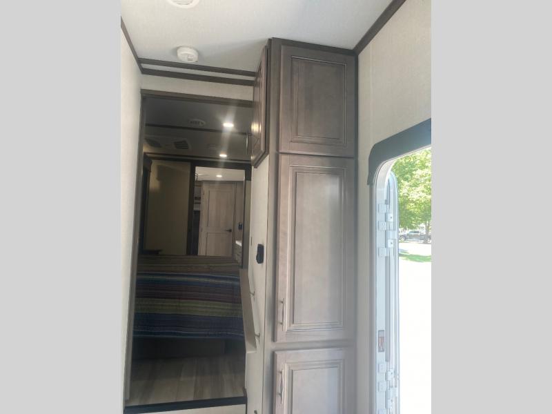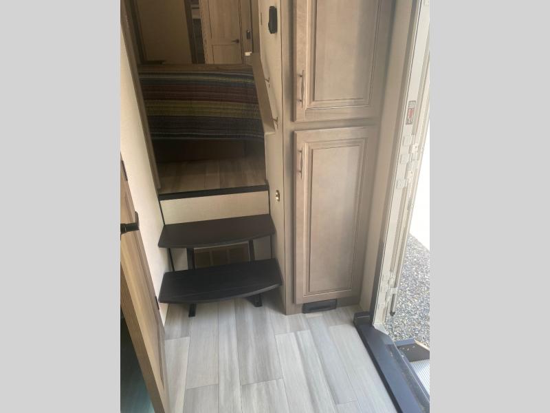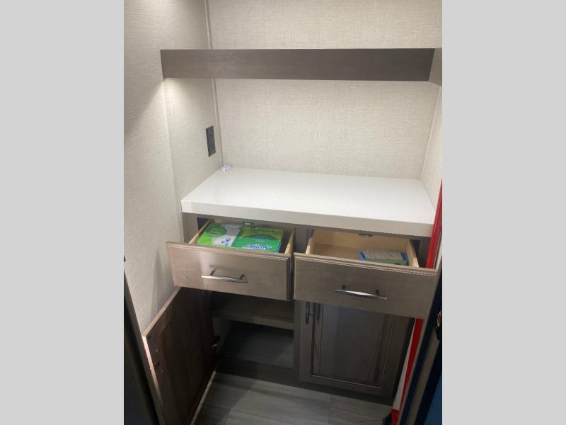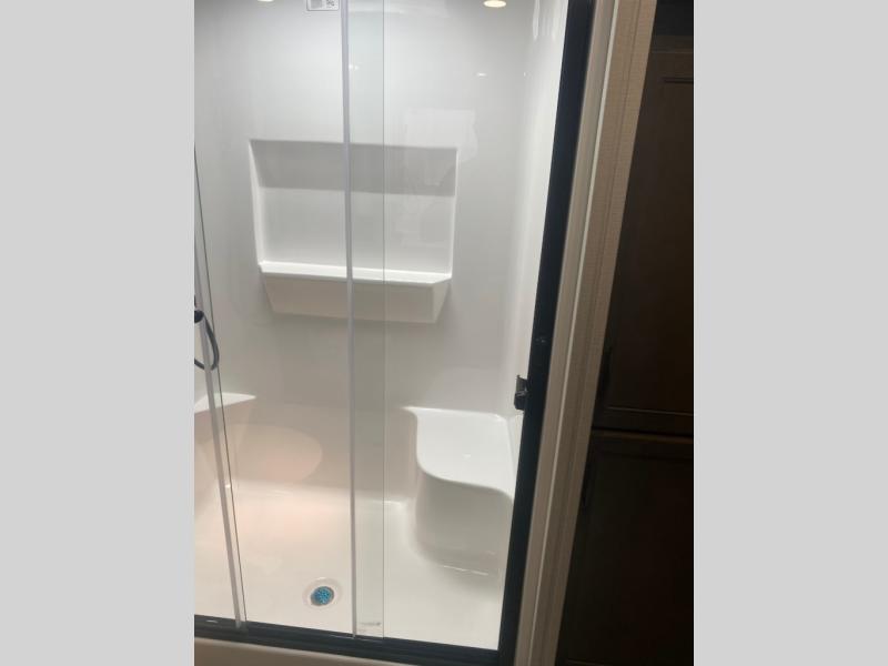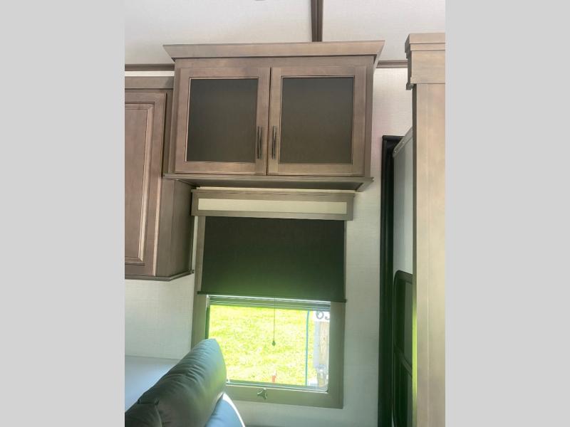 Comfort will come easy in this four slide out fifth wheel! You will feel right at home with a master bedroom that includes a queen bed slide out (king bed optional), dual dressers with a seat in between, plus a large front bath with tons of space. The convenient half bath is right as you enter the unit, and there is even shoe storage to keep your space tidy. Your crew can get cozy on the dual tri-fold sofas within dual opposing slides, or on the theater seating across from the LED TV and fireplace. One feature you will love about this fifth wheel is the rear kitchen with wrap-around counter space, a 24" residential oven, plus a 10 cu. ft. 12V refrigerator and a large pantry to keep food fresh.