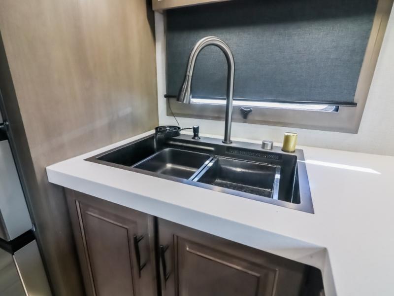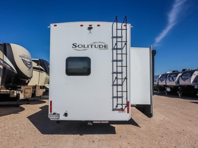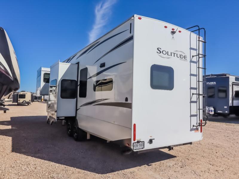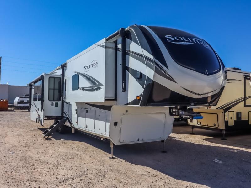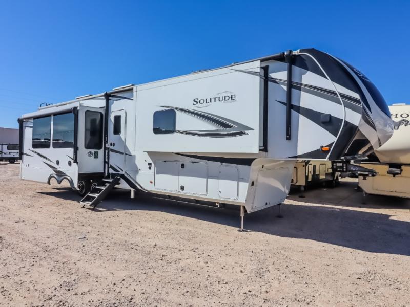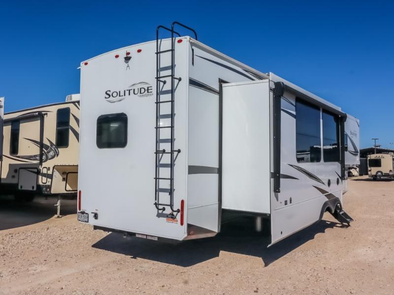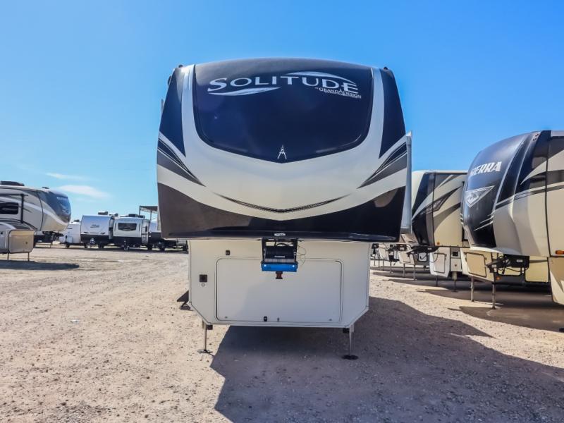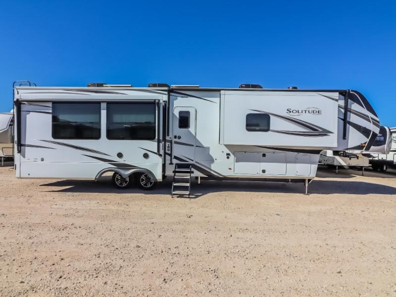 Each Solitude fifth wheel by Grand Design features a 101" wide-body construction, heavy duty 7,000 lb. axles, frameless tinted windows, and high-gloss gel coat sidewalls. You can camp year around thanks to the Weather-Tek Package that includes a 35K BTU high-capacity furnace, an all-in-one enclosed and heated utility center, and a fully enclosed underbelly with heated tanks and storage. Inside, you'll love the premium roller shades, hardwood cabinet doors, solid surface countertops and sinks, plus residential finishes throughout to make you truly feel at home. Each model also includes a MORryde CRE3000 suspension system, self adjusting brakes, and a MORryde pin box that will provide smooth towing from home to campground. Affordable luxury is possible with the Solitude fifth wheels; choose yours today!