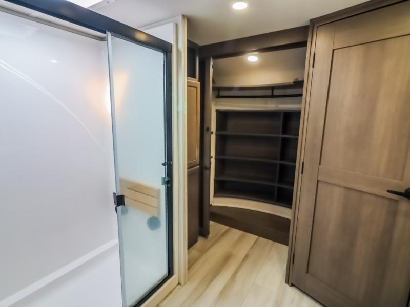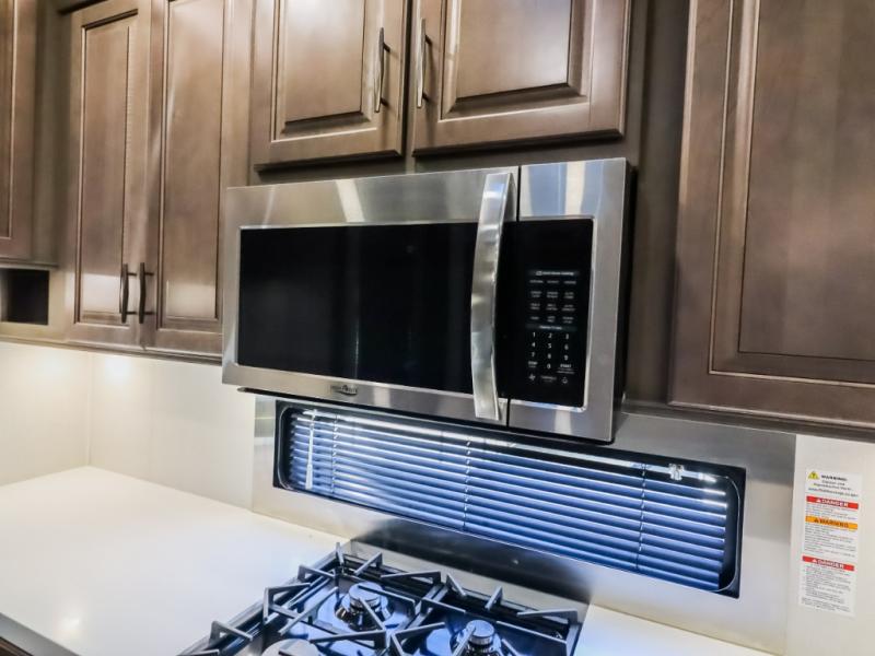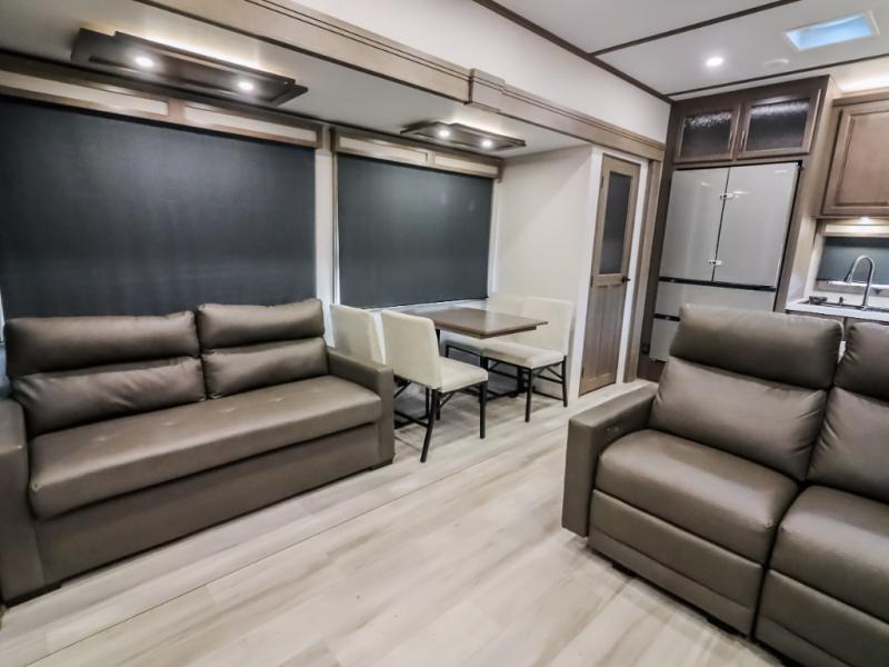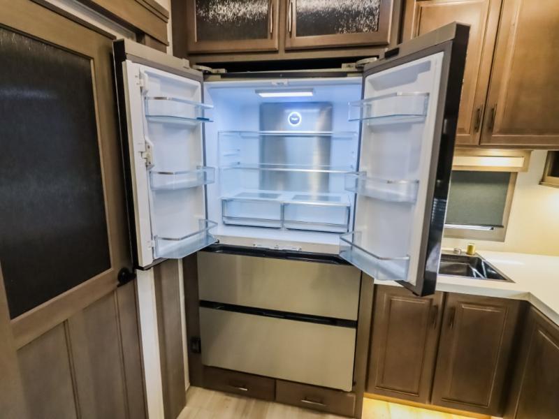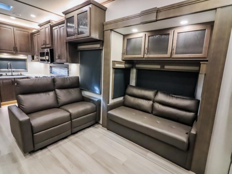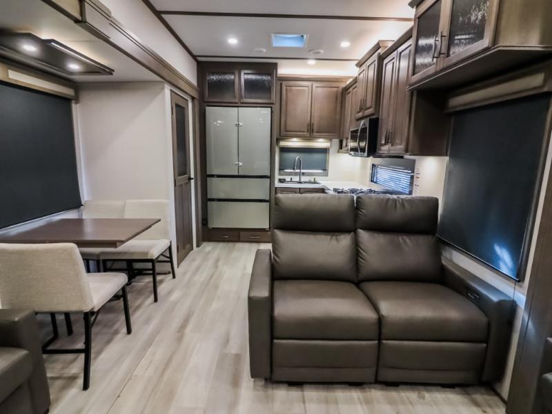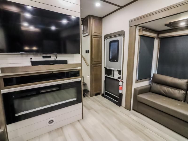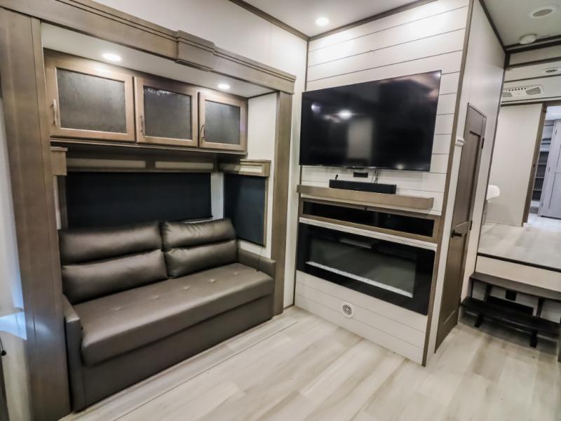 Comfort will come easy in this four slide out fifth wheel! You will feel right at home with a master bedroom that includes a queen bed slide out (king bed optional), dual dressers with a seat in between, plus a large front bath with tons of space. The convenient half bath is right as you enter the unit, and there is even shoe storage to keep your space tidy. Your crew can get cozy on the dual tri-fold sofas within dual opposing slides, or on the theater seating across from the LED TV and fireplace. One feature you will love about this fifth wheel is the rear kitchen with wrap-around counter space, a 24" residential oven, plus a 10 cu. ft. 12V refrigerator and a large pantry to keep food fresh.