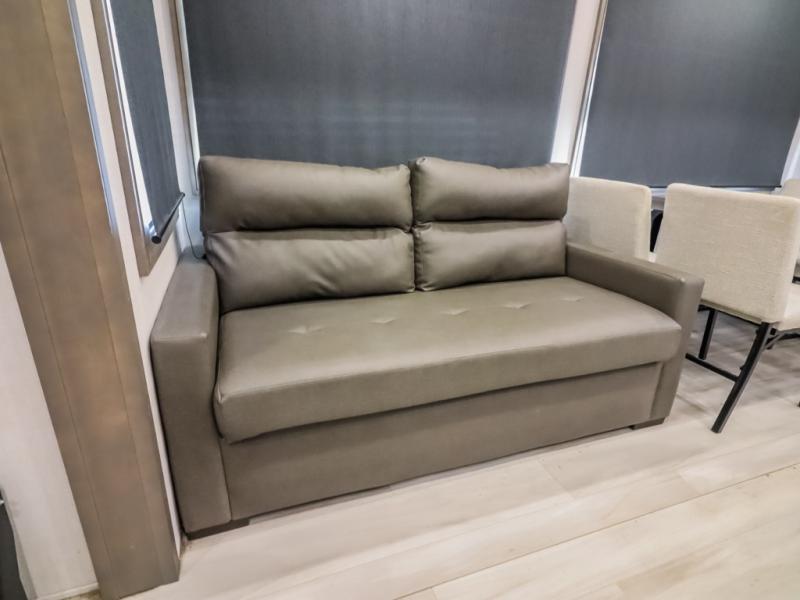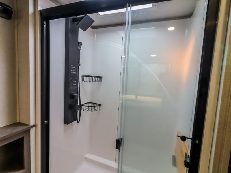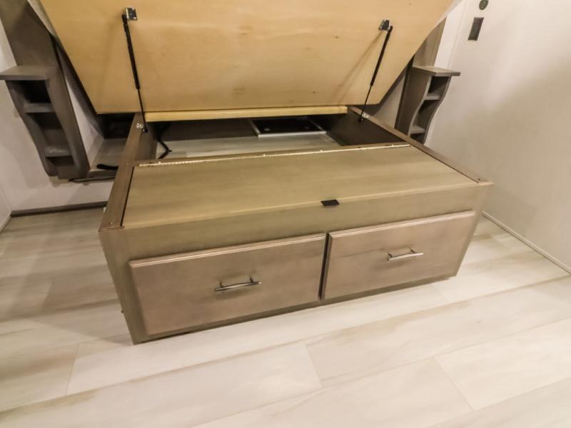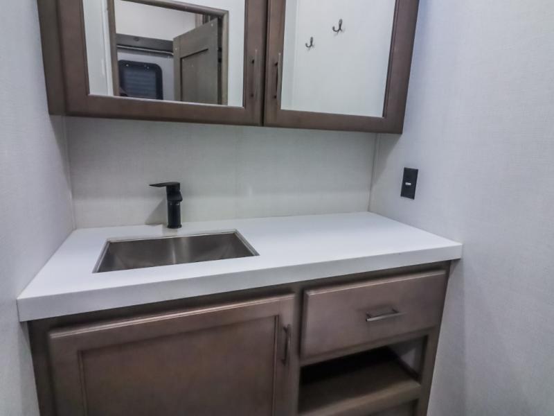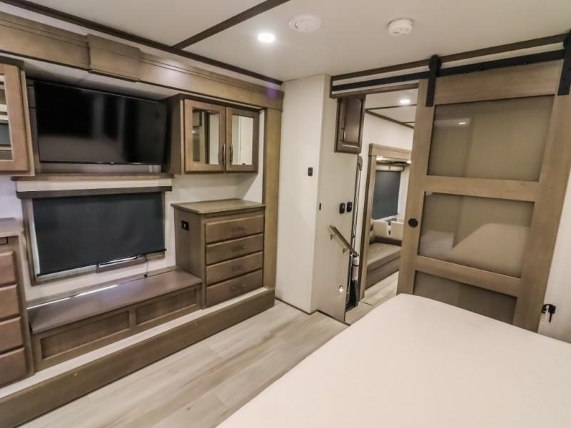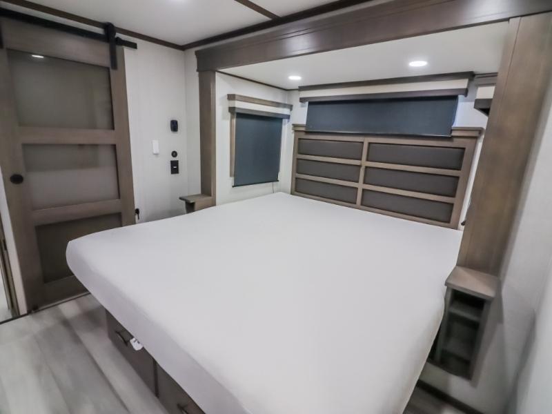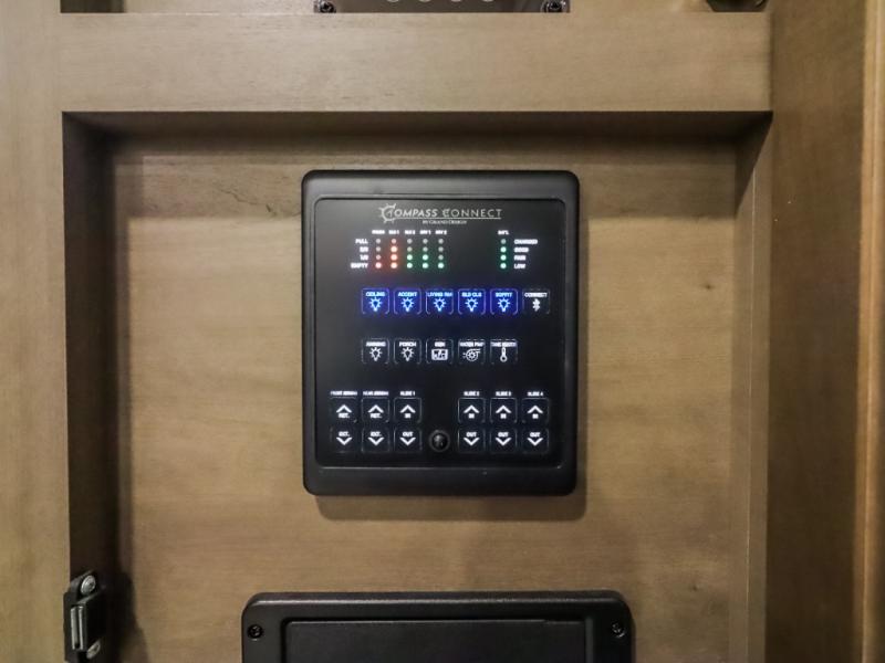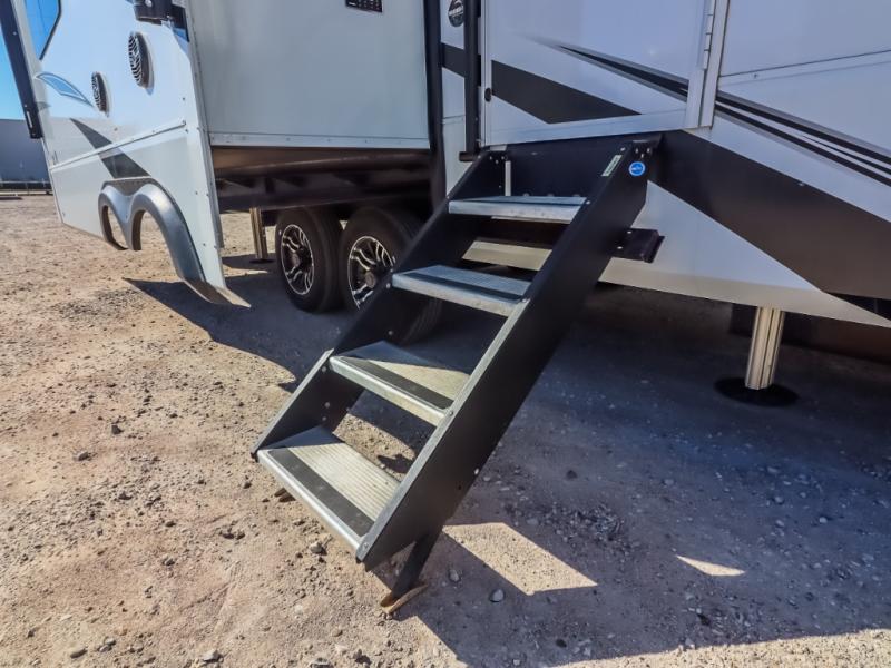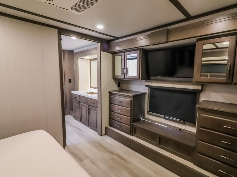 Comfort will come easy in this four slide out fifth wheel! You will feel right at home with a master bedroom that includes a queen bed slide out (king bed optional), dual dressers with a seat in between, plus a large front bath with tons of space. The convenient half bath is right as you enter the unit, and there is even shoe storage to keep your space tidy. Your crew can get cozy on the dual tri-fold sofas within dual opposing slides, or on the theater seating across from the LED TV and fireplace. One feature you will love about this fifth wheel is the rear kitchen with wrap-around counter space, a 24" residential oven, plus a 10 cu. ft. 12V refrigerator and a large pantry to keep food fresh.