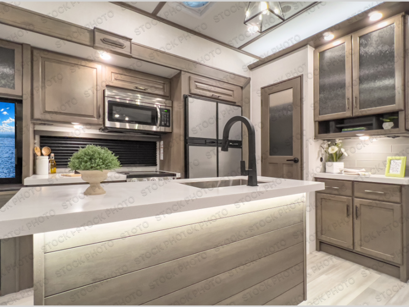 With any Solitude S-Class fifth wheel by Grand Design you will appreciate the Max Built Construction Package that features a 101" wide-body, gel coat exterior sidewalls, heavy-duty 7,000 lb. axles, plus many more durable construction materials. The self-adjusting brakes and the MORryde CRE3000 suspension system will provide a smooth towing experience, and each model includes heavy duty 17.5" H-rated tires with NitroFill. Some of the features you are sure to love are included in the Residential Living Package, like the solid surface countertops and sink covers, the hardwood cabinet doors, the night stands with USB ports, and the Rockford Fosgate stereo entertainment system with HDMI and App controls. These fifth wheels are extended-stay approved thanks to the Weather-Tek Package with a 35,000 BTU high-capacity furnace, the Stealth A/C system, and many high-end residential finishes to make you feel like you taken home with you!