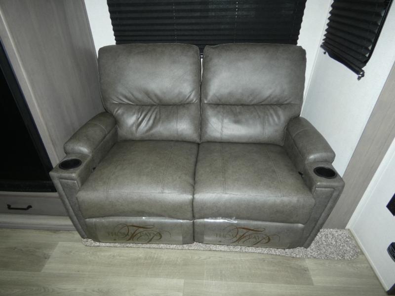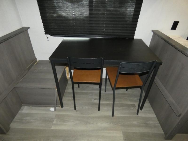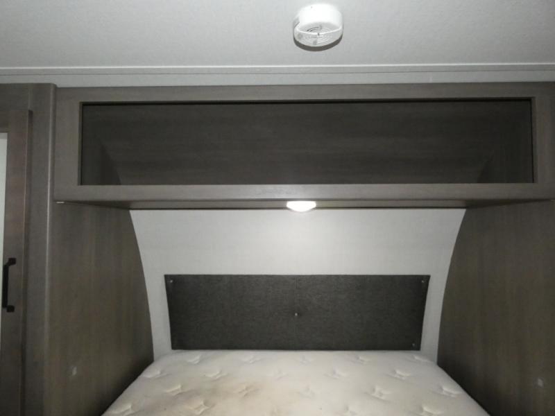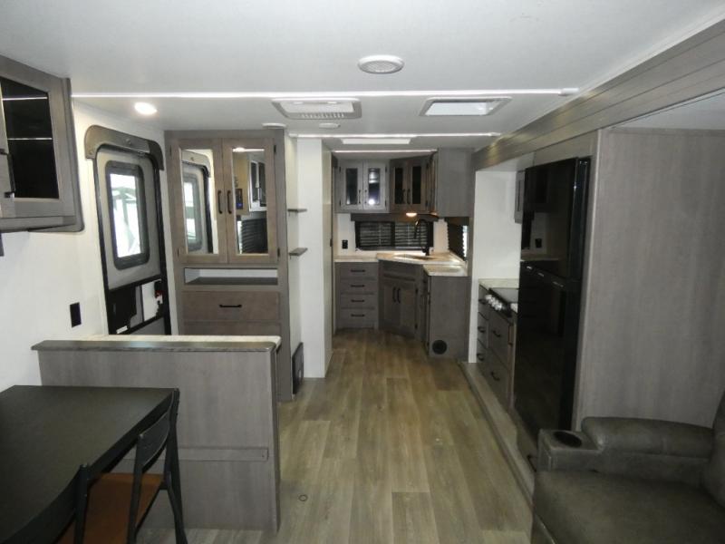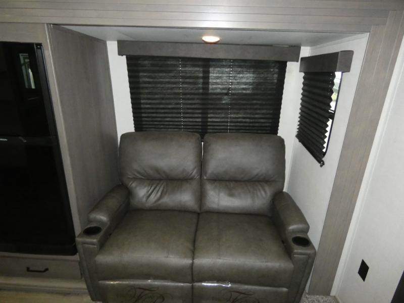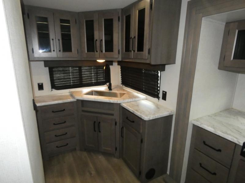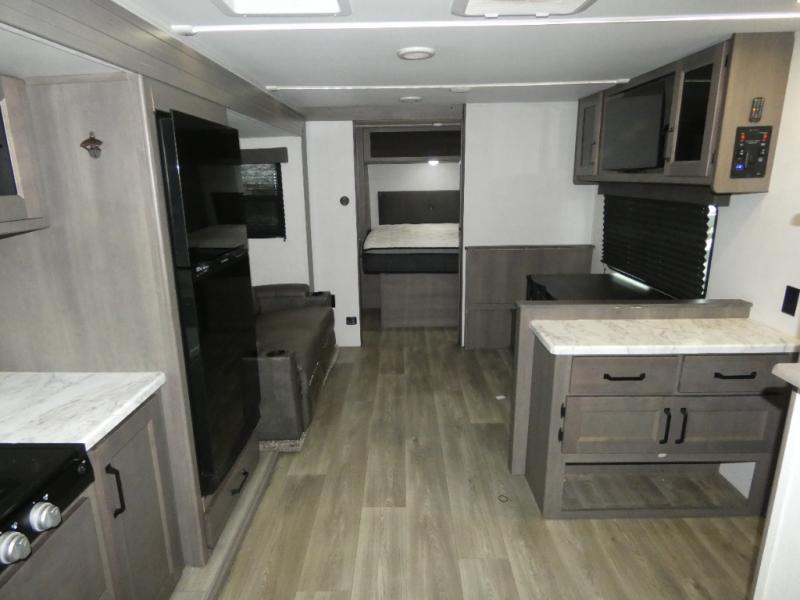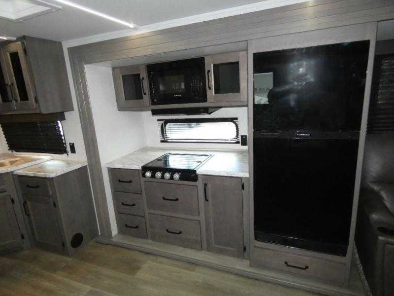 Relaxing weekends to the lake just got sweeter in this spacious travel trailer. Prepare lunch on the three-burner cooktop, and you can enjoy it at the booth dinette. There is also a 60" sleeper sofa, or you can choose the optional theater seating in place of the sofa if you don't need the extra sleeping space. This model includes plenty of storage space, including a pantry/wardrobe just as you enter the unit, overhead compartments, and even a pet dish for food and water!