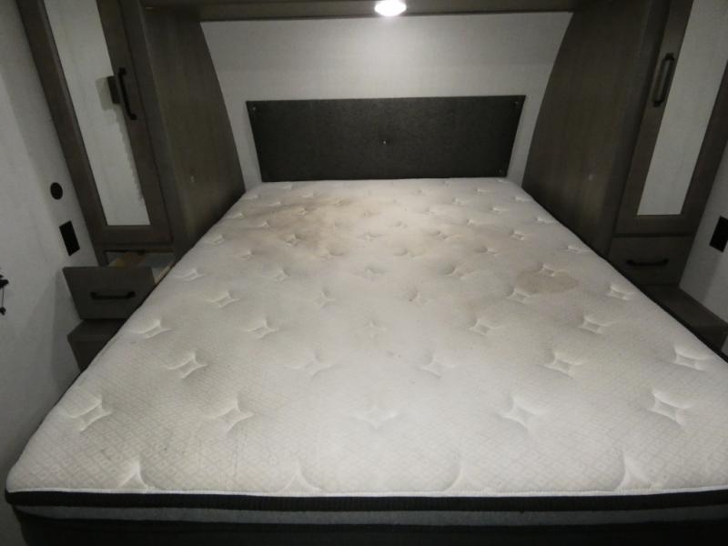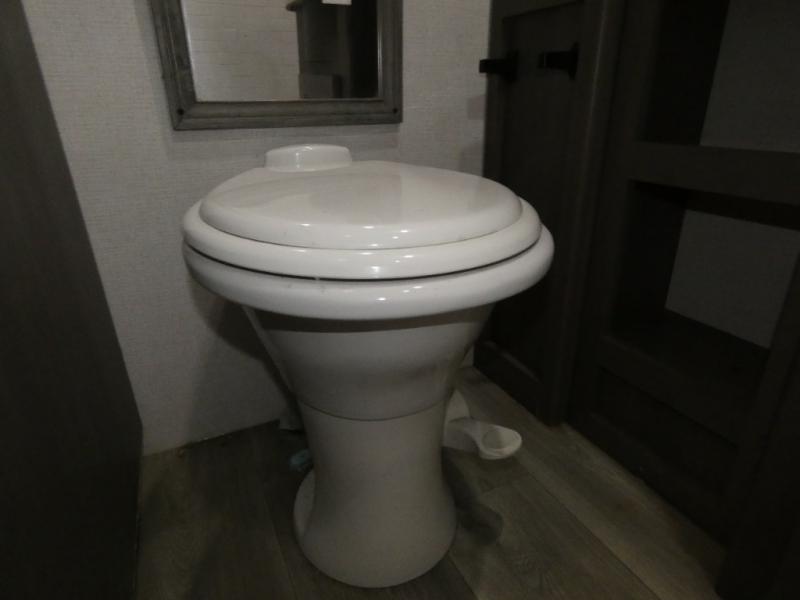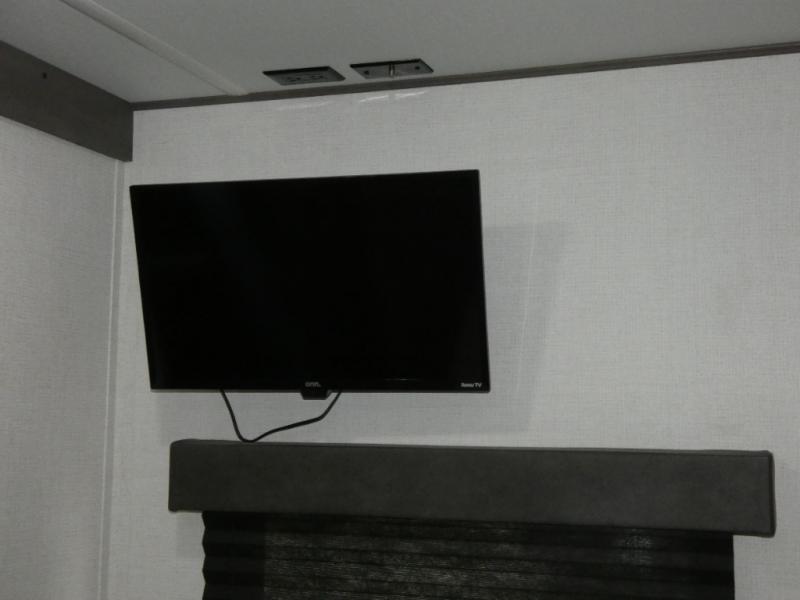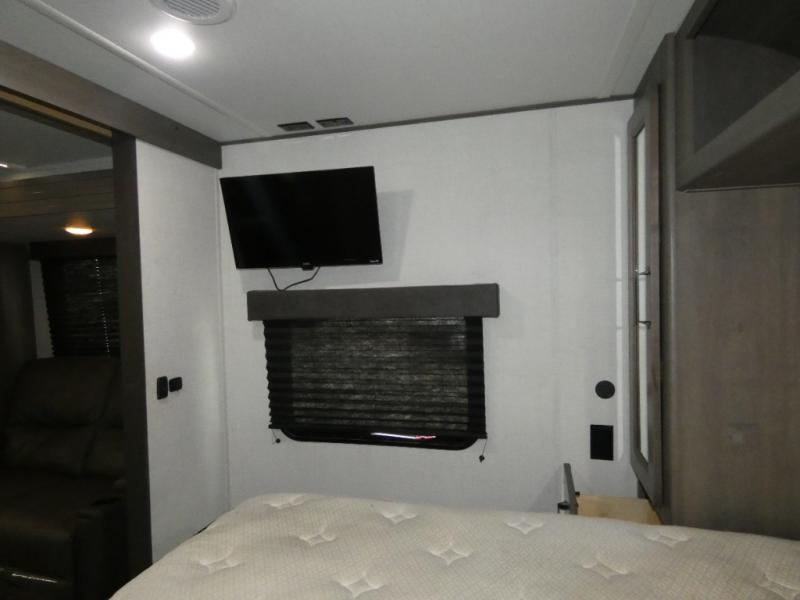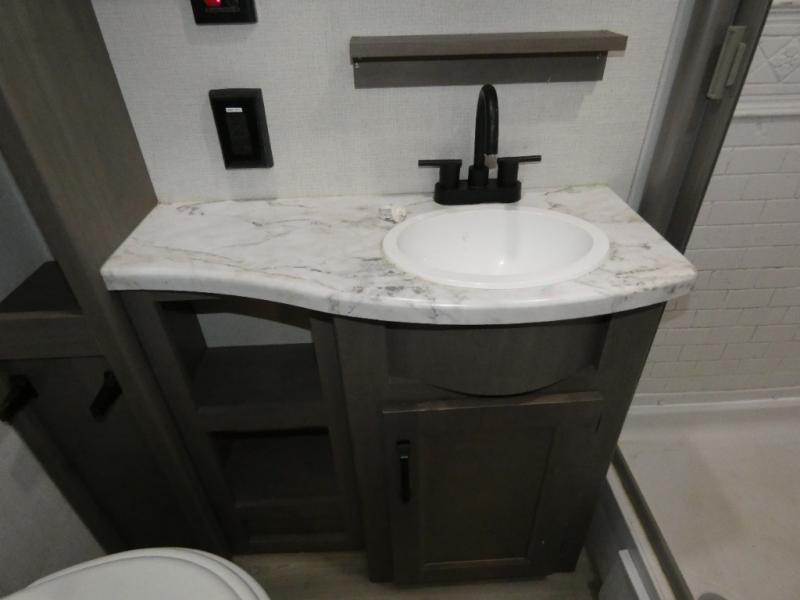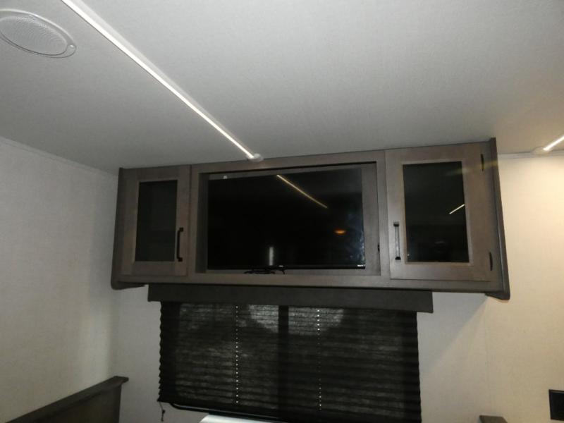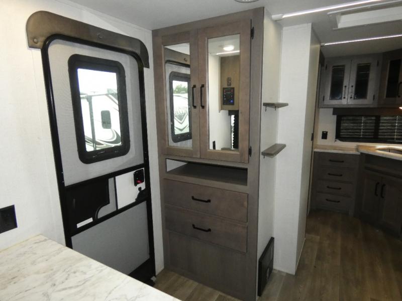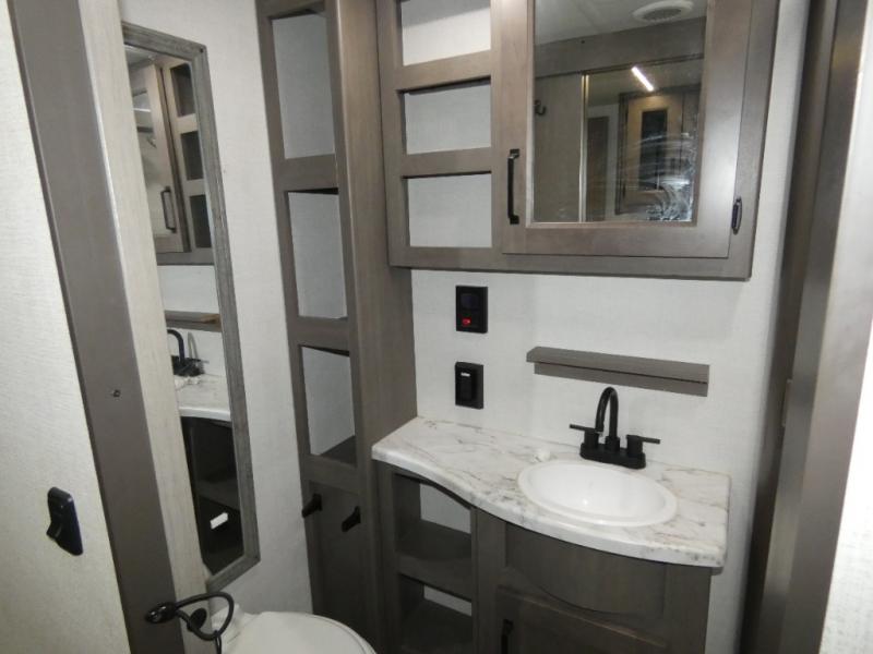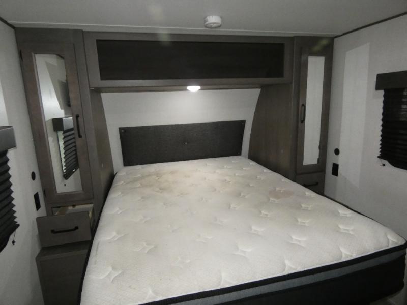 Relaxing weekends to the lake just got sweeter in this spacious travel trailer. Prepare lunch on the three-burner cooktop, and you can enjoy it at the booth dinette. There is also a 60" sleeper sofa, or you can choose the optional theater seating in place of the sofa if you don't need the extra sleeping space. This model includes plenty of storage space, including a pantry/wardrobe just as you enter the unit, overhead compartments, and even a pet dish for food and water!