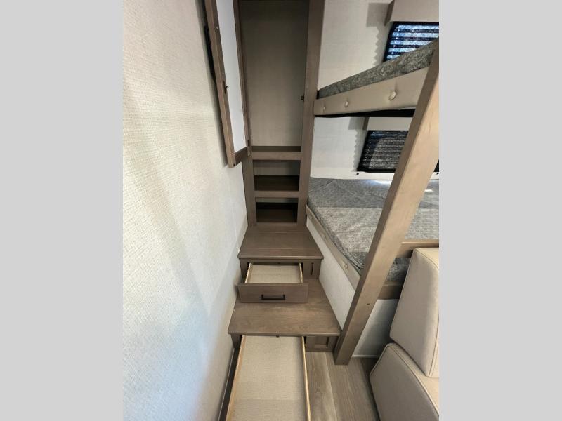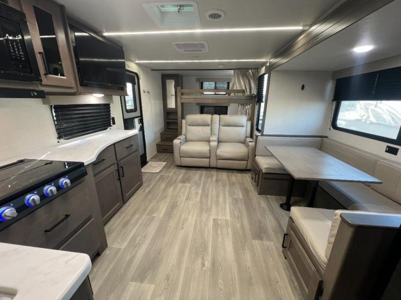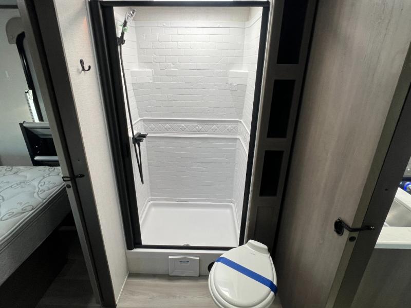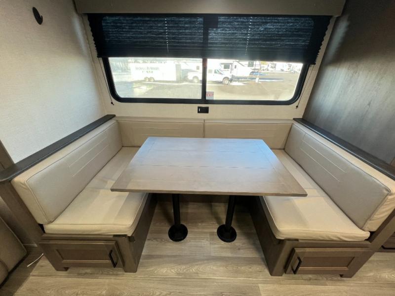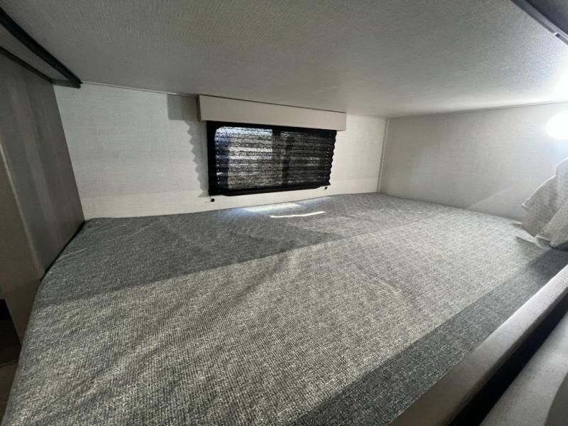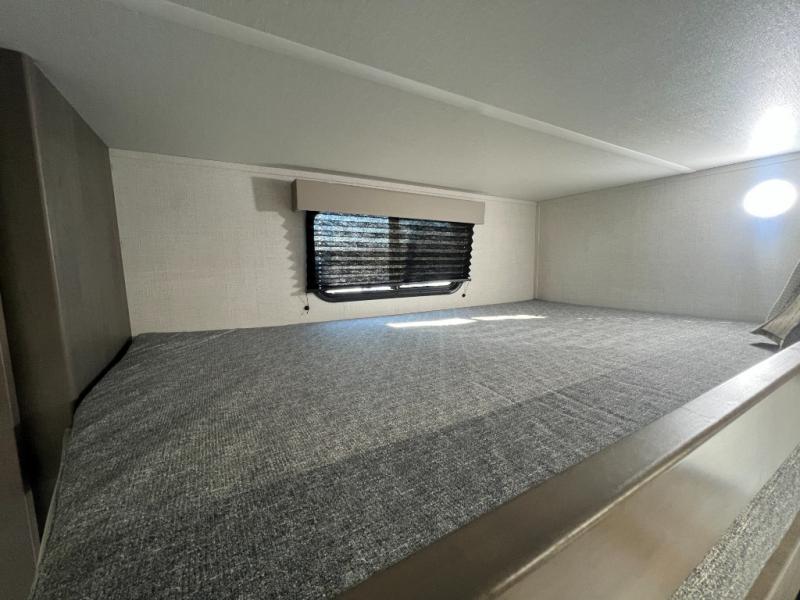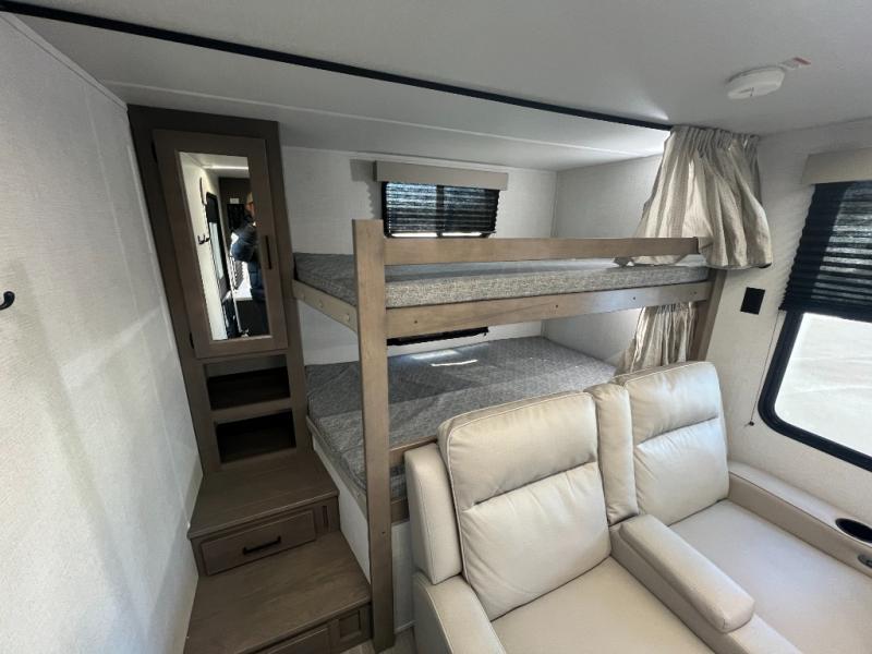 Are you ready to camp in comfort with your family or friends? This travel trailer allows you to do just that! There are double-size bunks in the back with step storage for books or board games. There is also a closet here to keep clothes wrinkle-free. The large slide features a U-Shaped dinette which is perfect for everyone to gather for a meal or games, and there is also theater seating adjacent to the slide. This model features a walk-through bath that leads to the front master bedroom. You'll love the queen bed here, overhead storage, and your own exterior entry door for convenience.
