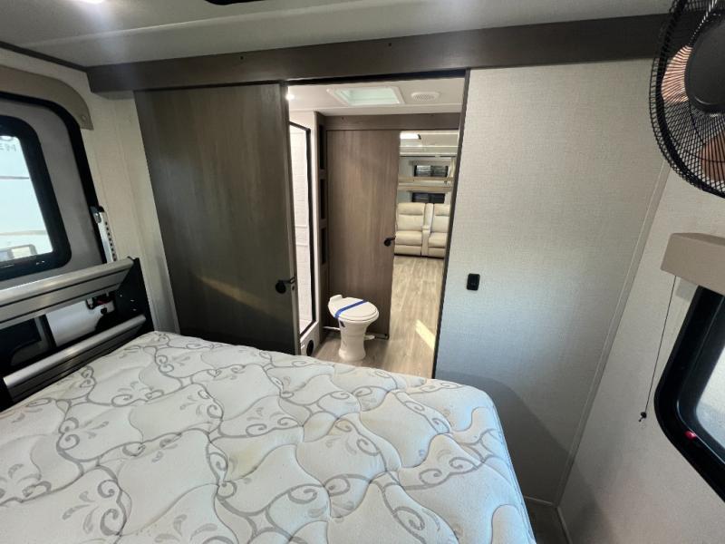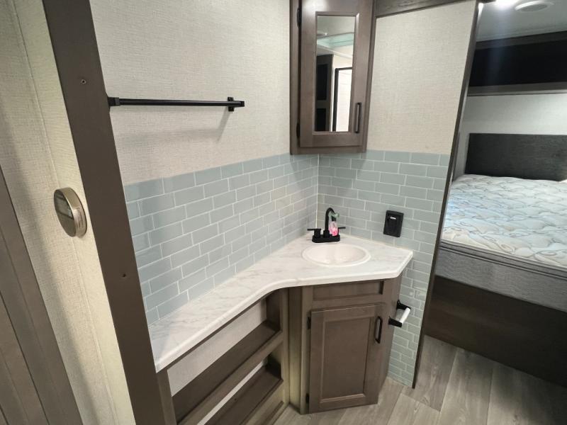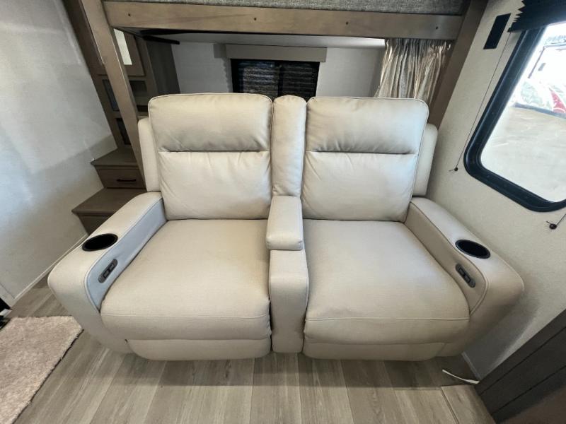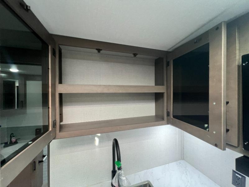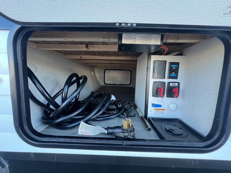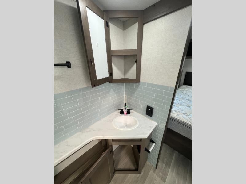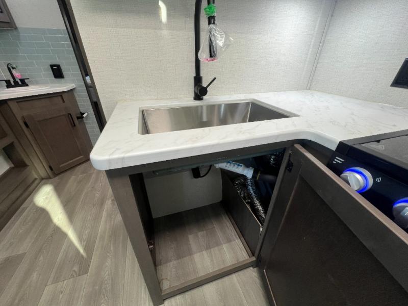 Are you ready to camp in comfort with your family or friends? This travel trailer allows you to do just that! There are double-size bunks in the back with step storage for books or board games. There is also a closet here to keep clothes wrinkle-free. The large slide features a U-Shaped dinette which is perfect for everyone to gather for a meal or games, and there is also theater seating adjacent to the slide. This model features a walk-through bath that leads to the front master bedroom. You'll love the queen bed here, overhead storage, and your own exterior entry door for convenience.