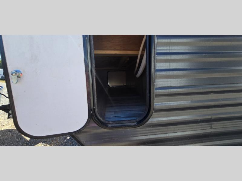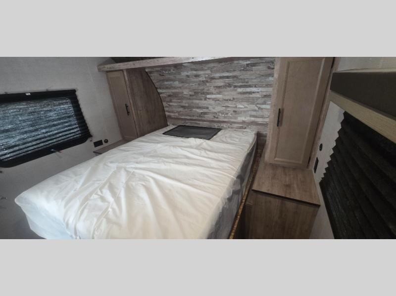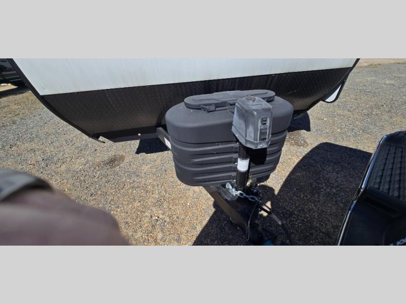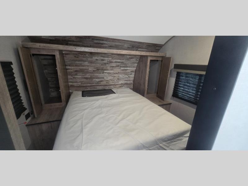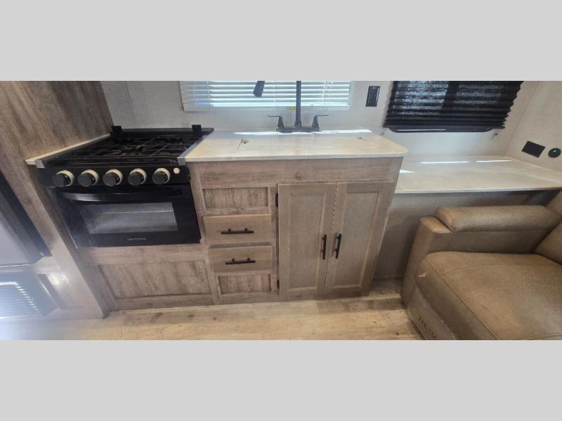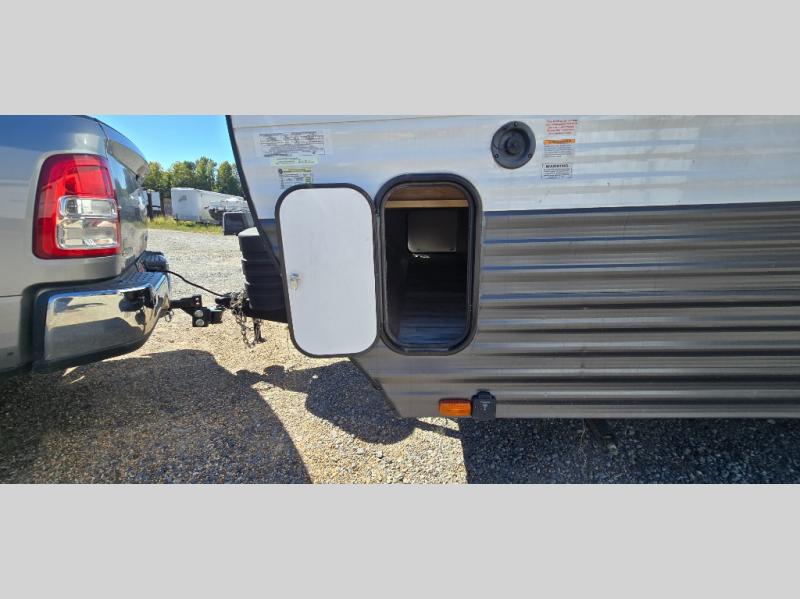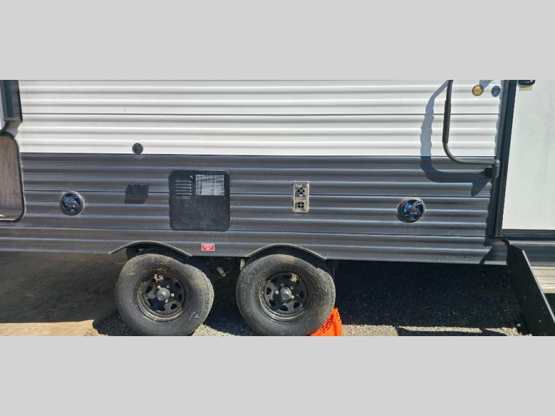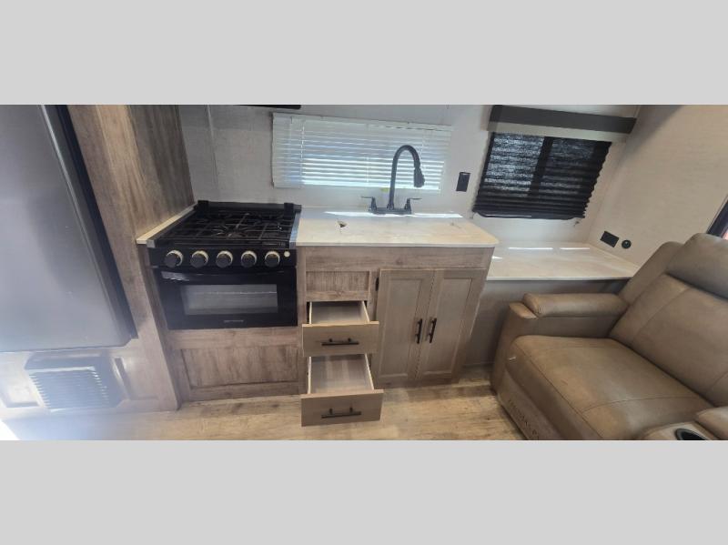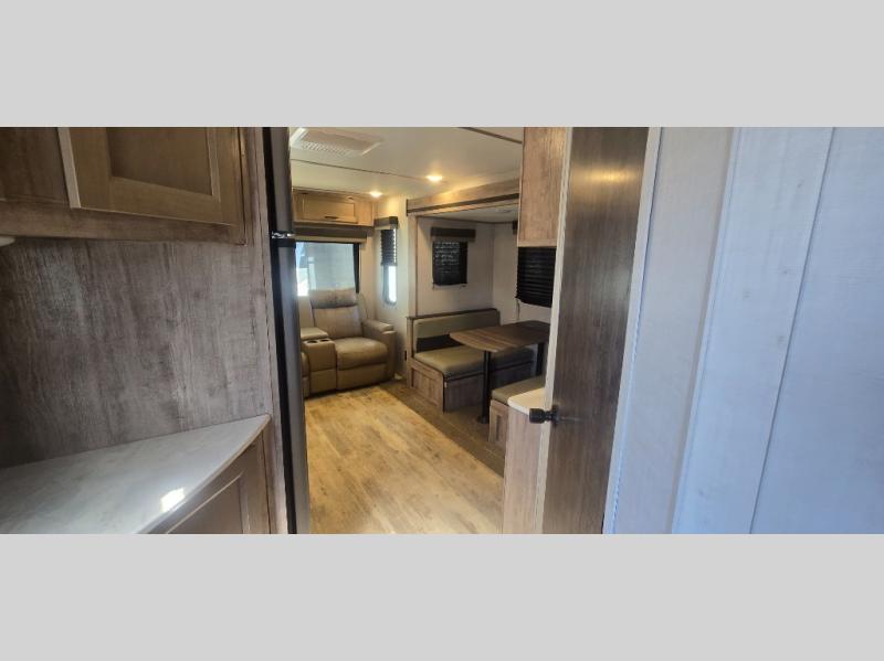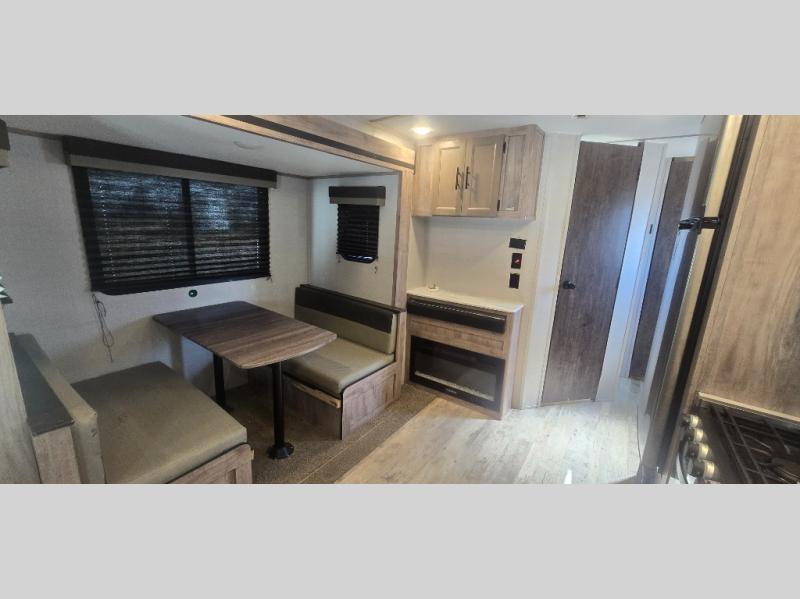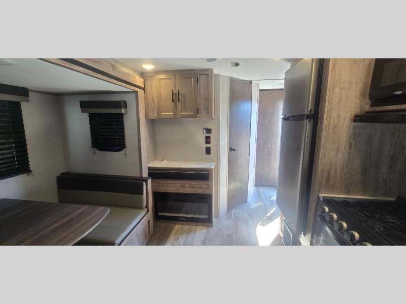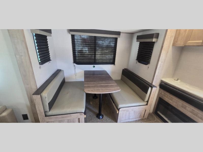 Camping with friends has never been so easy than in this cozy travel trailer. Once you arrive at your destination, prepare lunch on the three burner cooktop and you can dine at the booth dinette. Your guest can make this area their bed at night, along with the jack knife sofa. There is a front master bedroom with a queen bed that will feel just like home, and the two wardrobes provide a place for all your clothes. Head outside to find a pass-through storage, additional outside storage, plus an electric awning with LED lights!
