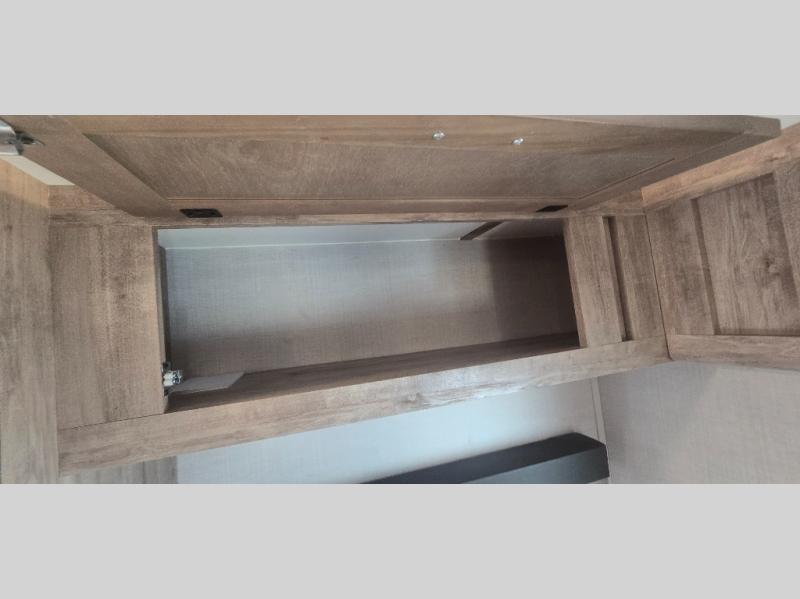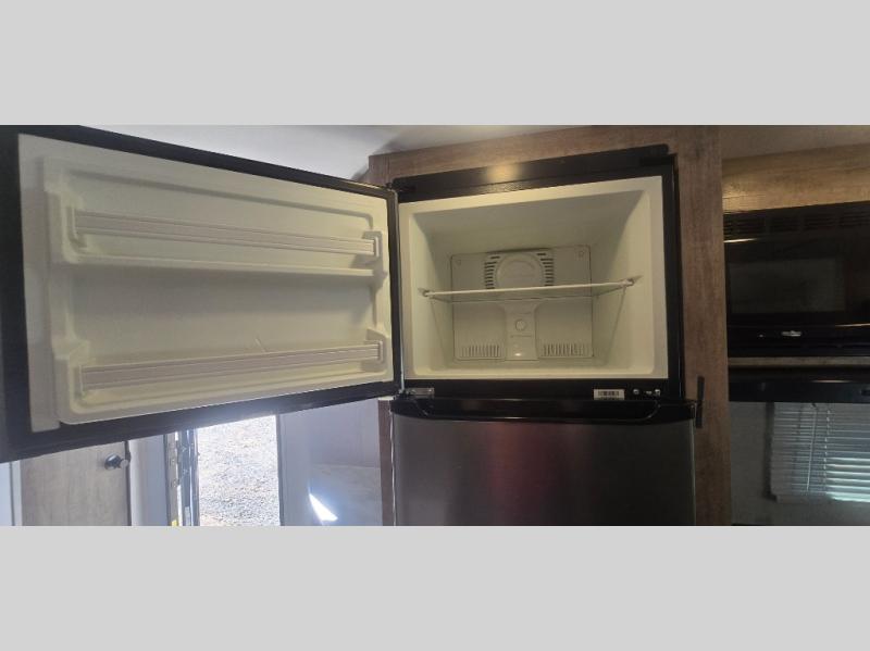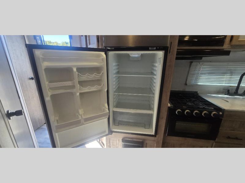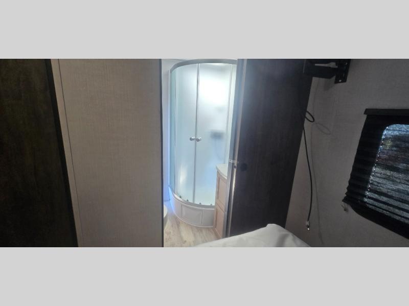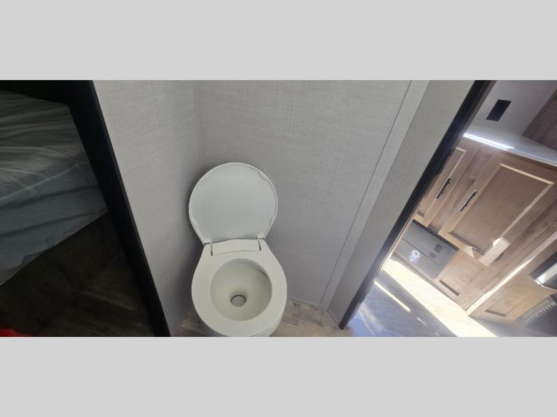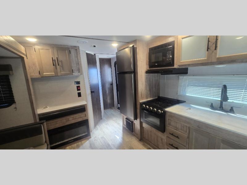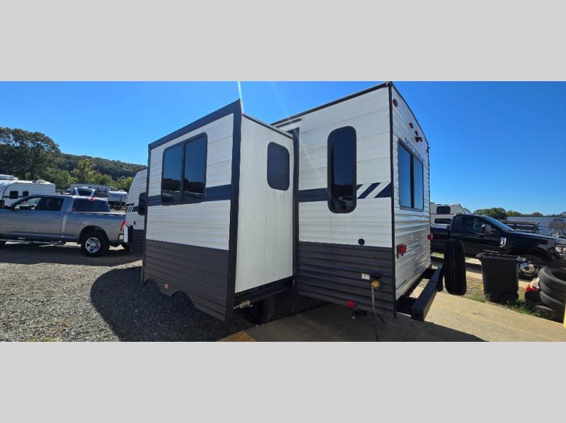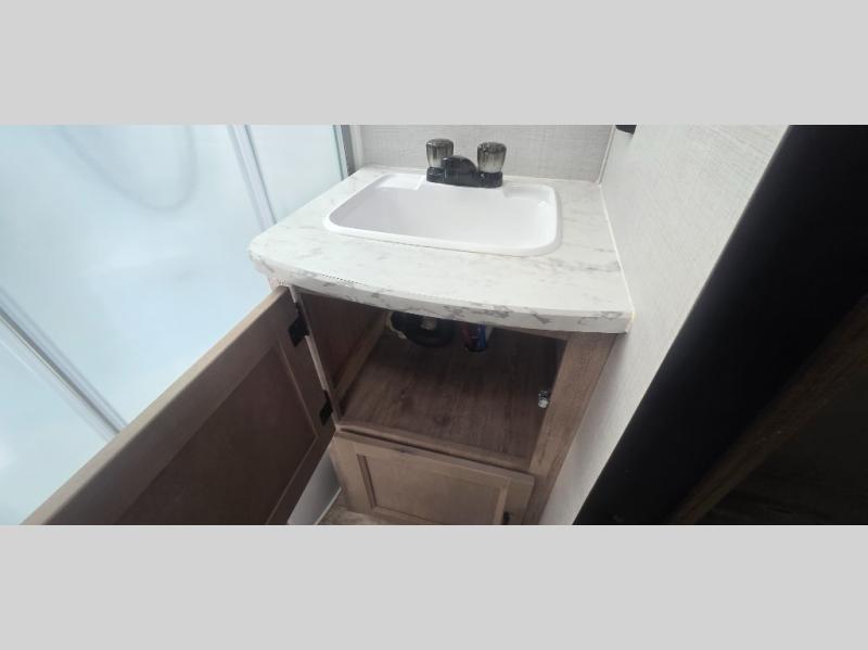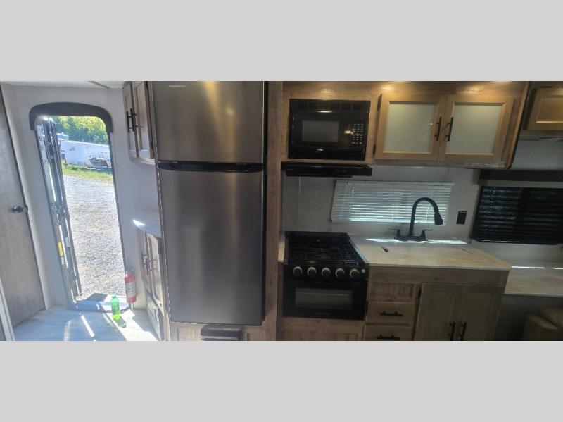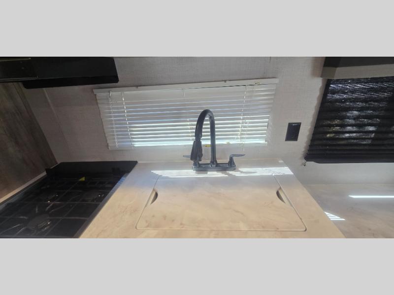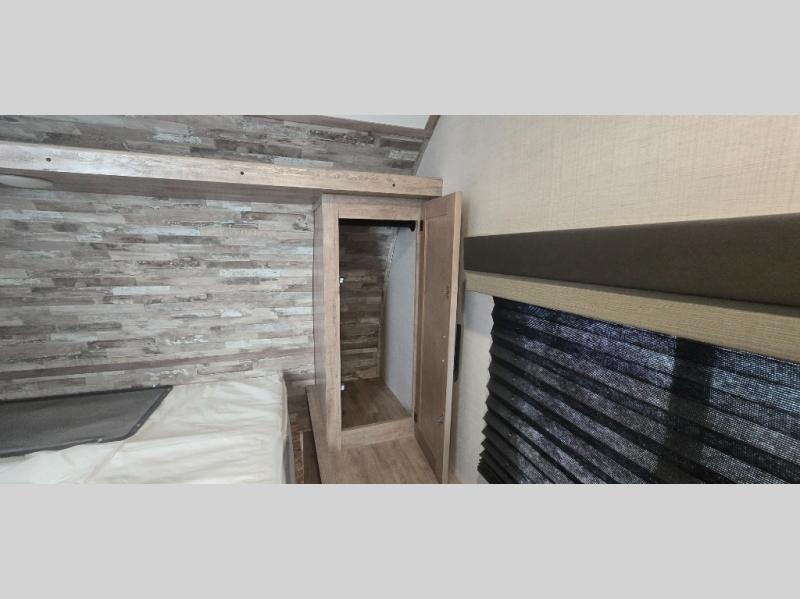 Camping with friends has never been so easy than in this cozy travel trailer. Once you arrive at your destination, prepare lunch on the three burner cooktop and you can dine at the booth dinette. Your guest can make this area their bed at night, along with the jack knife sofa. There is a front master bedroom with a queen bed that will feel just like home, and the two wardrobes provide a place for all your clothes. Head outside to find a pass-through storage, additional outside storage, plus an electric awning with LED lights!