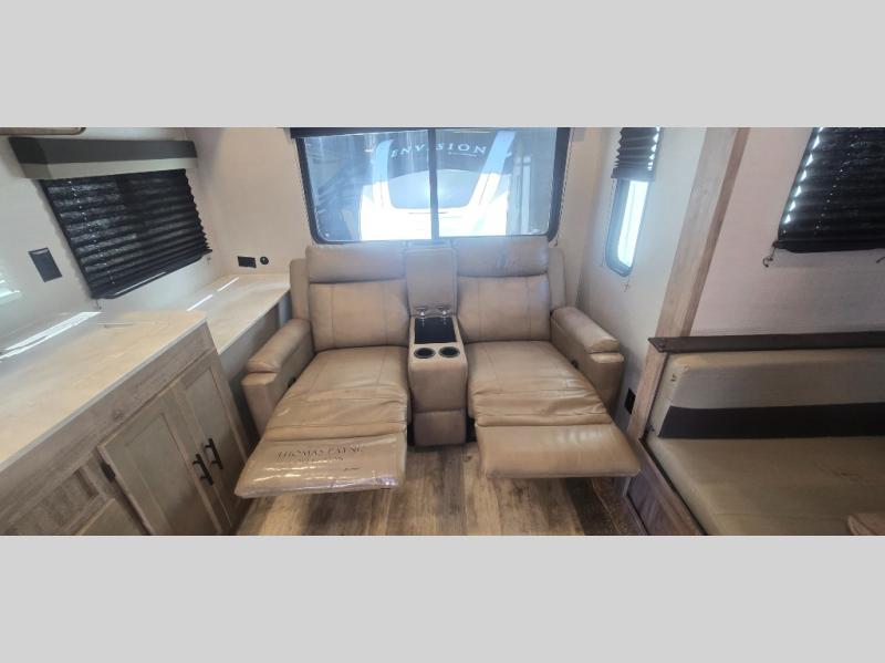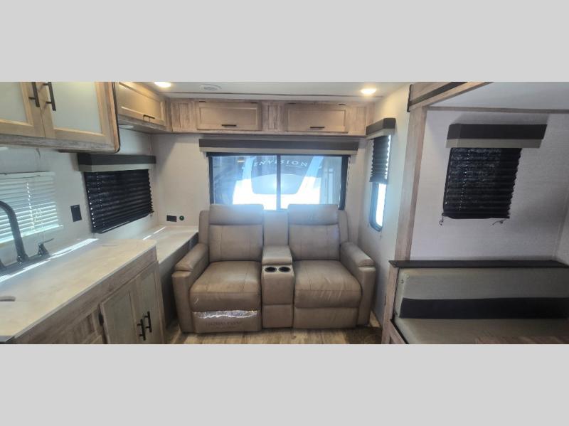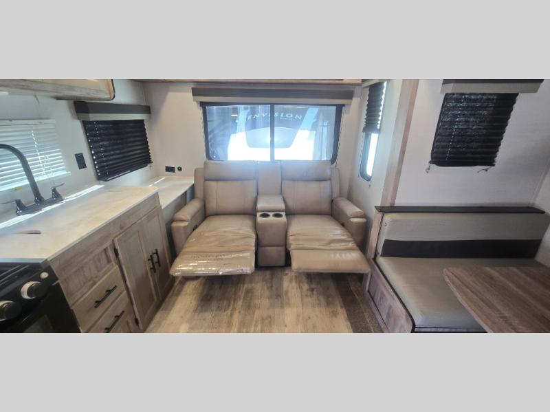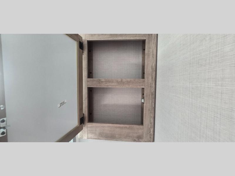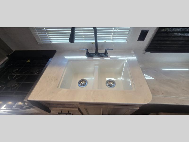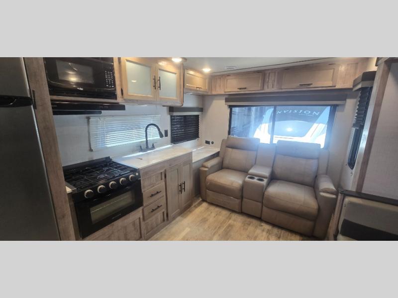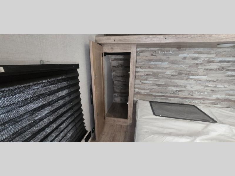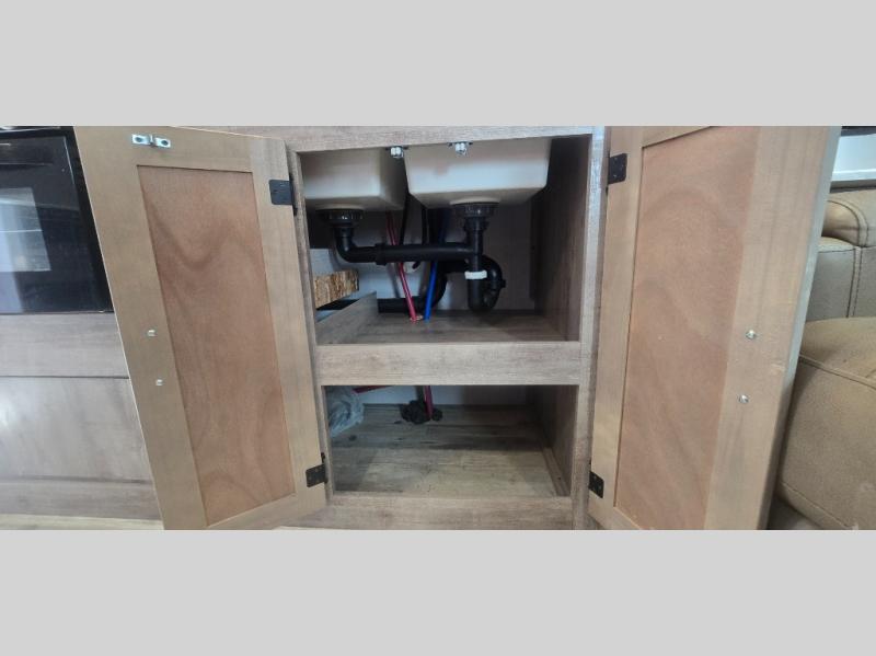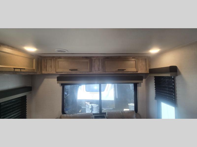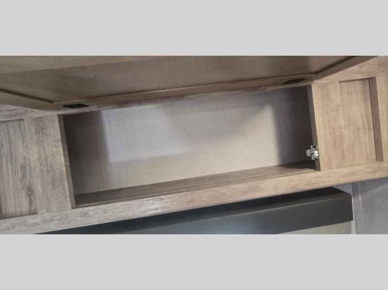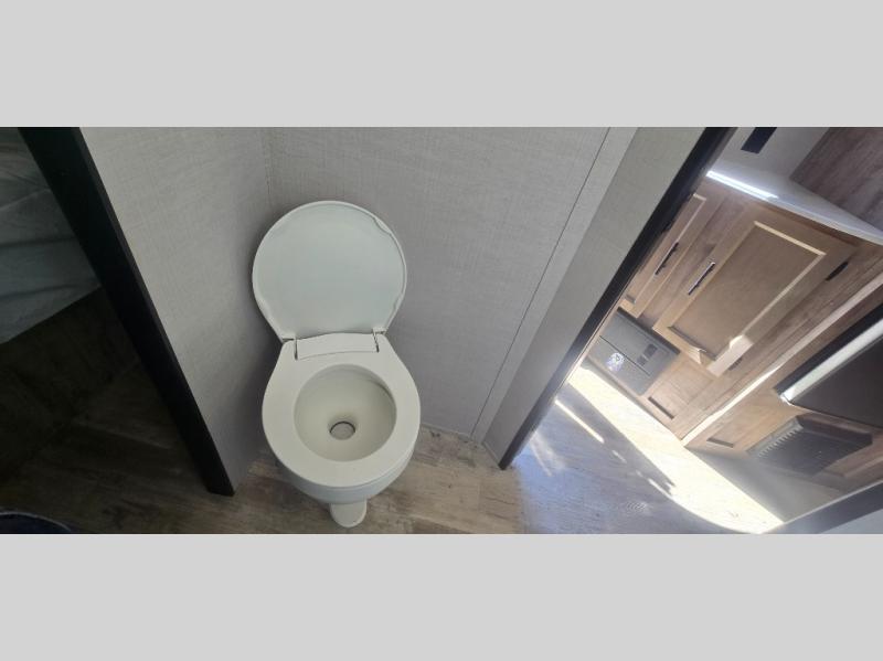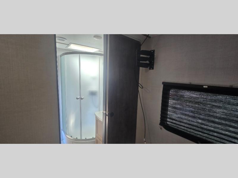 Camping with friends has never been so easy than in this cozy travel trailer. Once you arrive at your destination, prepare lunch on the three burner cooktop and you can dine at the booth dinette. Your guest can make this area their bed at night, along with the jack knife sofa. There is a front master bedroom with a queen bed that will feel just like home, and the two wardrobes provide a place for all your clothes. Head outside to find a pass-through storage, additional outside storage, plus an electric awning with LED lights!