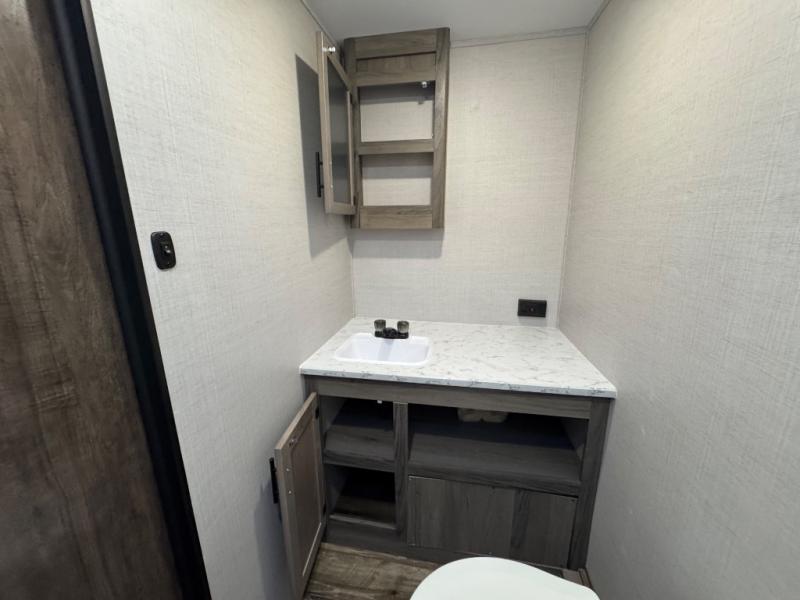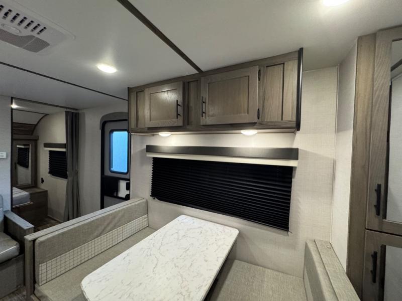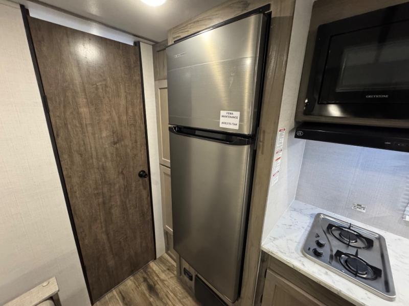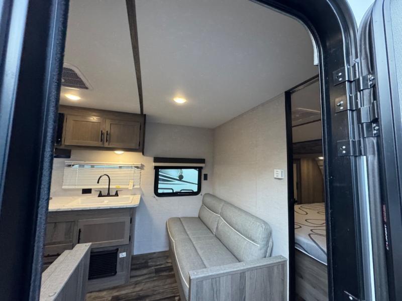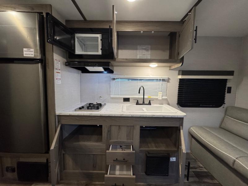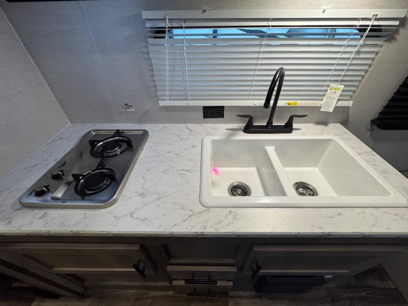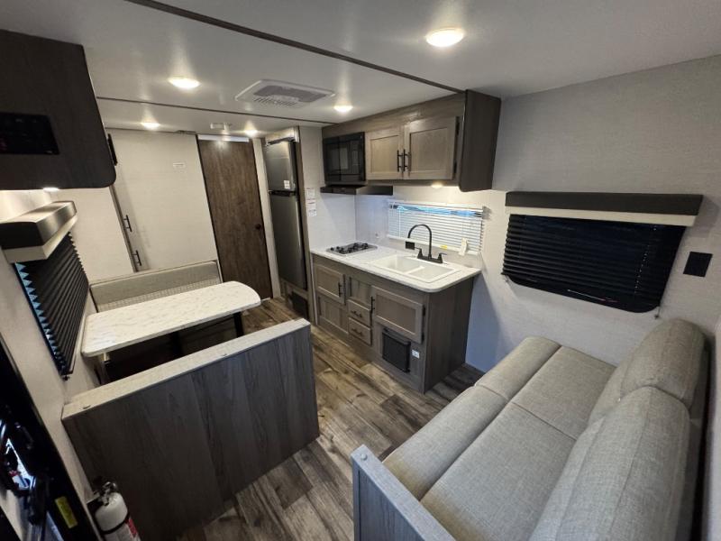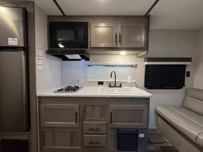 Easy-to-tow and easy to love, this 'Show Stopper' travel trailer is perfect for you! You can prepare meals each day on the two burner cooktop, dine at the booth dinette, and clean up in the full rear bath that includes plenty of counter space. There is a front bedroom with an RV queen bed, plus two wardrobes on either side of the bed for convenience. Start camping today!