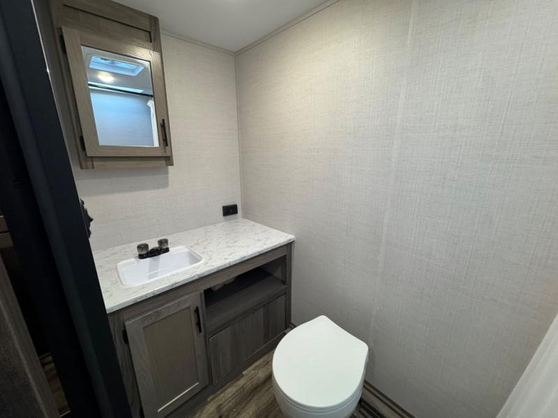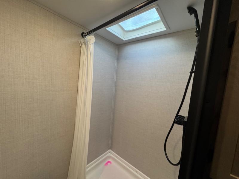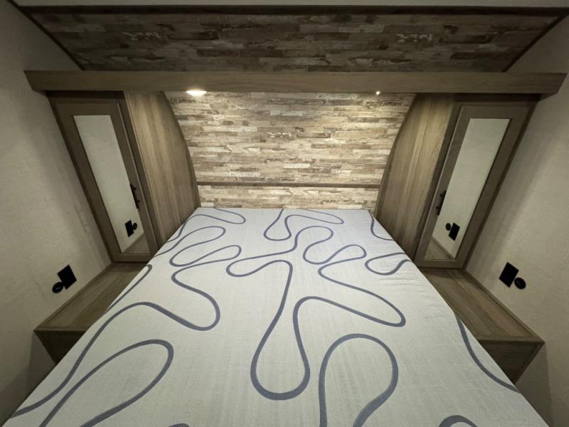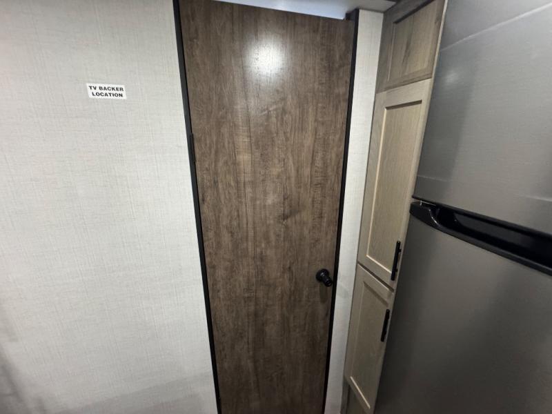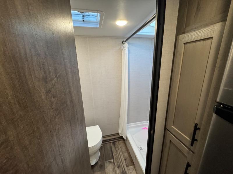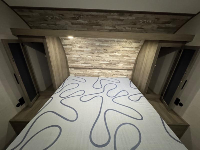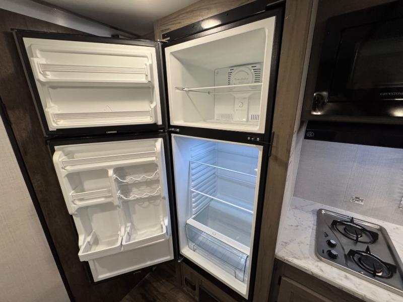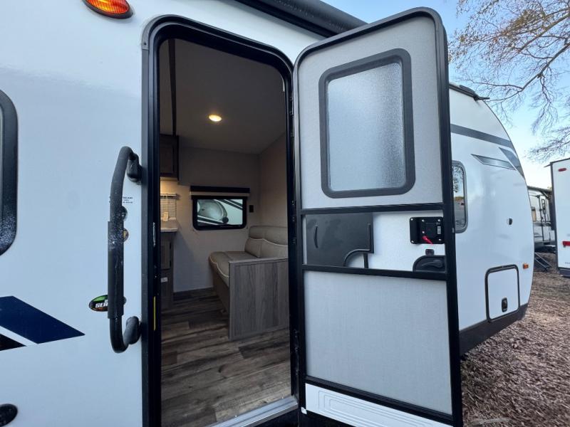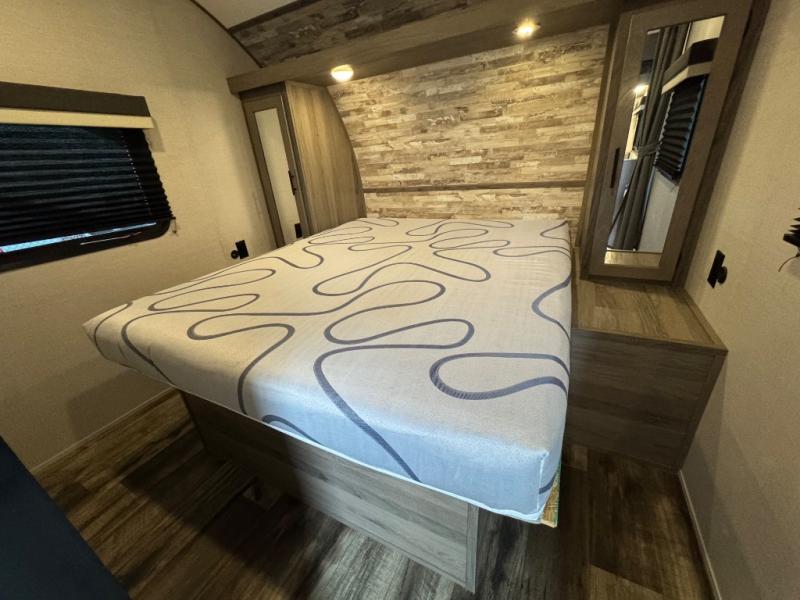 Easy-to-tow and easy to love, this 'Show Stopper' travel trailer is perfect for you! You can prepare meals each day on the two burner cooktop, dine at the booth dinette, and clean up in the full rear bath that includes plenty of counter space. There is a front bedroom with an RV queen bed, plus two wardrobes on either side of the bed for convenience. Start camping today!
