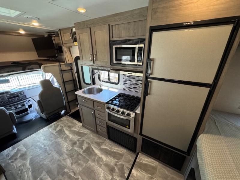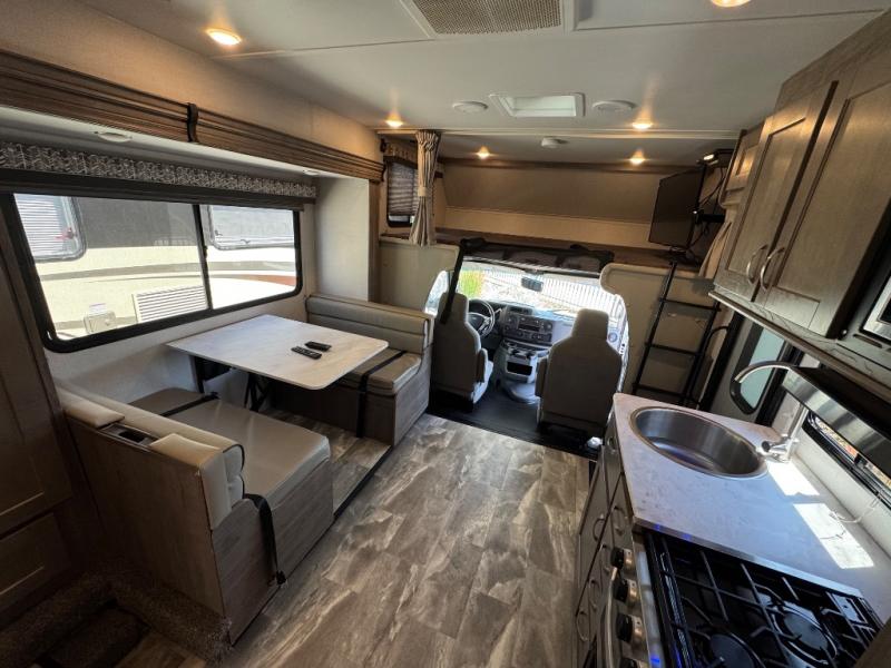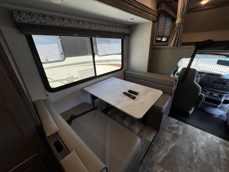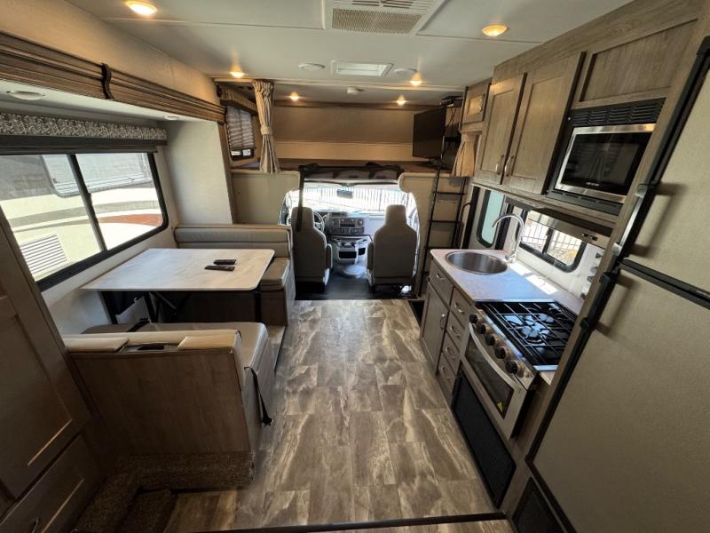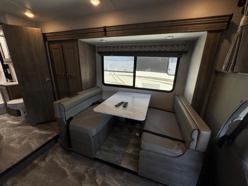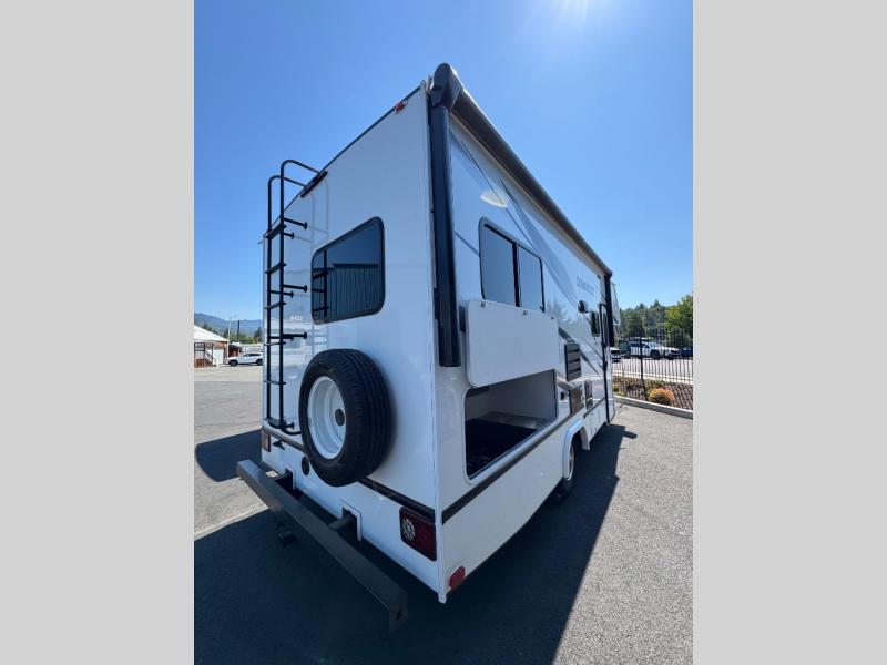 If you enjoy traveling the countryside during the day and pulling off into your favorite campground at night, then check out the comfortable accommodations this motorhome has to offer. For your group of five, you will have enough sleeping space between the RV queen bed in the rear, the overhead bunk above the cab, and the booth dinette. The kitchen provides everything you will need to cook all your meals and store leftovers, plus the dinette allows you to eat inside without worrying about bugs swarming you. The electric awning offers another living space outdoors, and it comes with LED lights so that you can party with the neighbors.