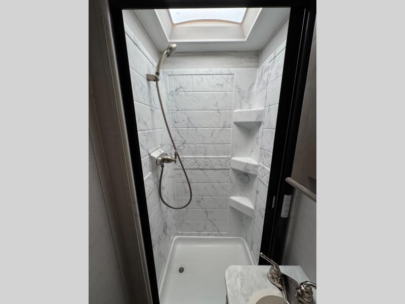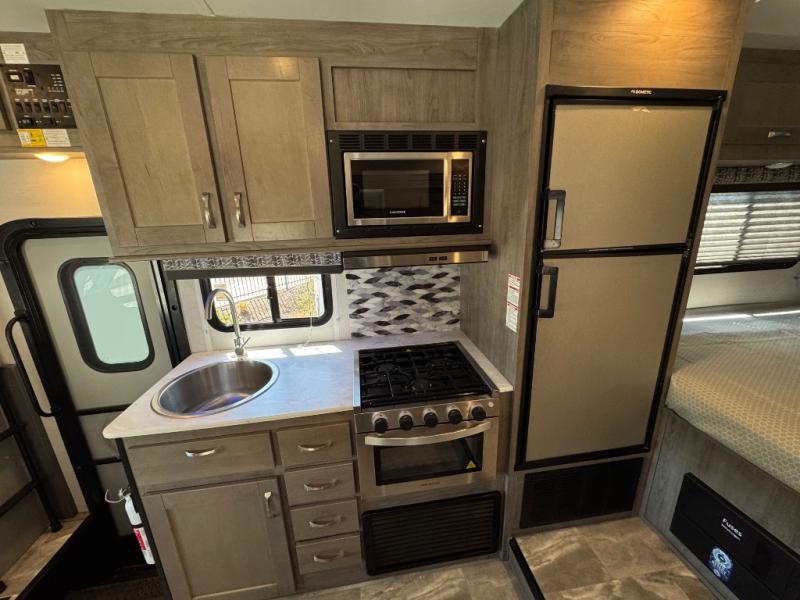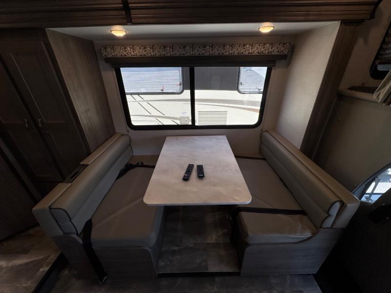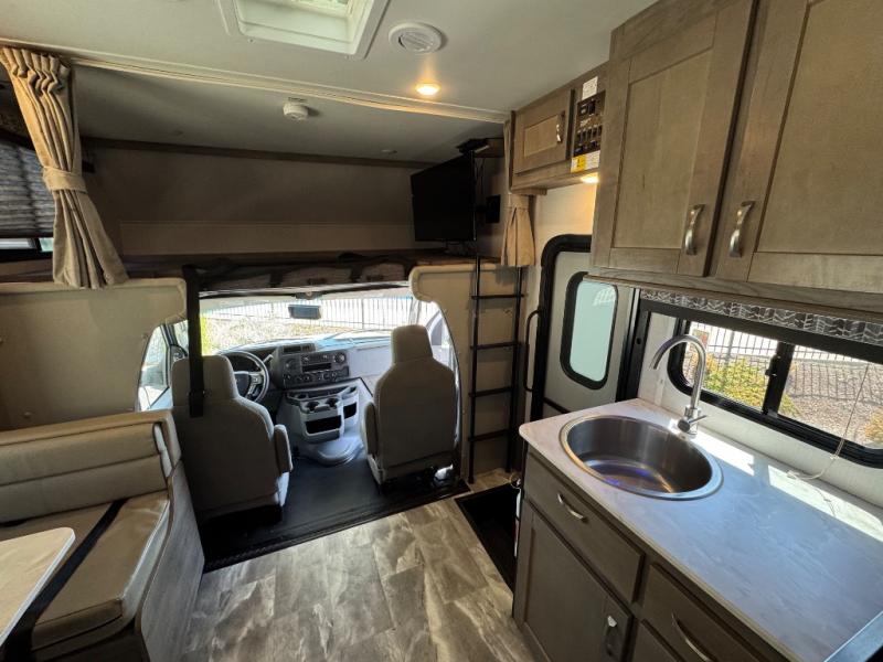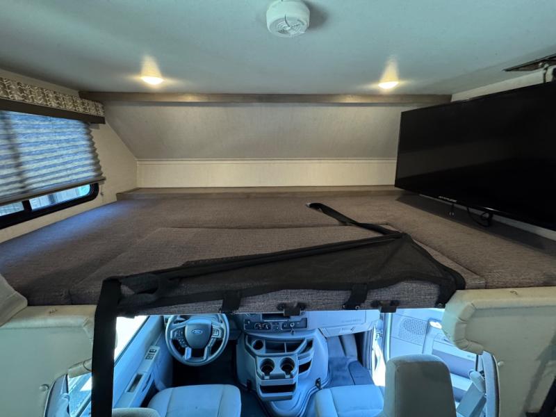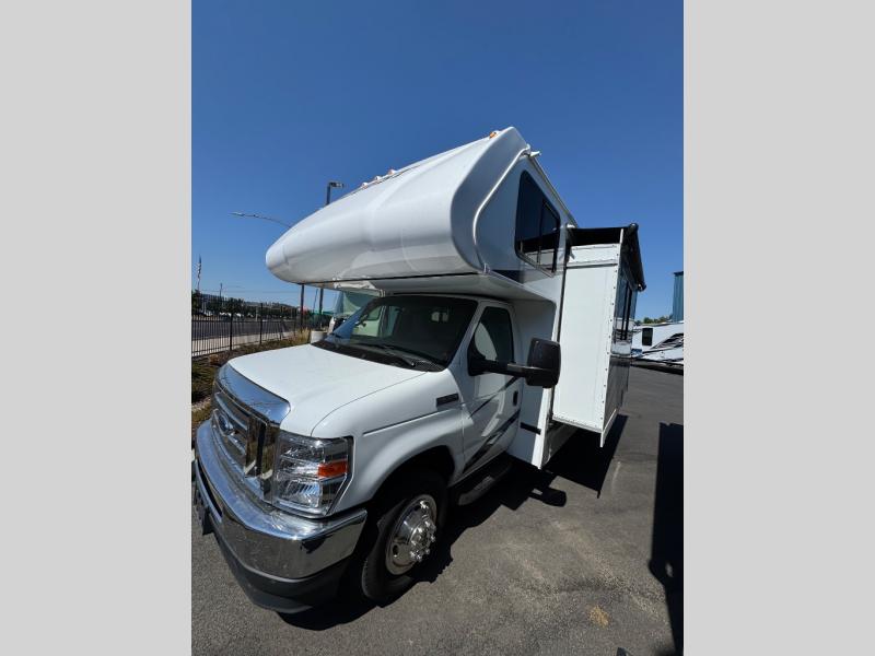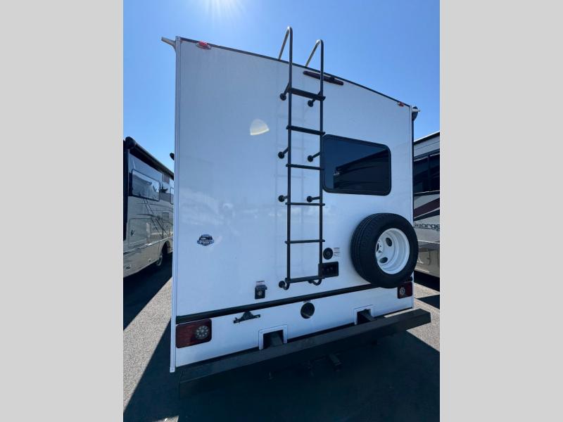 If you enjoy traveling the countryside during the day and pulling off into your favorite campground at night, then check out the comfortable accommodations this motorhome has to offer. For your group of five, you will have enough sleeping space between the RV queen bed in the rear, the overhead bunk above the cab, and the booth dinette. The kitchen provides everything you will need to cook all your meals and store leftovers, plus the dinette allows you to eat inside without worrying about bugs swarming you. The electric awning offers another living space outdoors, and it comes with LED lights so that you can party with the neighbors.