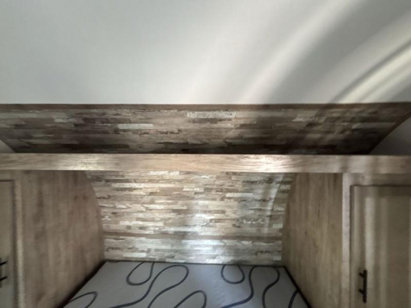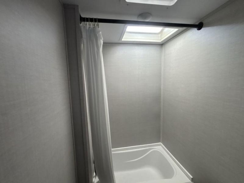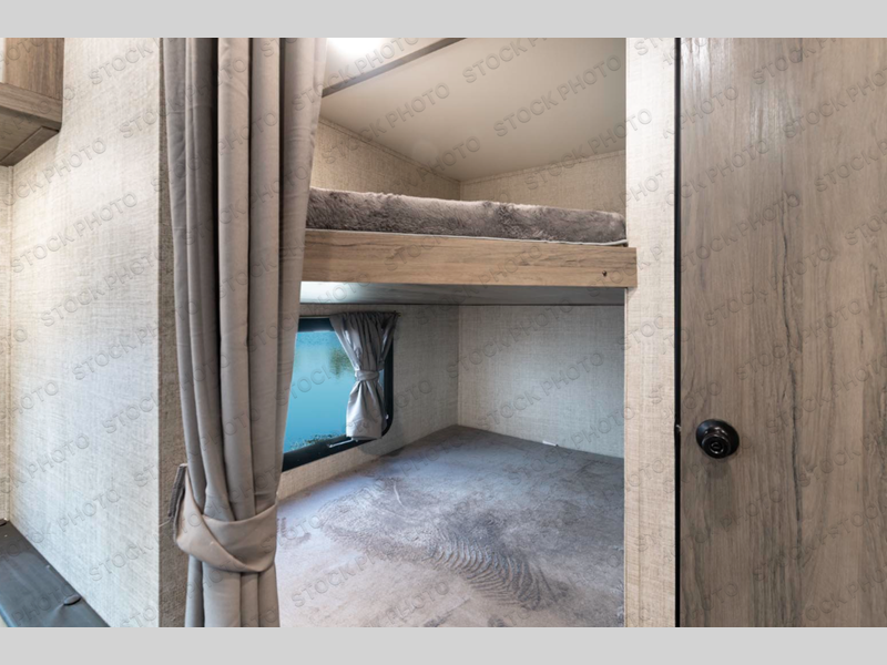 This semi-private front bedroom travel trailer allows you to change in privacy when you close the curtain and sleep on a queen-size bed or choose the optional Murphy bed/sofa for versatility. You will find your own wardrobe and a handy shelf at the head of the bed for your belongings. Your friends or kids will loving sleeping on the double-size bunks in the rear next to the private toilet and tub/shower room. The bathroom sink is just outside the door which is handy when two people need to get ready at once. And the cook will have full amenities plus a pantry and overhead storage for all the dishes, pots, and spices.