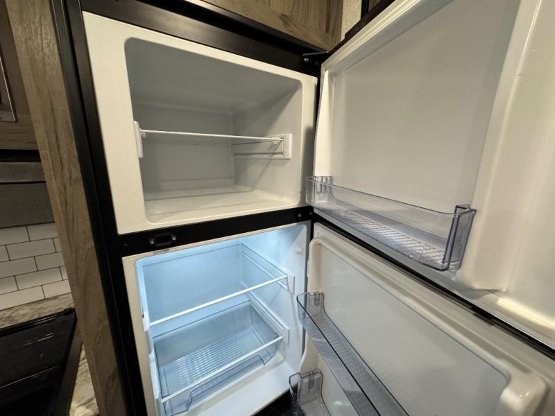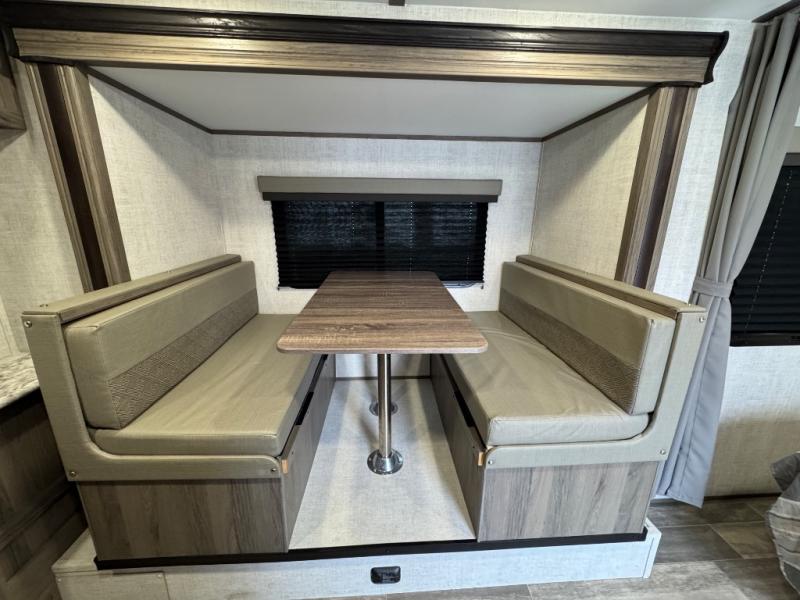 Enjoy camping at a local RV park, a state park or even at your ranch. This trailer allows you to quickly get up and go! You and your spouse will have your own 60" x 74" queen bed to sleep on at night with a privacy curtain to utilize when you have a guest or kiddo sleeping on the slide out dinette after it is set up for bedtime. The cook will have a two burner range top and microwave to make warm meals when you don't use a campfire, and a 6 cu. ft. refrigerator for your drinks and cold items. You can relax outside during the day or nighttime under the electric awning with LED lighting giving you an outdoor living area protected from the elements.