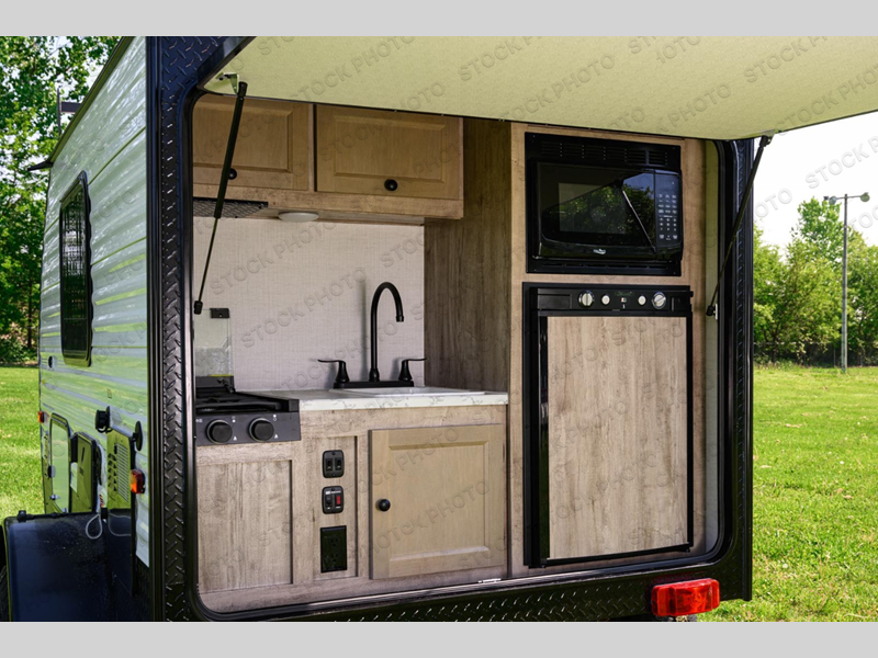 You and your spouse will have a great time in the woods with this teardrop trailer! Get a good night's rest each night when you set up the 76" x 54" bed and relax on it as a sofa during the day. There are hookups for an optional TV too and storage shelves to keep your items out of the way. The exterior kitchen has everything you need to prepare delicious home cooked meals like a gas/electric refrigerator, a microwave oven, a hot/cold sink, and a two burner gas cooktop to fry up the catch of the day. You even have an outside shower to rinse the mud off your feet!