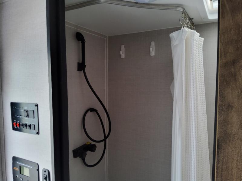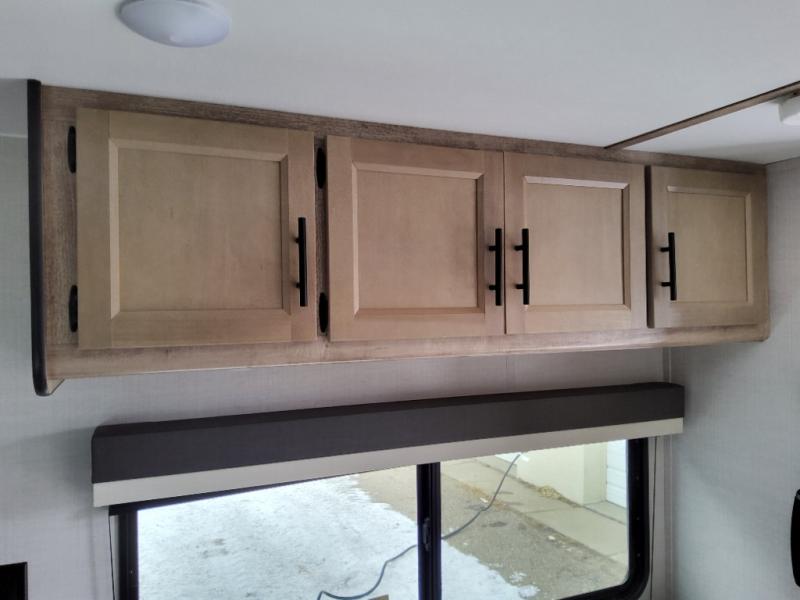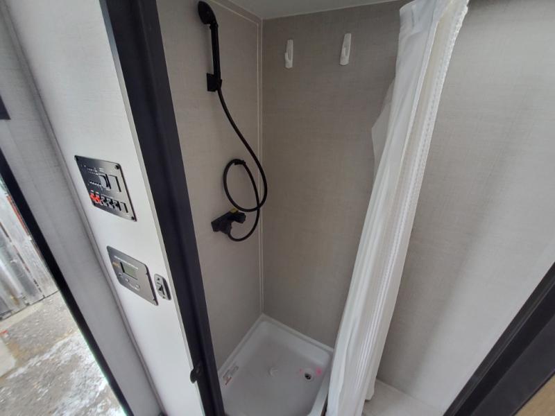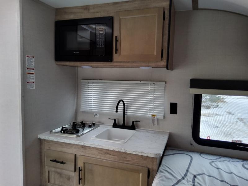 Head out on your greatest adventures in the woods with this teardrop trailer! Get a good night's rest each night on the front 54" x 80" bed with overhead cabinets and relax on the sofa during the day. Across from the sofa is a TV mount location and above it is overhead cabinets to keep your items out of the way. You can also use the exterior trunk for your hiking gear. After a fun day outside, head to the rear corner bathroom to freshen up in the neo-angled shower. The kitchen has everything you need to prepare delicious home cooked meals like a gas/electric refrigerator, a microwave oven, a hot/cold sink, and a two burner gas cooktop to fry up the catch of the day. You even have an outside shower to rinse the mud off your feet!