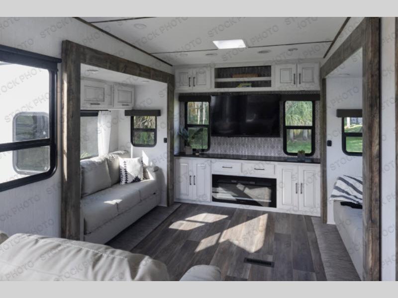 Comfort and fun is found in this fifth wheel with four slides and sleeping space for six! Once you arrive at the campground, set up the 18' power awning, then make lunch on the two burner cooktop. Head inside to find a dinette with bench seating on one side and chairs on the other, plus a 16.2 cu. ft. 12V refrigerator for tons of food storage space. Your crew can visit in the rear living area in front of the entertainment center with a fireplace, plus there are two sofas and theater seats. The full bath includes a spacious shower, a 6' 4" bath ceiling height, plus a domed shower skylight for more standing space. And don't overlook the front private bedroom with a king bed slide out, a large front closet, plus washer and dryer prep, allowing you to go full-time if you choose!