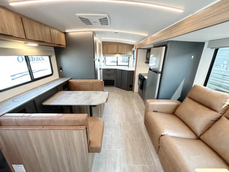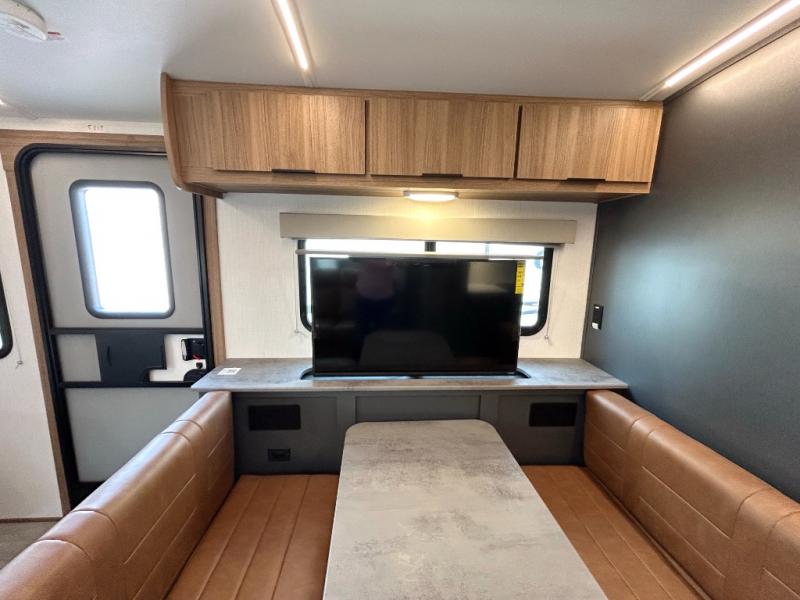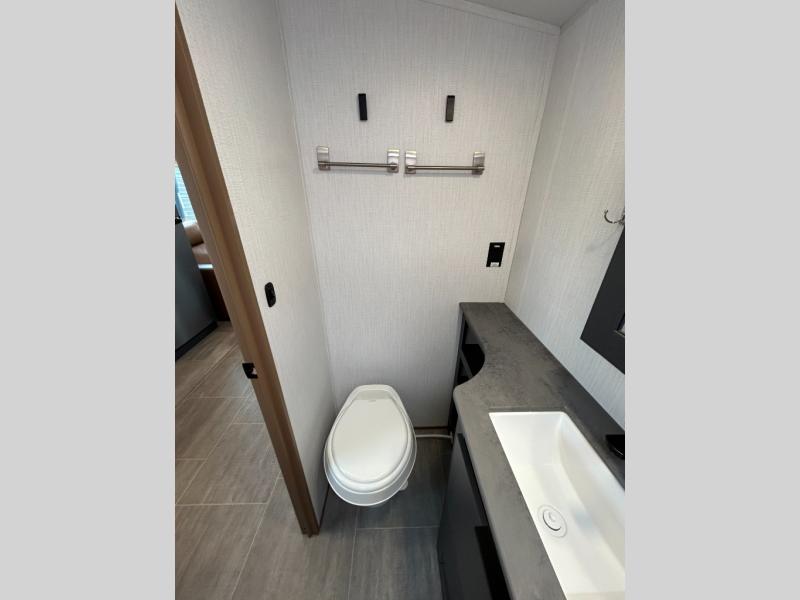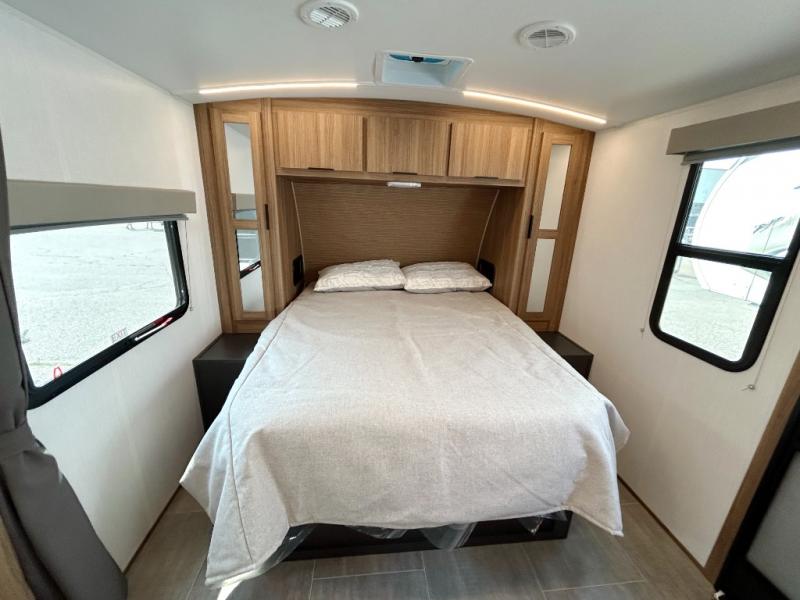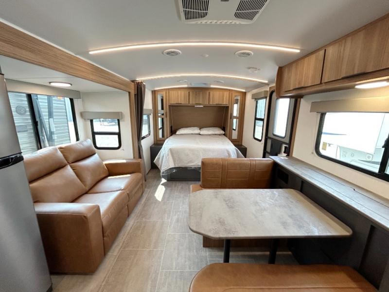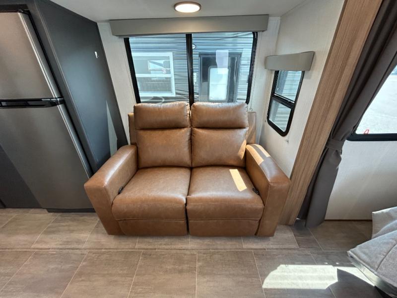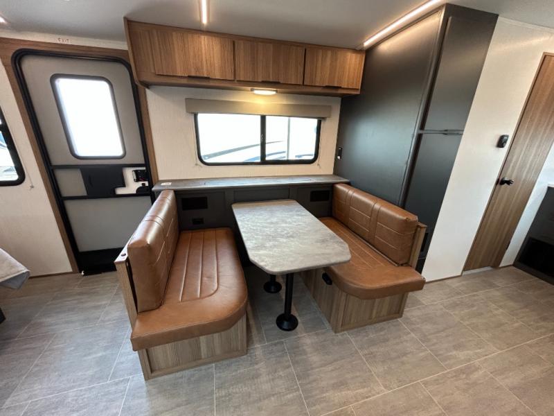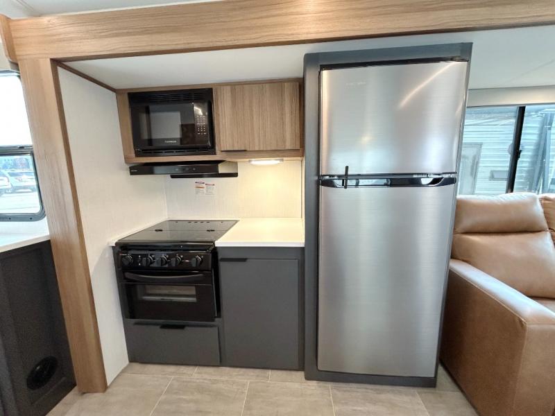 Simple, yet elegant, this travel trailer is sure to bring about great memories. The 19' power awning with LED lights can be set up when you arrive at the campground, then you can stretch your legs before heading inside. The rear of this unit is shared with the full bath and the kitchen counter with a large sink, and you'll find the three burner cooktop with a 22" oven within the large slide out. There is also a 10.7 cu. ft. refrigerator here plus a sofa so you can relax. Across from the slide is the booth dinette where you can dine and play board games together, and the front of this model includes the walk-around queen bed with a privacy curtain and dual closets!