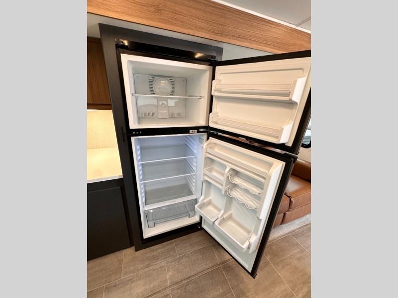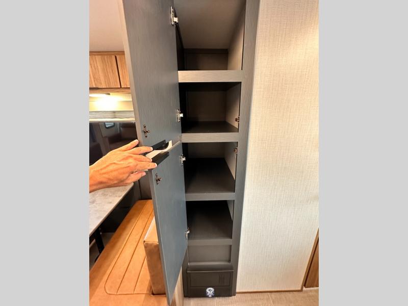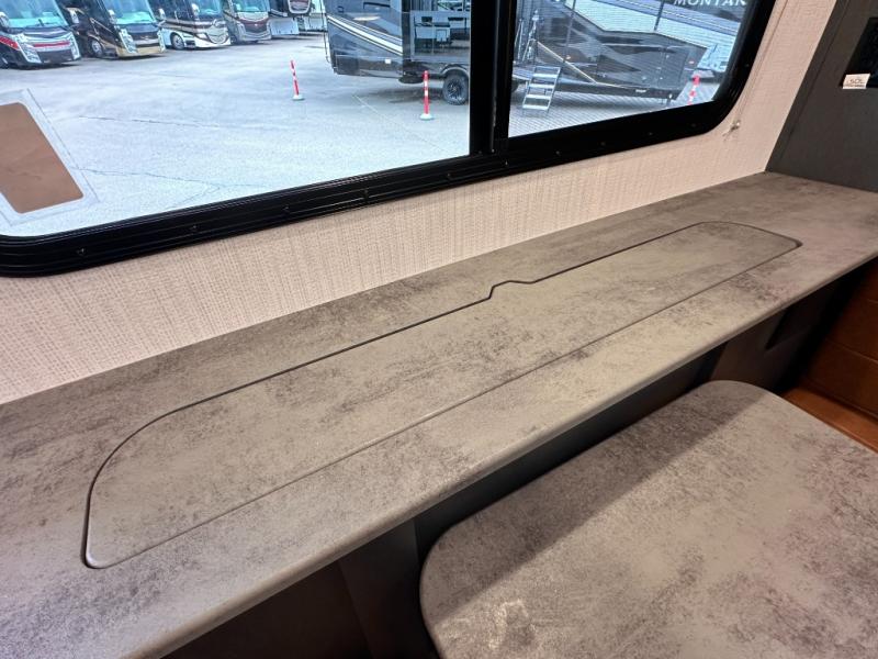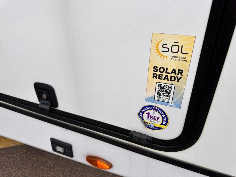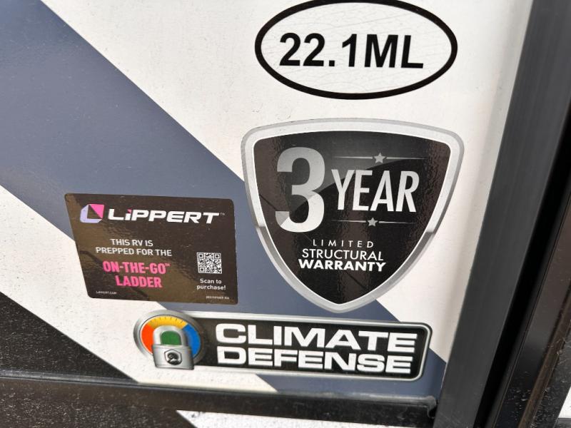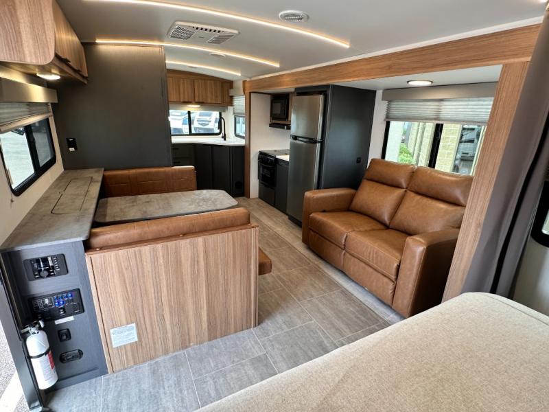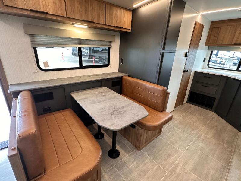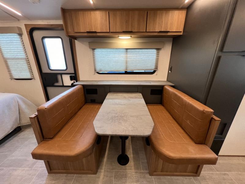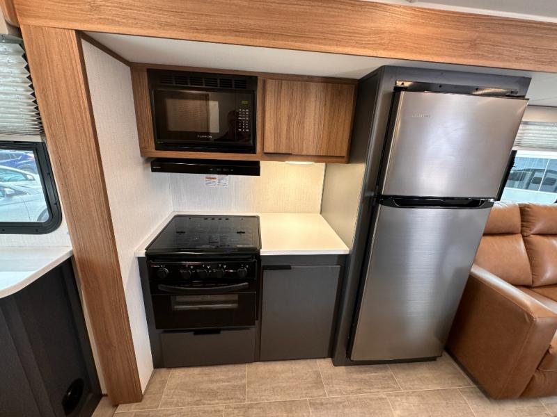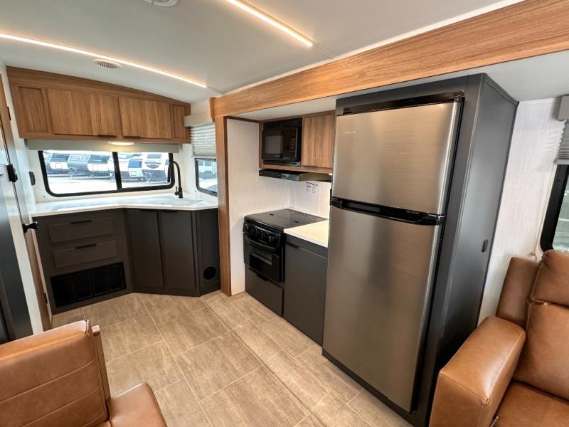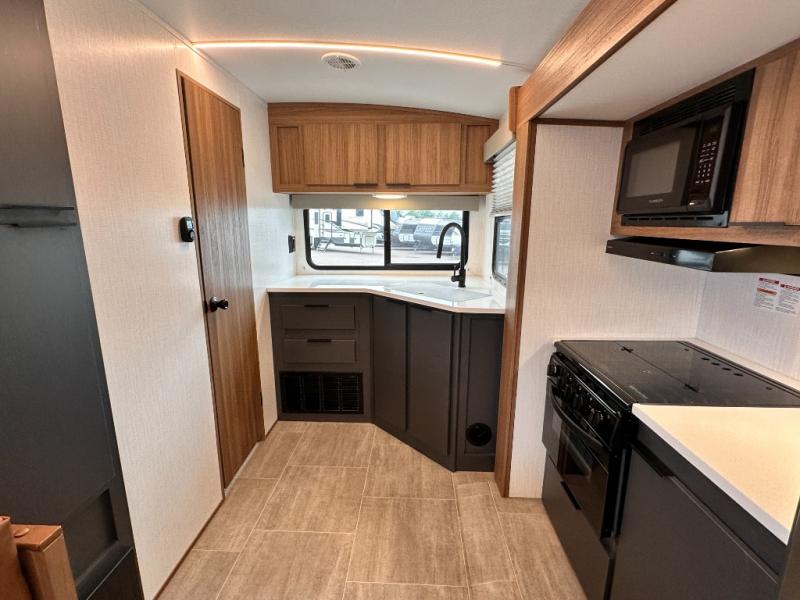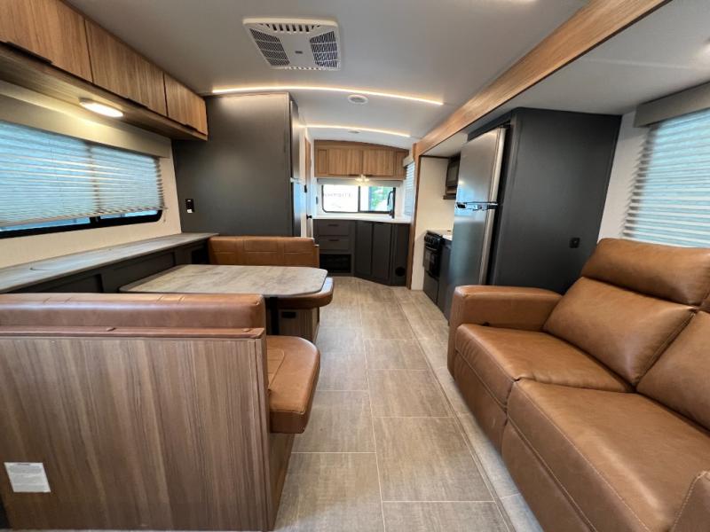 Simple, yet elegant, this travel trailer is sure to bring about great memories. The 19' power awning with LED lights can be set up when you arrive at the campground, then you can stretch your legs before heading inside. The rear of this unit is shared with the full bath and the kitchen counter with a large sink, and you'll find the three burner cooktop with a 22" oven within the large slide out. There is also a 10.7 cu. ft. refrigerator here plus a sofa so you can relax. Across from the slide is the booth dinette where you can dine and play board games together, and the front of this model includes the walk-around queen bed with a privacy curtain and dual closets!