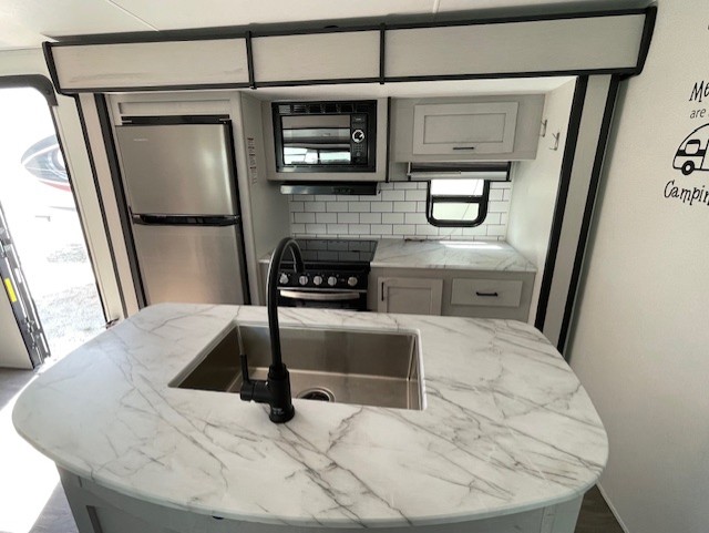 The Heartland Mallard travel trailer is quite impressive with its innovative features! The flip-down exterior steps and glow-in-the-dark graphics are some of the top exterior features, and the all-new Master Chef kitchen with Infinity edge countertops and a stainless steel undermount sink is one of the top interior features that will make camping life easier. The forced-air heated and enclosed underbelly is a great feature that protects your trailer from the outside weather, and the Wide Traxx axle system, leaf spring suspension, E-Z lube hubs, and aluminum rims all work together to give you a great ride to the campsite. The Mallard has also been prepped for a solar panel, Wi-Fi, and a back-up camera, and it also has a cable-ready hook-up.