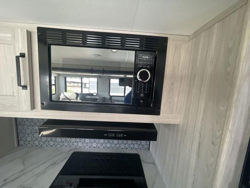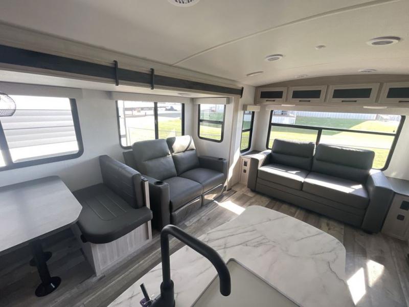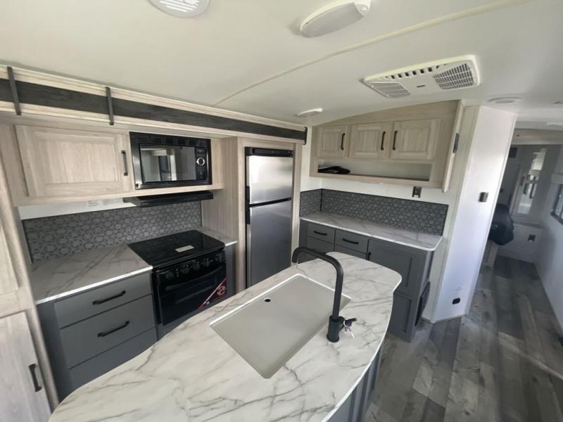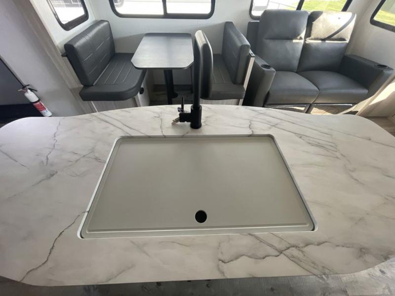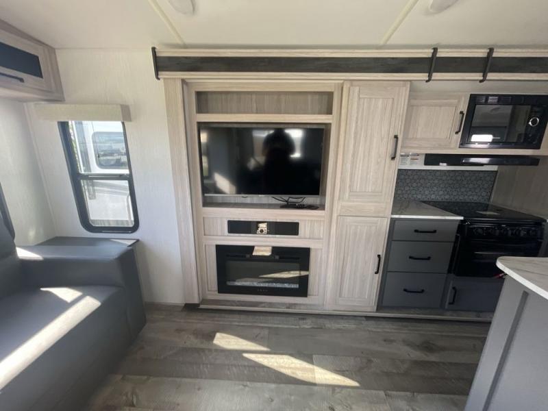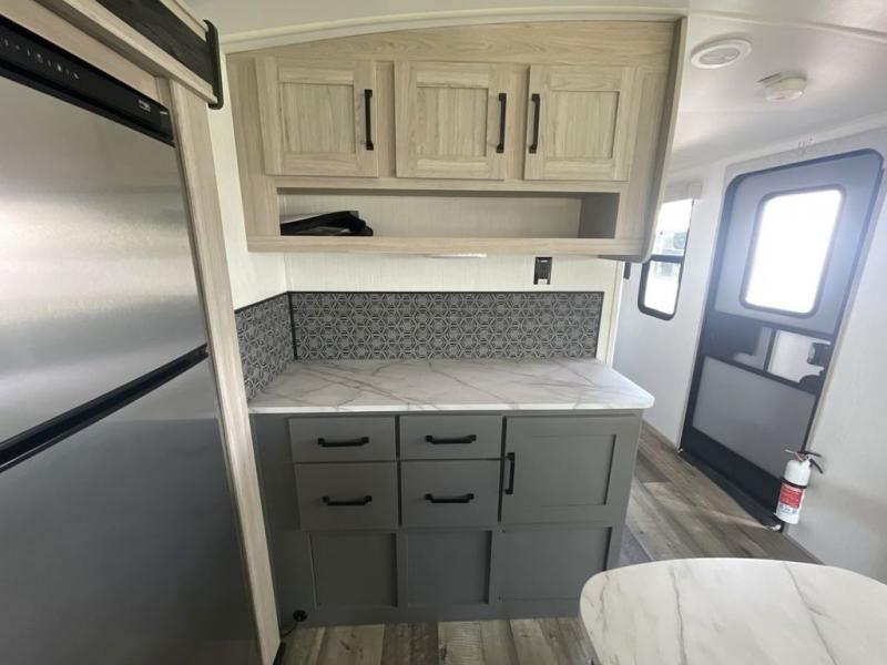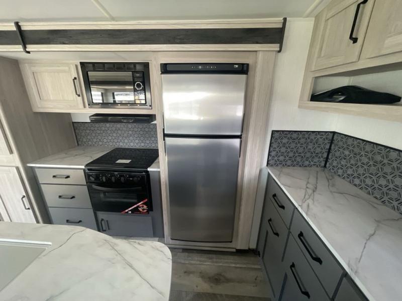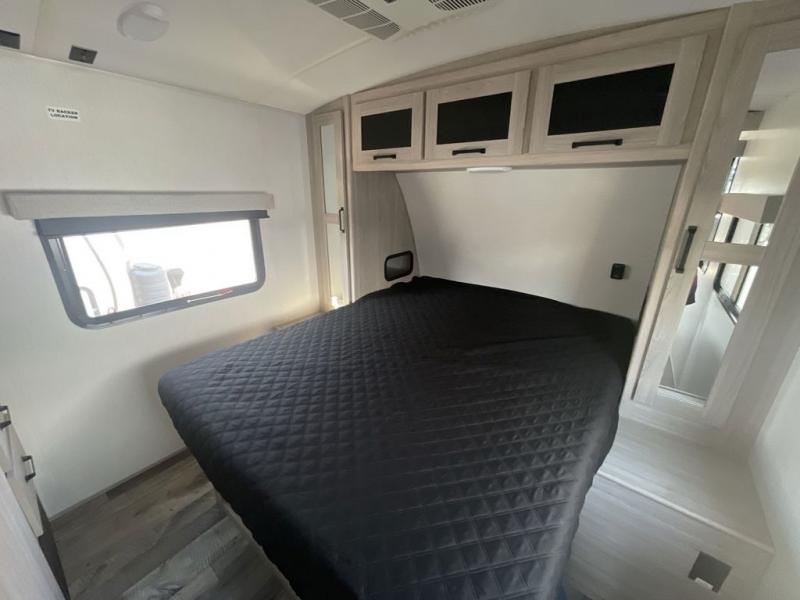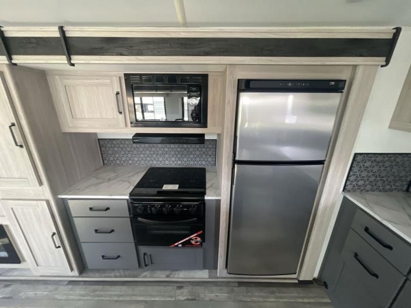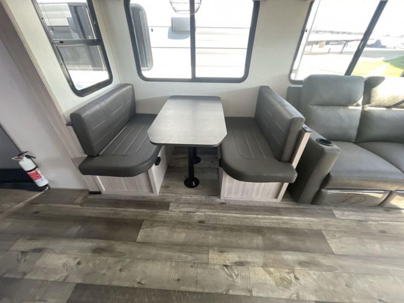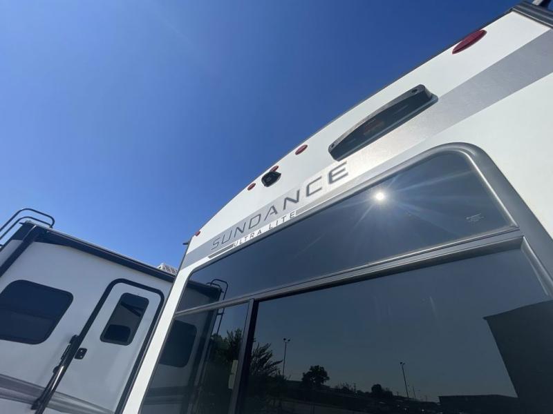 You will love planning more trips that involve this Sundance Ultra Lite travel trailer! There is lots of space in the living area because of the opposing slides, and there are plenty of places to relax on the two sofas and booth dinette. The private bedroom offers you a queen-size bed with wardrobes on either side, and there is an additional dresser/wardrobe towards the foot of the bed. The kitchen has great countertop space with an island and a standalone countertop, and you can whip up something delicious on the three-burner range. Or you can just grab some leftovers from the 12V refrigerator.