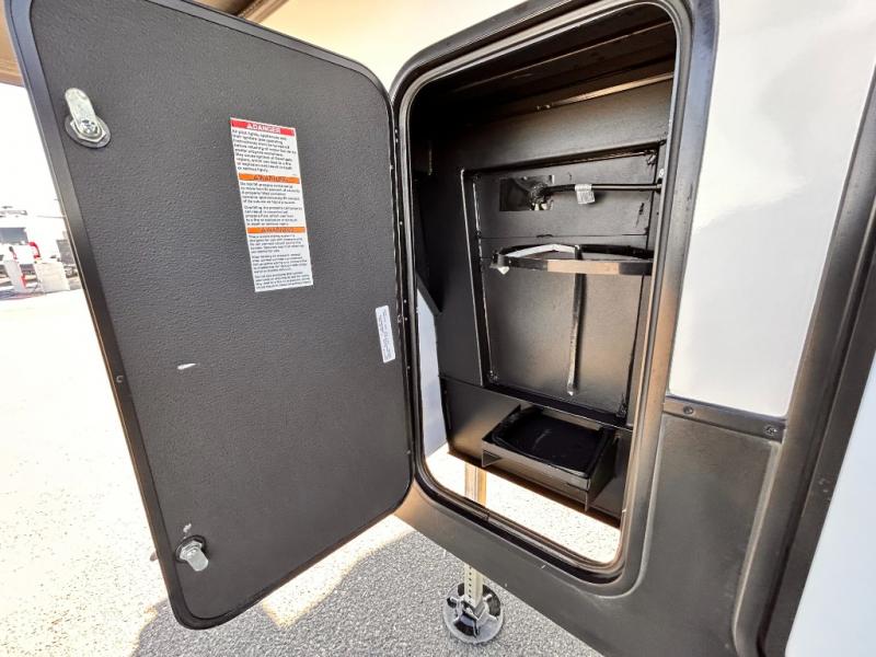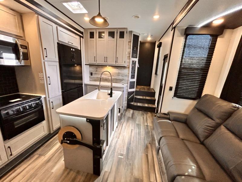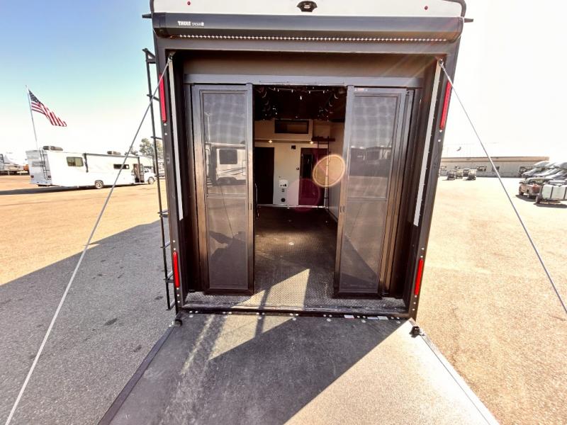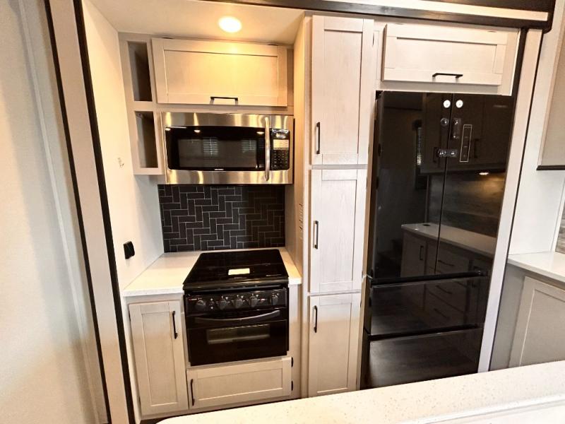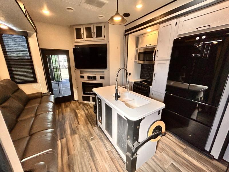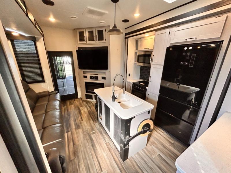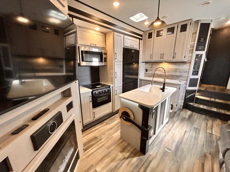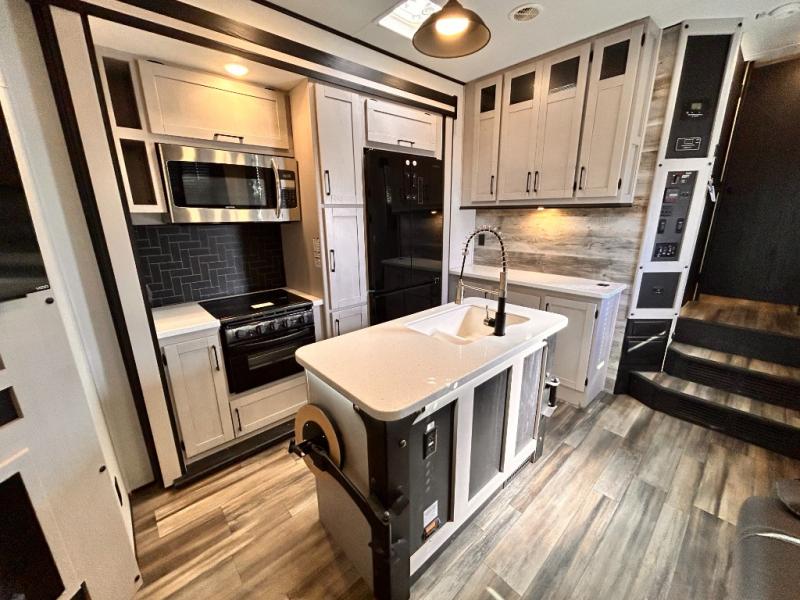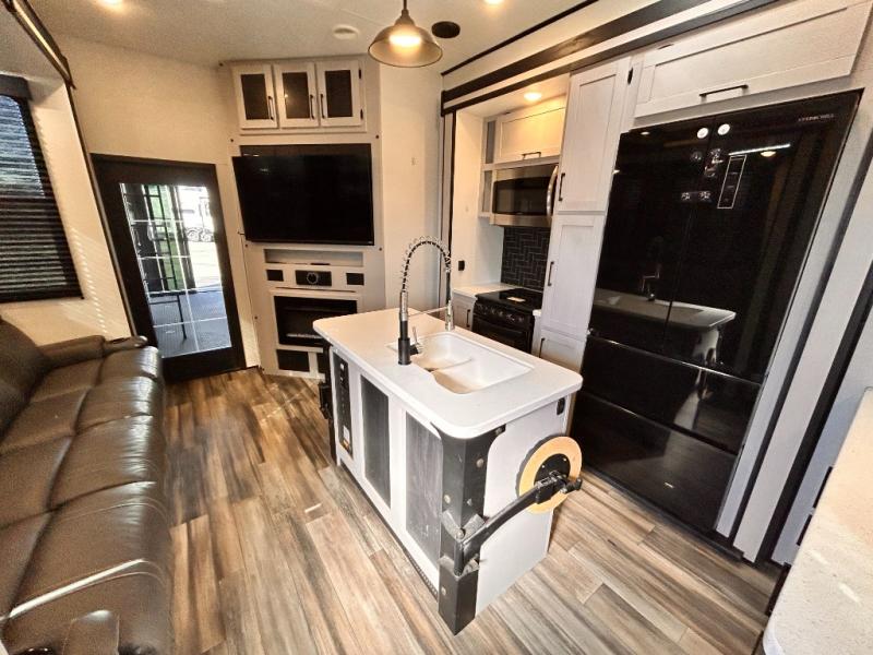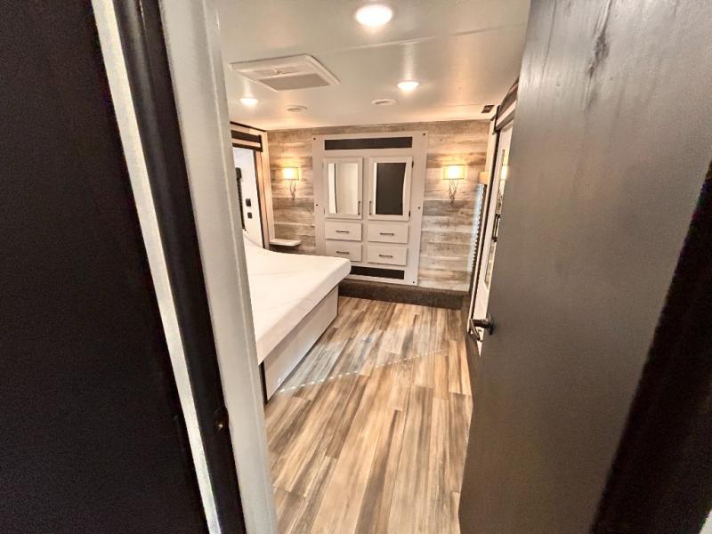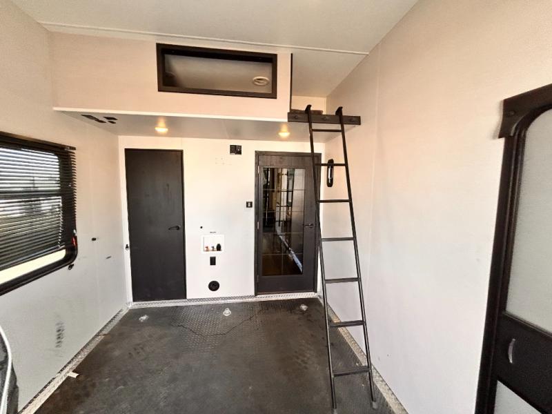 This toy hauler is decked out in comfortable features! The 17' 9" garage area has a loft above a half bathroom, an electric queen bed with split bench seating below it, and one of the dual entry doors to the unit. The chef can prepare their best home cooked meals either indoors with the three burner cooktop and kitchen island with two swing out bar stools or head to the outdoor Griddle & Go. Freshen up in the dual entry bathroom with the spacious tub which has a skylight above to bring the outdoors inside and it leads directly into the front master suite which has a tilting king bed and a wardrobe/closet slide to keep your clothes looking their best!