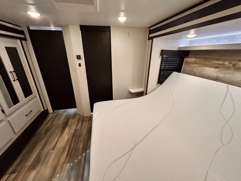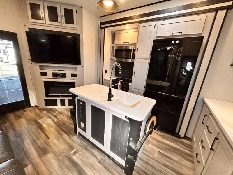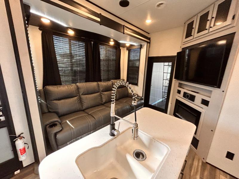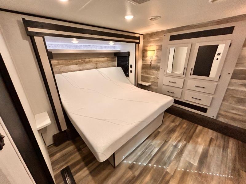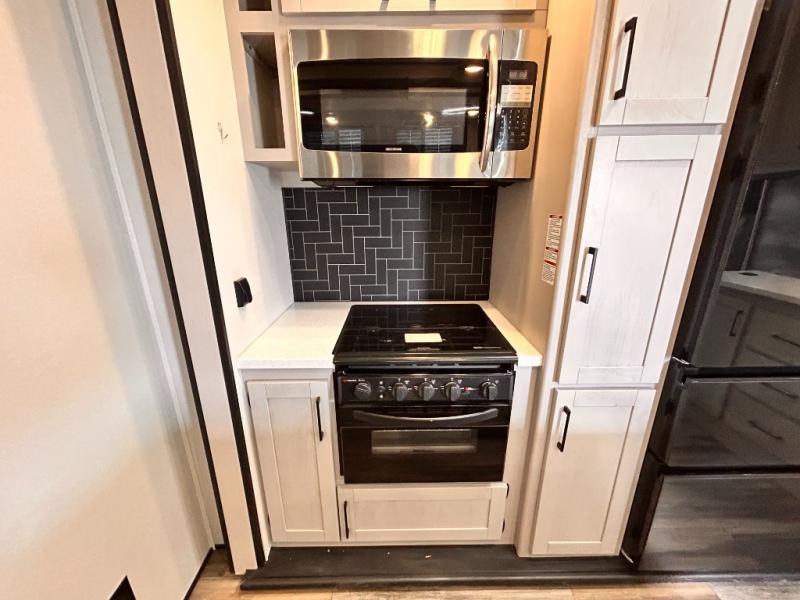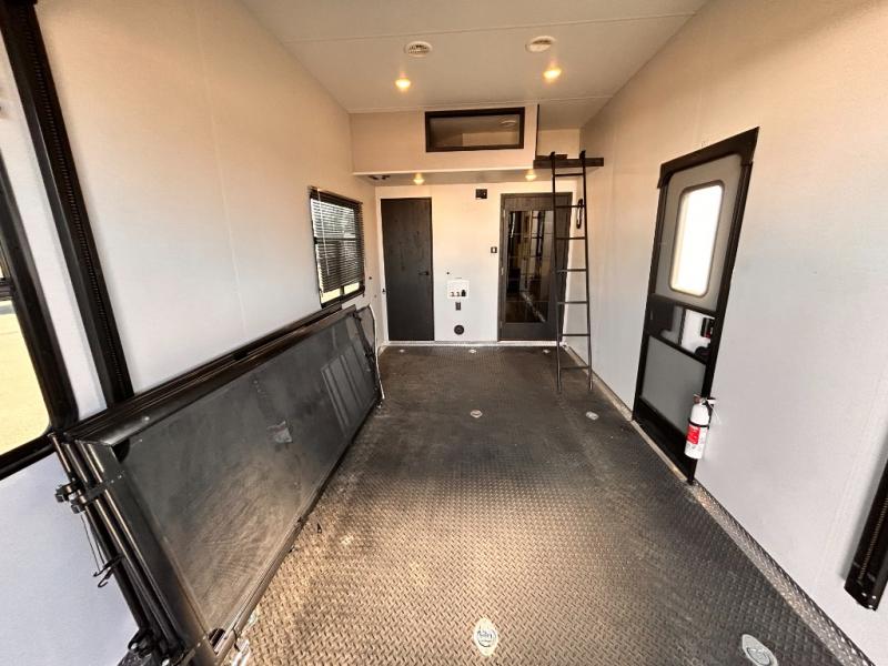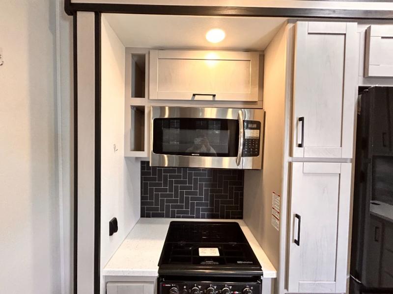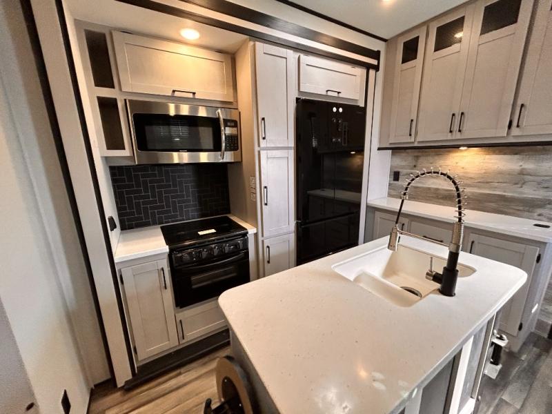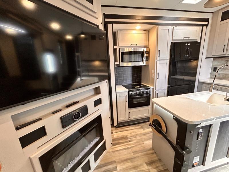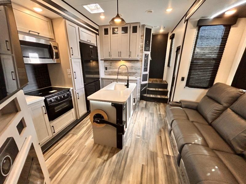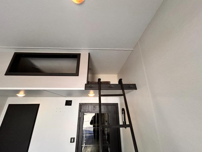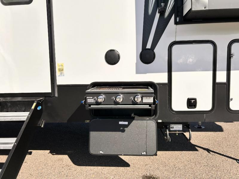 This toy hauler is decked out in comfortable features! The 17' 9" garage area has a loft above a half bathroom, an electric queen bed with split bench seating below it, and one of the dual entry doors to the unit. The chef can prepare their best home cooked meals either indoors with the three burner cooktop and kitchen island with two swing out bar stools or head to the outdoor Griddle & Go. Freshen up in the dual entry bathroom with the spacious tub which has a skylight above to bring the outdoors inside and it leads directly into the front master suite which has a tilting king bed and a wardrobe/closet slide to keep your clothes looking their best!