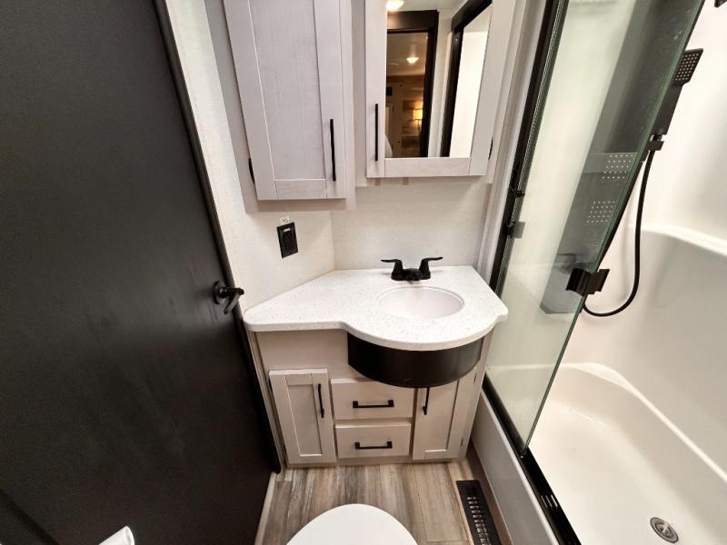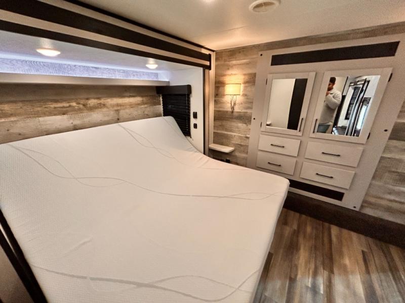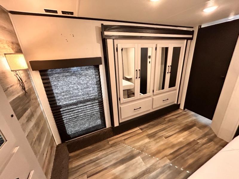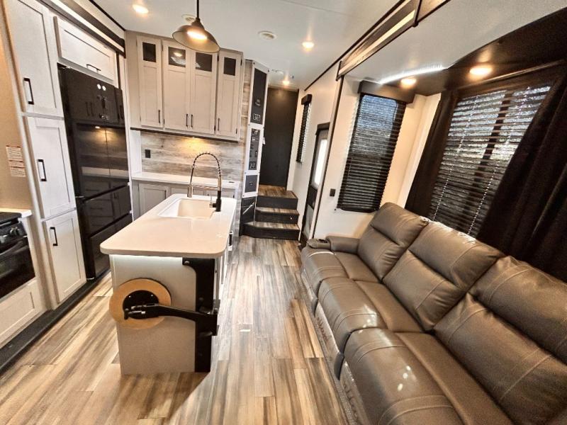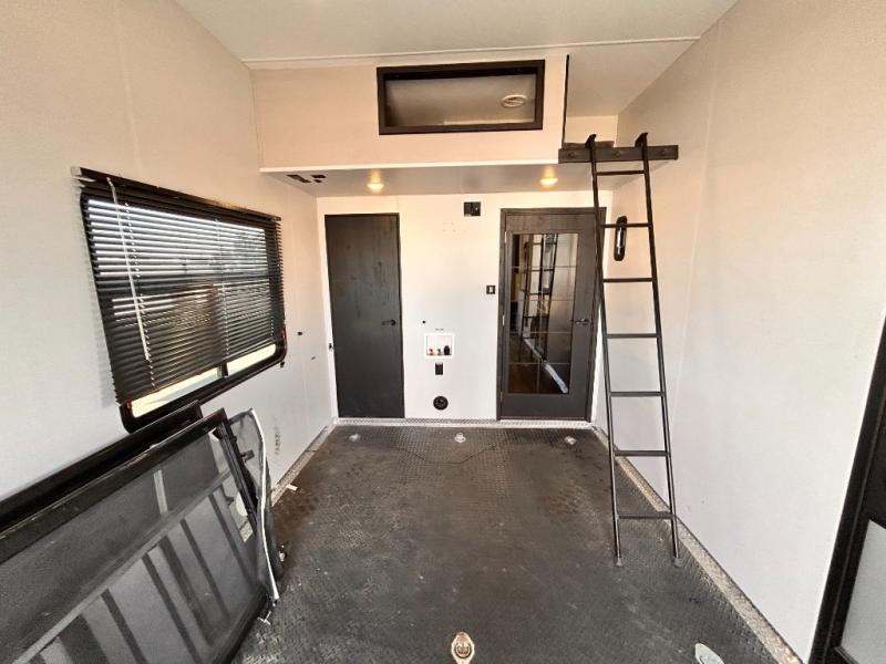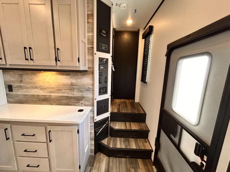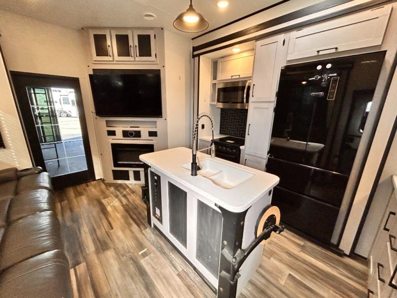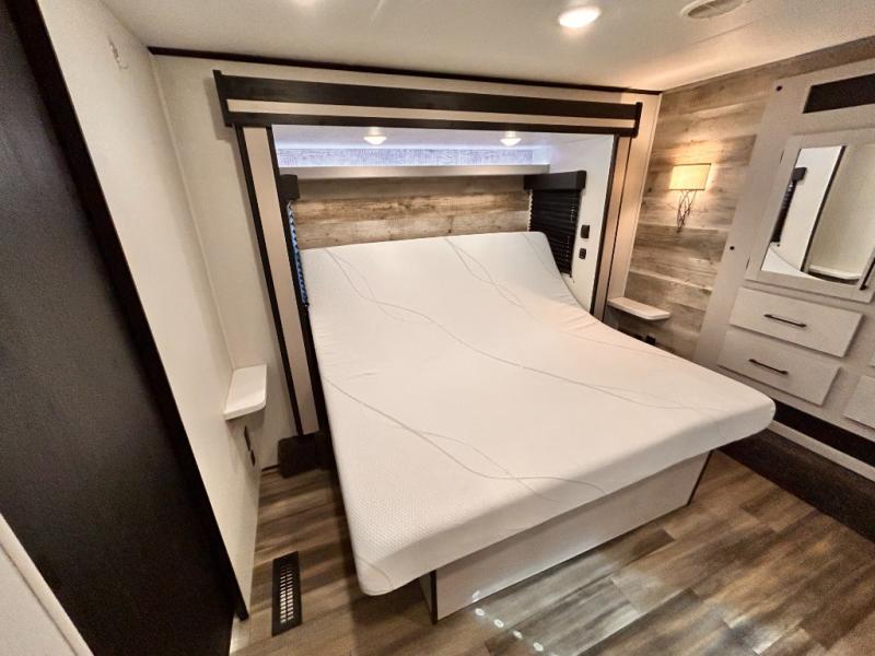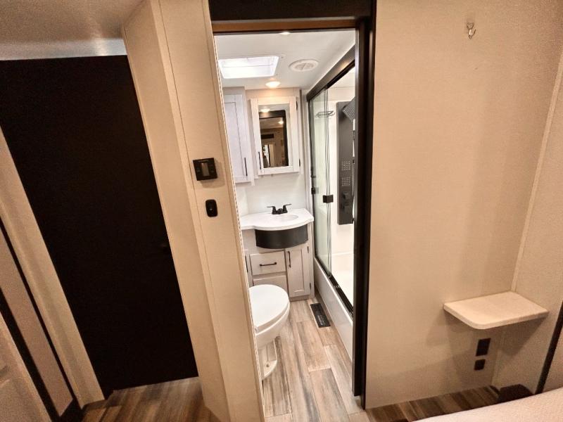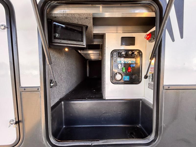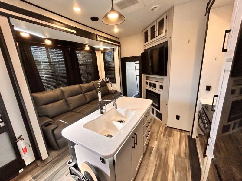 This toy hauler is decked out in comfortable features! The 17' 9" garage area has a loft above a half bathroom, an electric queen bed with split bench seating below it, and one of the dual entry doors to the unit. The chef can prepare their best home cooked meals either indoors with the three burner cooktop and kitchen island with two swing out bar stools or head to the outdoor Griddle & Go. Freshen up in the dual entry bathroom with the spacious tub which has a skylight above to bring the outdoors inside and it leads directly into the front master suite which has a tilting king bed and a wardrobe/closet slide to keep your clothes looking their best!