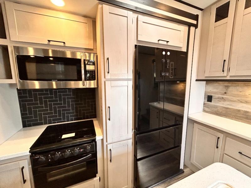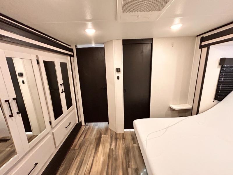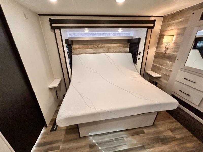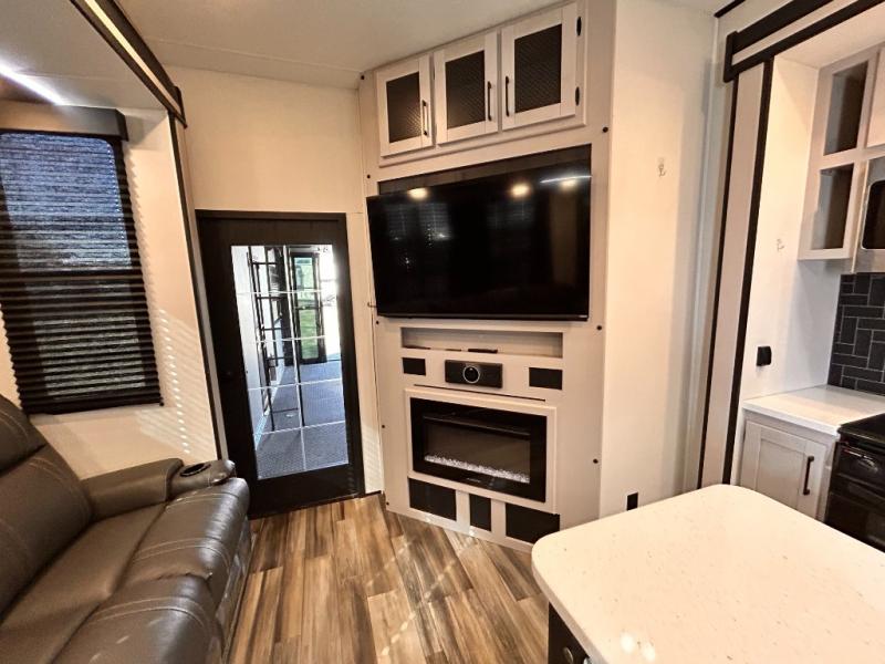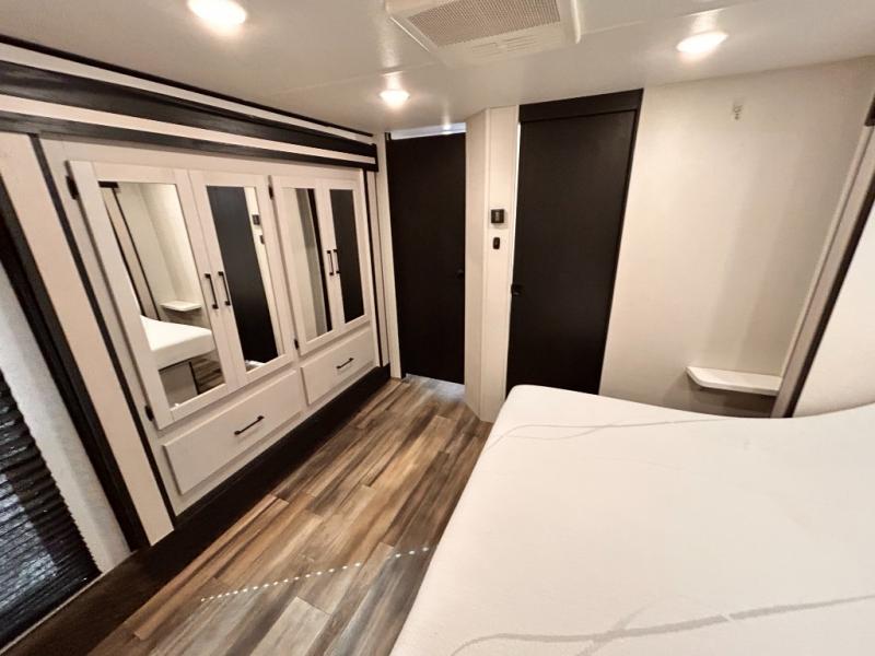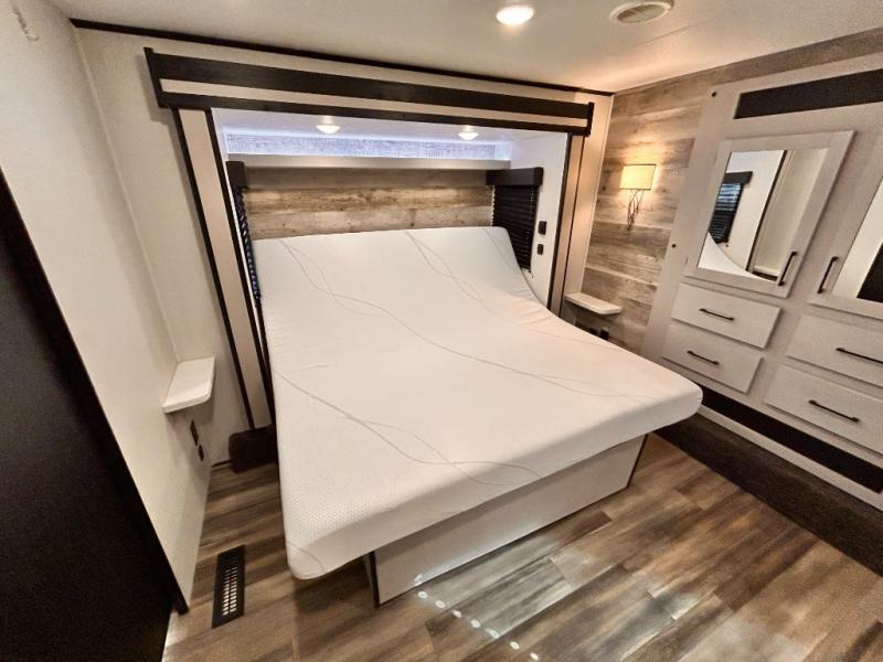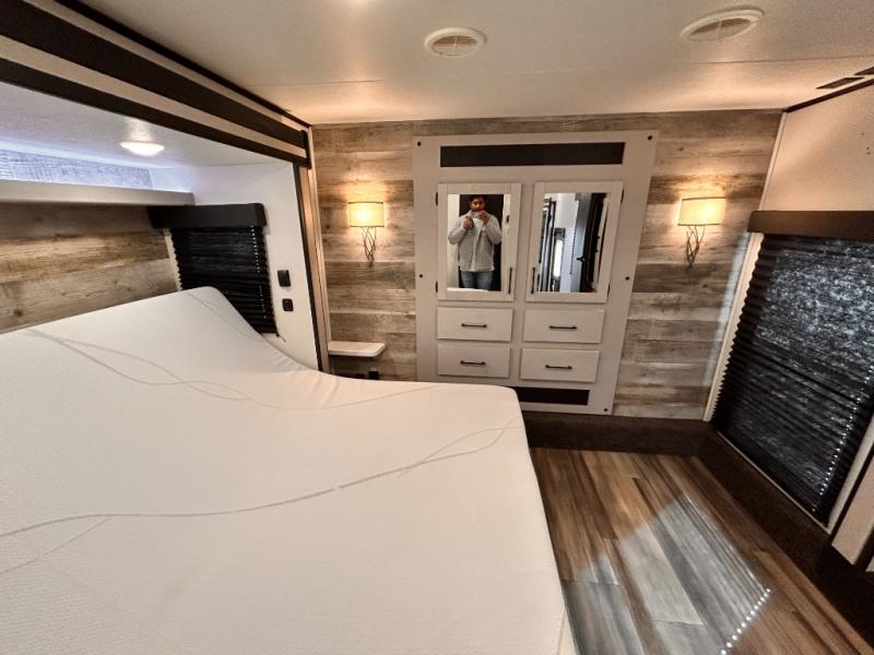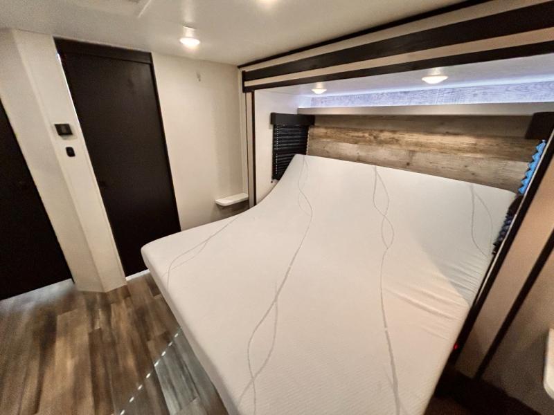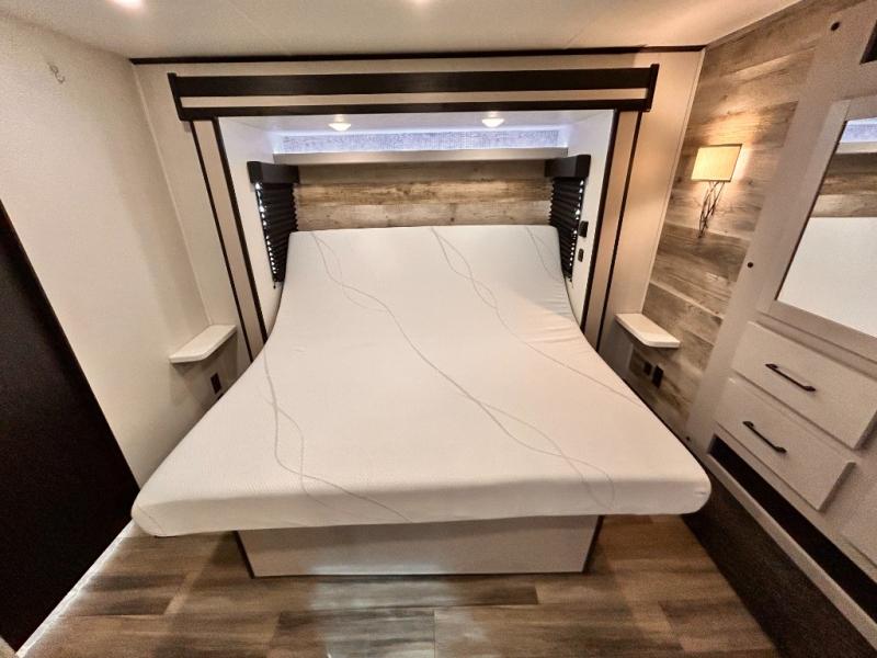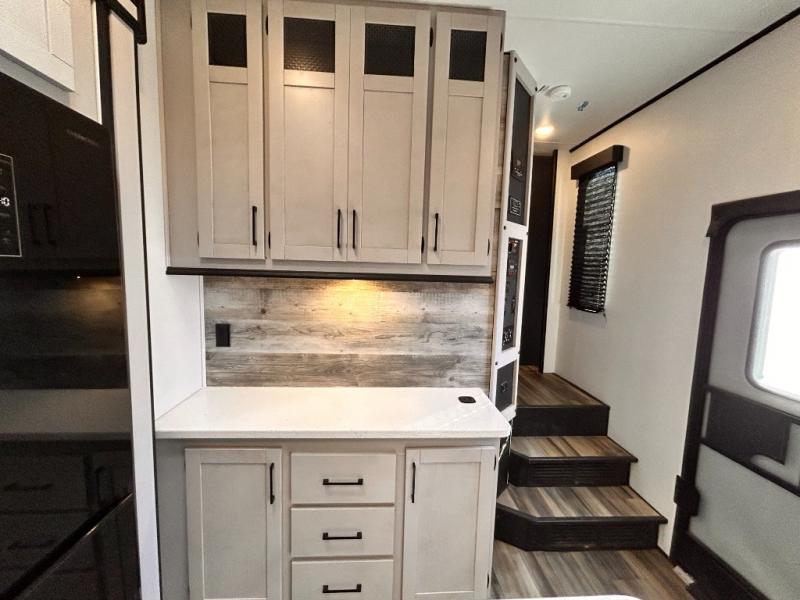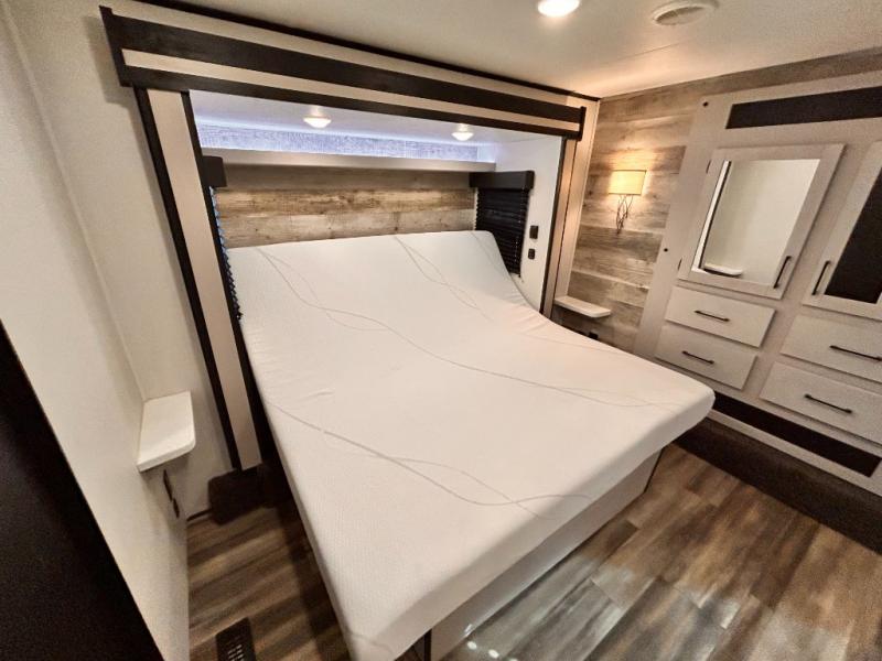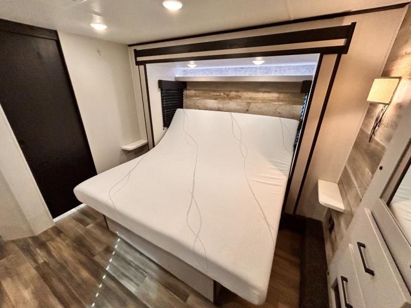 This toy hauler is decked out in comfortable features! The 17' 9" garage area has a loft above a half bathroom, an electric queen bed with split bench seating below it, and one of the dual entry doors to the unit. The chef can prepare their best home cooked meals either indoors with the three burner cooktop and kitchen island with two swing out bar stools or head to the outdoor Griddle & Go. Freshen up in the dual entry bathroom with the spacious tub which has a skylight above to bring the outdoors inside and it leads directly into the front master suite which has a tilting king bed and a wardrobe/closet slide to keep your clothes looking their best!