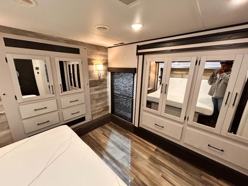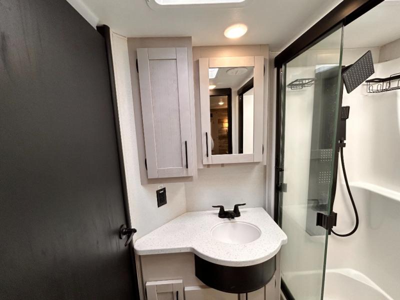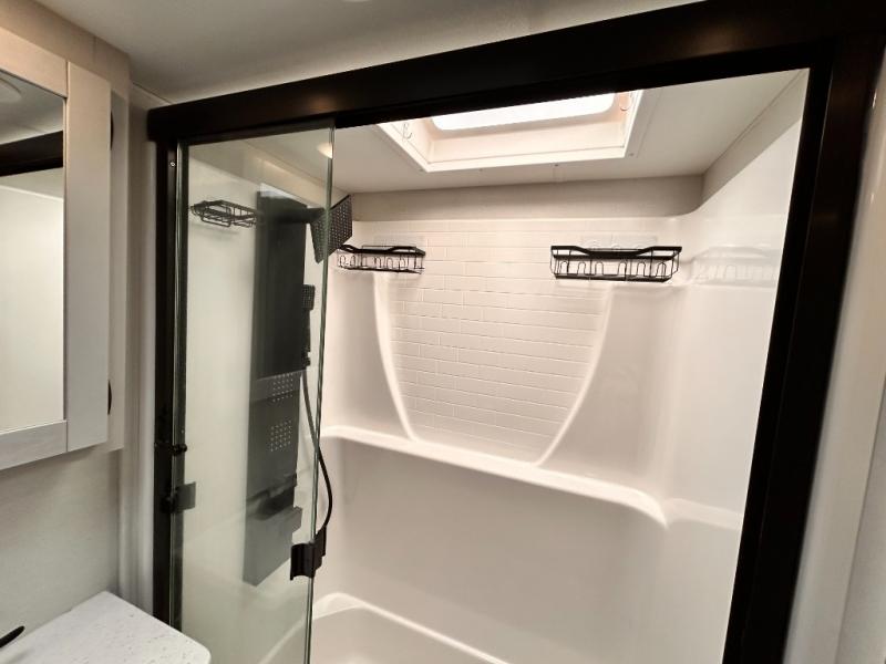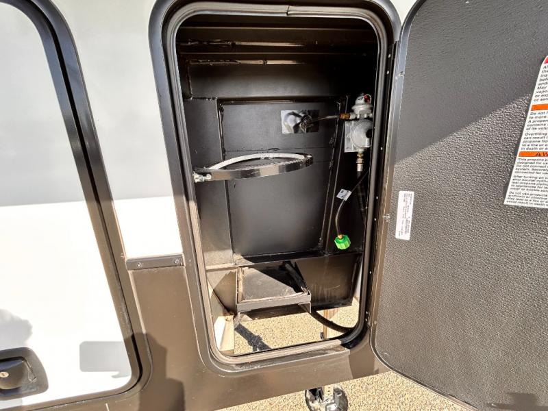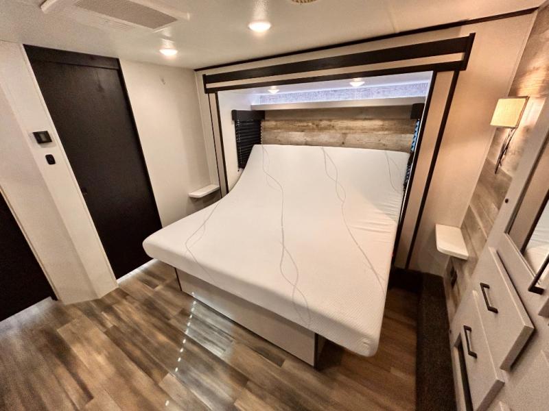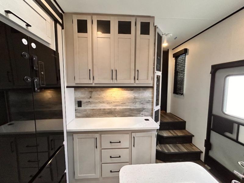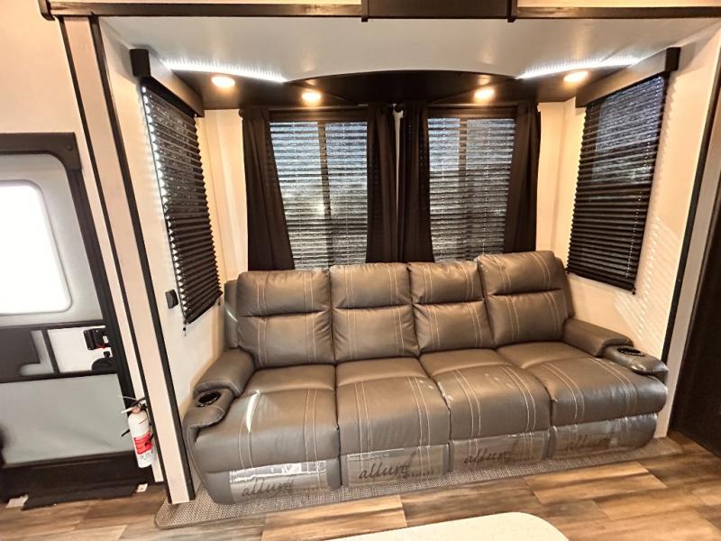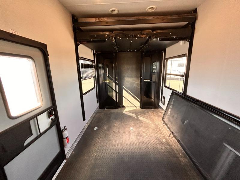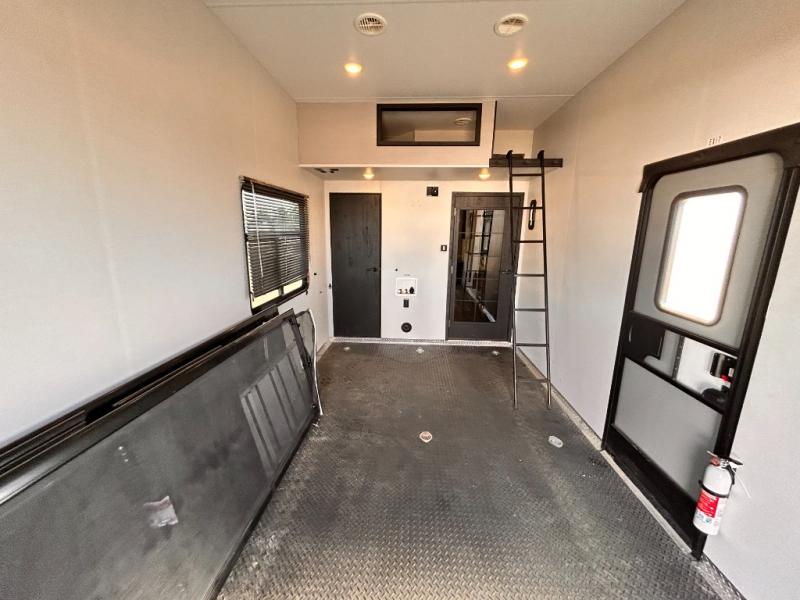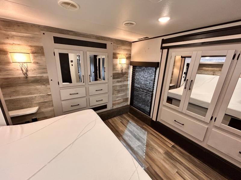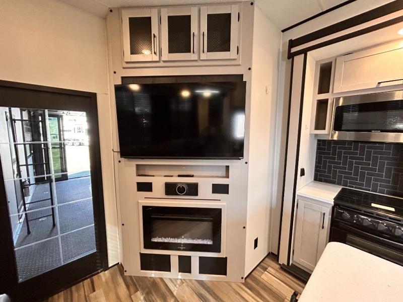 This toy hauler is decked out in comfortable features! The 17' 9" garage area has a loft above a half bathroom, an electric queen bed with split bench seating below it, and one of the dual entry doors to the unit. The chef can prepare their best home cooked meals either indoors with the three burner cooktop and kitchen island with two swing out bar stools or head to the outdoor Griddle & Go. Freshen up in the dual entry bathroom with the spacious tub which has a skylight above to bring the outdoors inside and it leads directly into the front master suite which has a tilting king bed and a wardrobe/closet slide to keep your clothes looking their best!