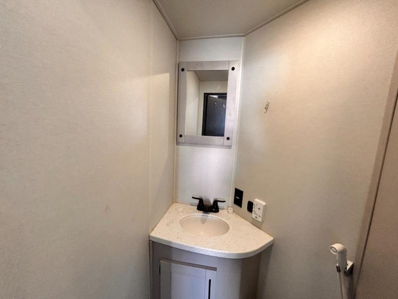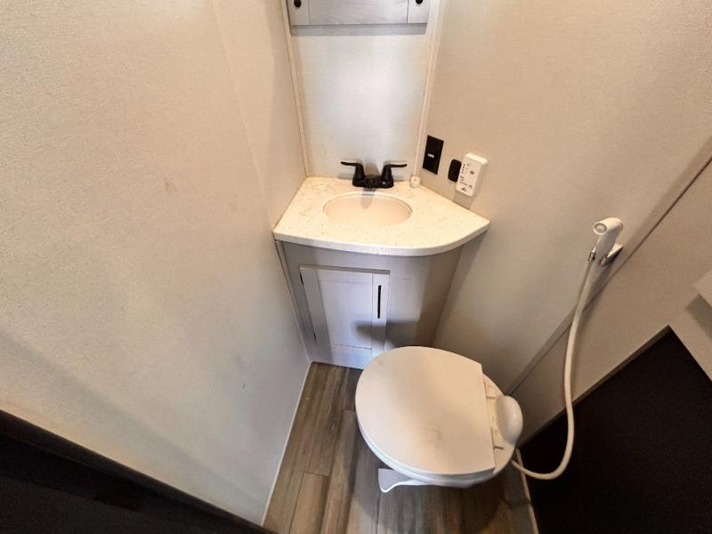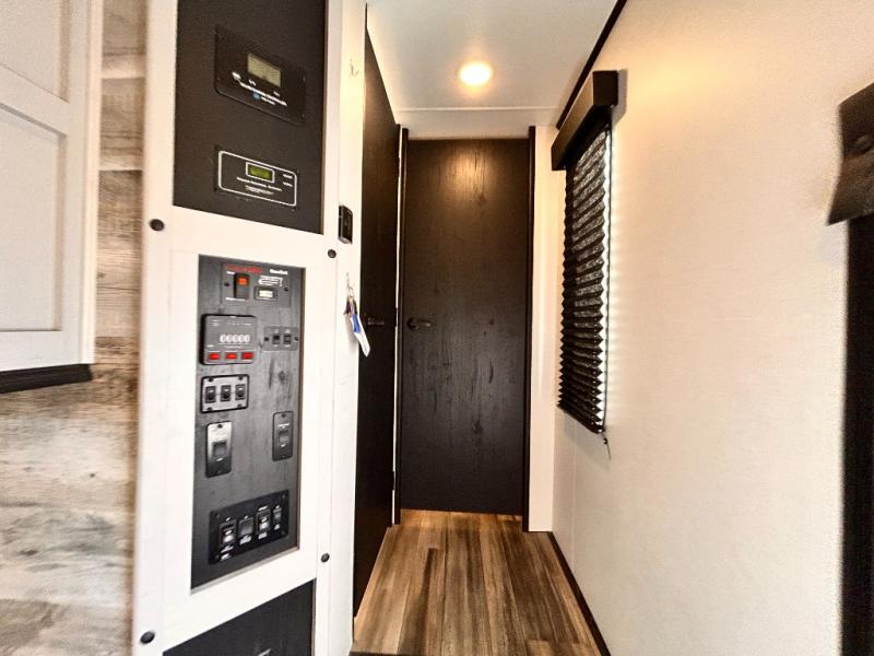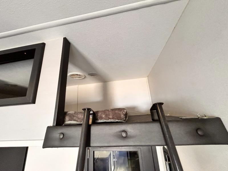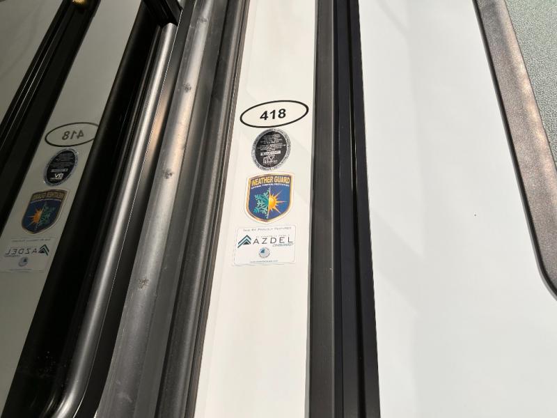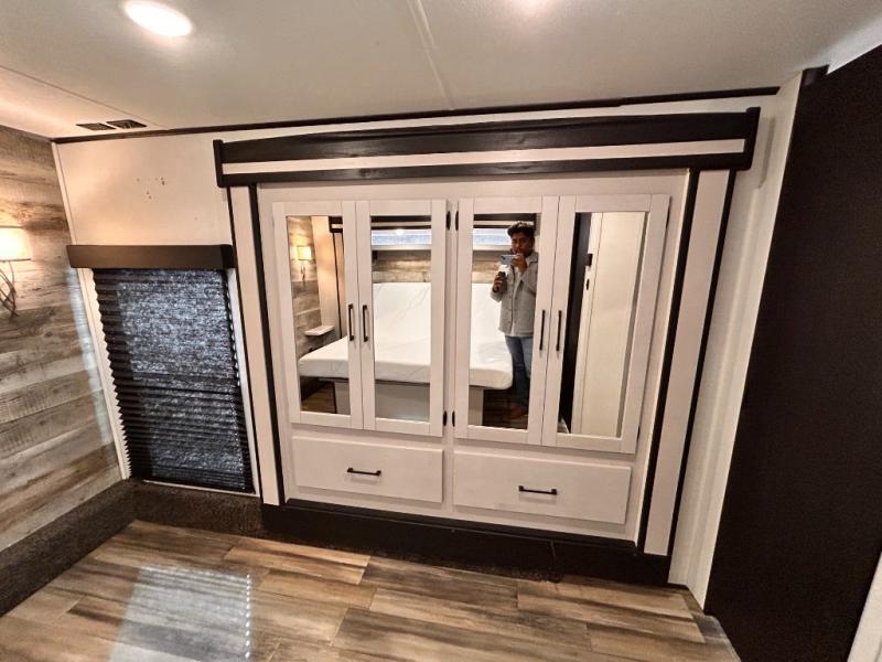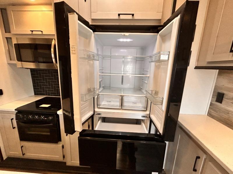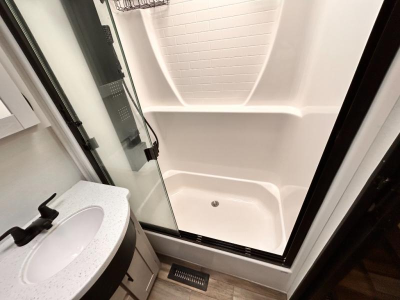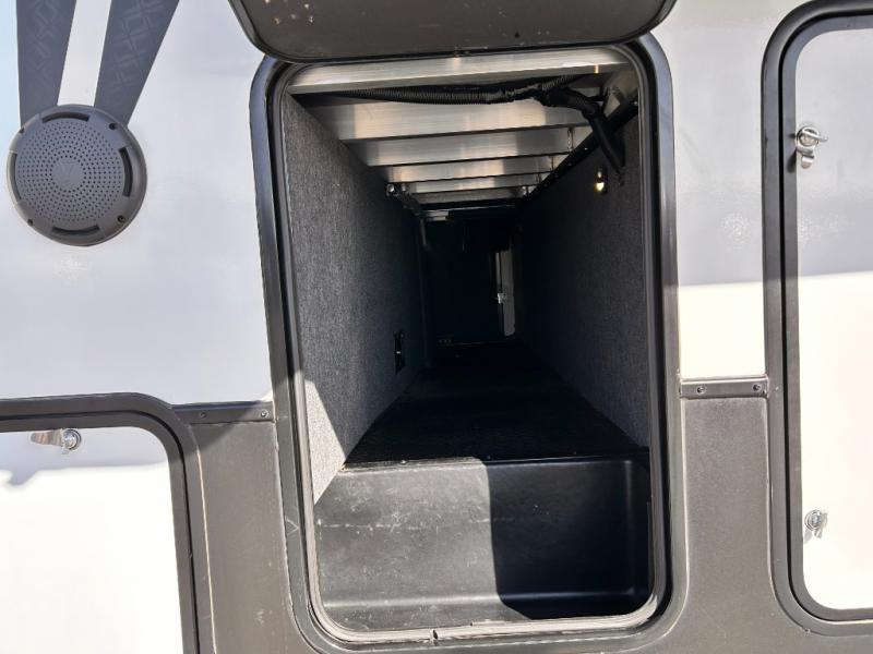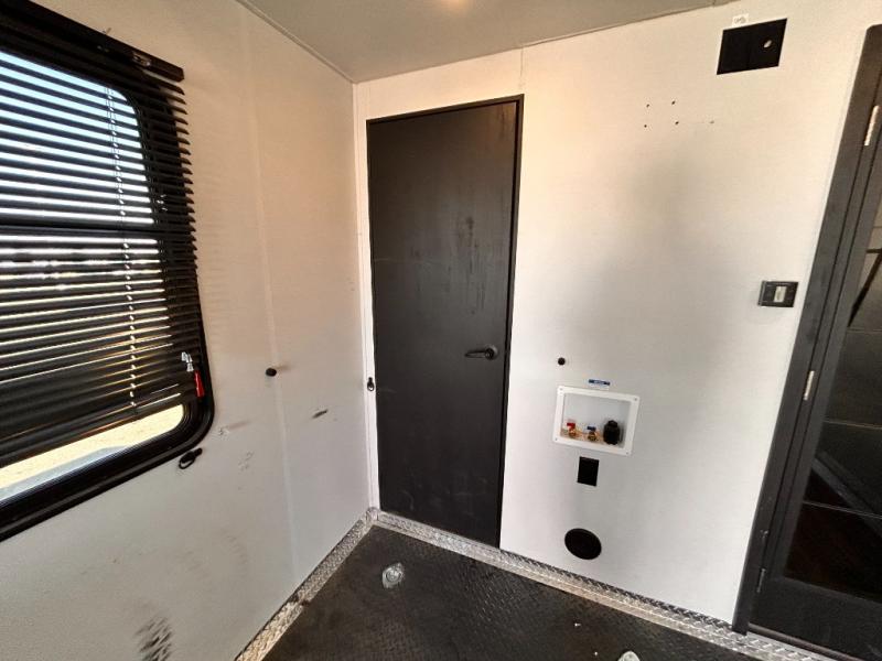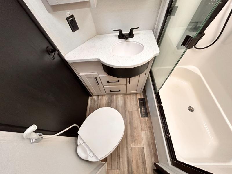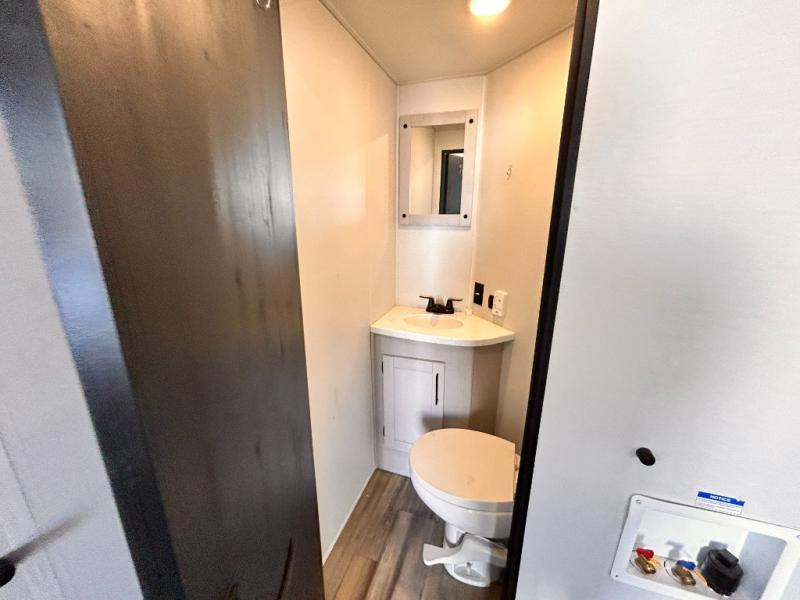 This toy hauler is decked out in comfortable features! The 17' 9" garage area has a loft above a half bathroom, an electric queen bed with split bench seating below it, and one of the dual entry doors to the unit. The chef can prepare their best home cooked meals either indoors with the three burner cooktop and kitchen island with two swing out bar stools or head to the outdoor Griddle & Go. Freshen up in the dual entry bathroom with the spacious tub which has a skylight above to bring the outdoors inside and it leads directly into the front master suite which has a tilting king bed and a wardrobe/closet slide to keep your clothes looking their best!