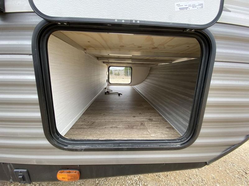 Everyone will have a comfortable place to sleep in this travel trailer! The kiddos will love having their own rear private bunkhouse with two upper bunks above a full bed and a dresser to store their clothes. You will have your own privacy with the front private bedroom which has a queen bed with under-bed storage, an oversized wardrobe to store your clothes, and wireless cell charging stations so you don't have to worry about bringing your chargers. The chef can prepare their best meals either indoors with the three burner cooktop or at the outside kitchen with a griddle while staying protected by the 20' power awning with LED lights. Enjoy your meals at the booth dinette then relax on the sofa.