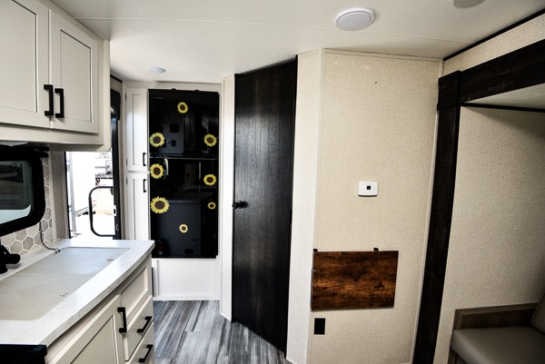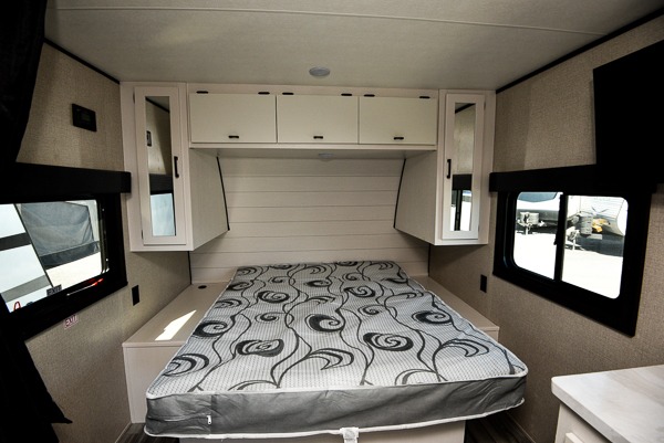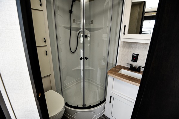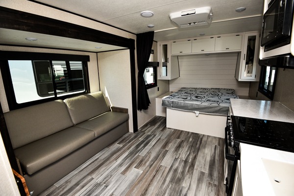 This is the perfect couple's trailer for room for an overnight guest on the jack-knife sofa. You'll appreciate a table in front of the sofa where you can enjoy eating together, and the slide out provides more space to move about. This model includes a front bedroom with a privacy curtain and dual wardrobes to store your clothes for the week, plus there is a full bath towards the back of the unit to stay clean each day. Snacks and paper goods can go in the entryway pantry, and camp gear can be kept in the outdoor storage!