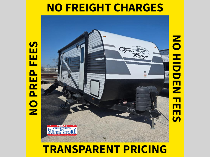 The affordable Open Range Conventional travel trailers by Highland Ridge are ready to meet your camping needs! You will appreciate the durable Magnum Roof system, plus each model is constructed with black front diamond plate protection, 5/8" main floor decking, and self-adjusting electric brakes with E-Z Lube axles for smooth towing. The 81" interior height means you won't feel cramped when relaxing with friends and family, and the residential vinyl flooring throughout is easy to clean, which will be perfect if you're camping with little ones or pets. These models also include an AM/FM/Bluetooth radio with indoor/outdoor speakers, a digital TV antenna that will go perfectly with the optional Smart TV, plus a 13,500 BTU roof mounted A/C to keep you cool on those hot summer months.