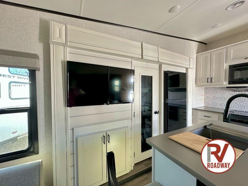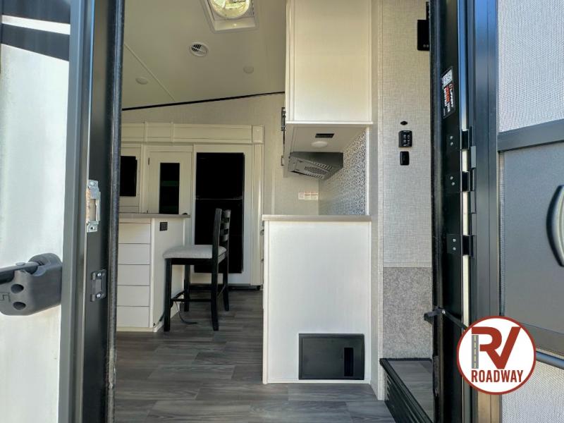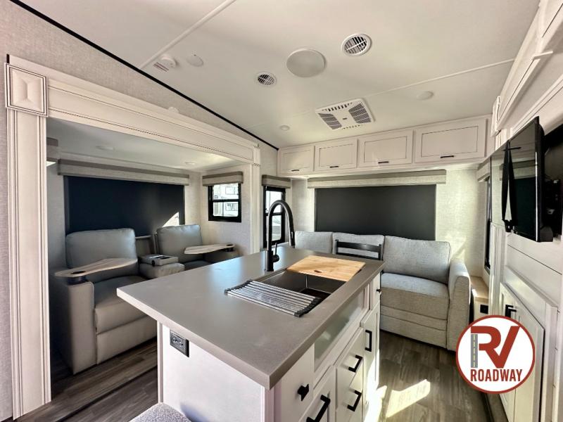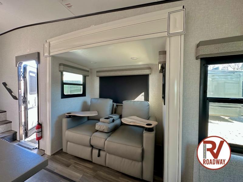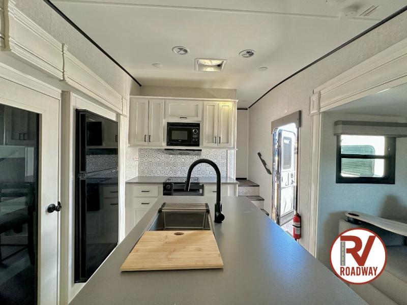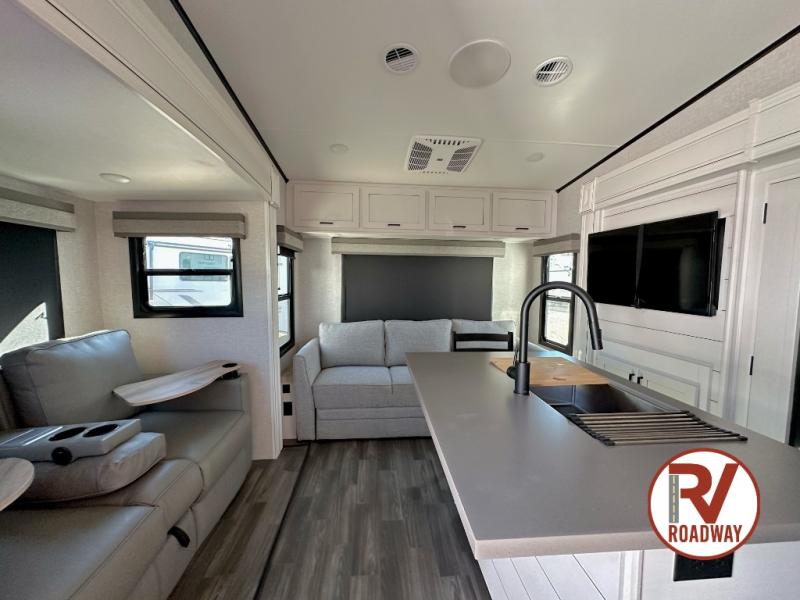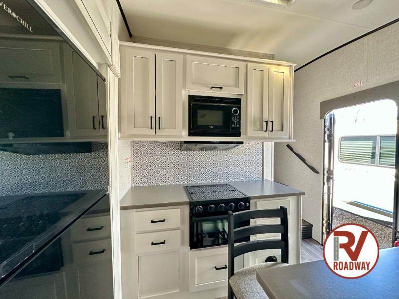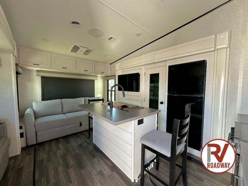 This well equipped fifth wheel features an open concept kitchen and living area with a dining table and two chairs within a slide just to the left of the entry door. Additionally a center island offers two bar height seats for quick meals or gathering with friends. The island also features a sink which makes prep work and cleanup easy. More counter space can be found along the interior wall where you will also find a three burner range with oven and an overhead microwave. There is plenty of cabinet storage and drawer space, a large pantry, and a 10 cu. ft. 12V refrigerator within the roadside slide. From the bi-fold sofa along the rear wall you can easily view the 39" TV and fireplace, and the sofa can be converted into sleeping space for two more overnight guests. The full bath will let you freshen up each day and the front private bedroom with a queen bed will feel just like home!