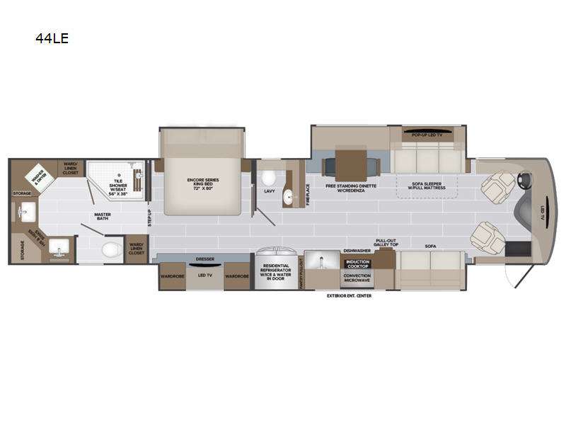 You are going to love this Armada Class A diesel motorhome! As the owners, you'll enjoy a magnificent oasis in the back of this coach with a high-class master suite. The bedroom is connected to a spacious master bathroom that has a dual-sink vanity, a separated toilet room within the bathroom, a 56" x 38" tile shower with seat, two linen closets, plenty of storage for toiletries, and a washer/dryer. Now isn't that amazing? The bedroom is also filled with comfort as it contains an Encore Series king bed, opposing slides, an LED TV, two wardrobes, and a dresser. Not only is there a full bathroom back in the master suite, but there is an additional half bath out in the main living area which will be useful for anyone else traveling with you. The living area is ultra comfortable with its sofa sleeper with pull-out full mattress, second sofa, free-standing dinette with credenza, fireplace, and pop-up LED TV. There is even an additional TV above the cab for your viewing pleasure.
