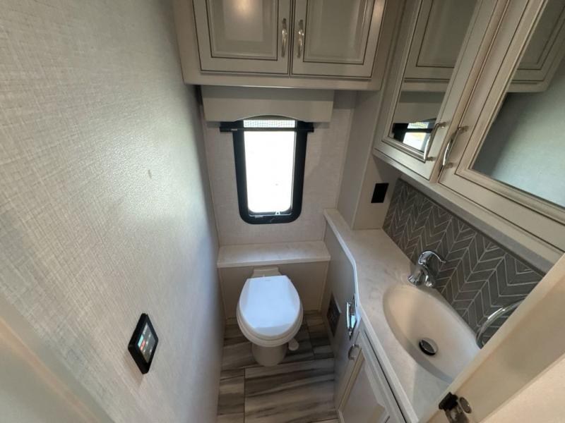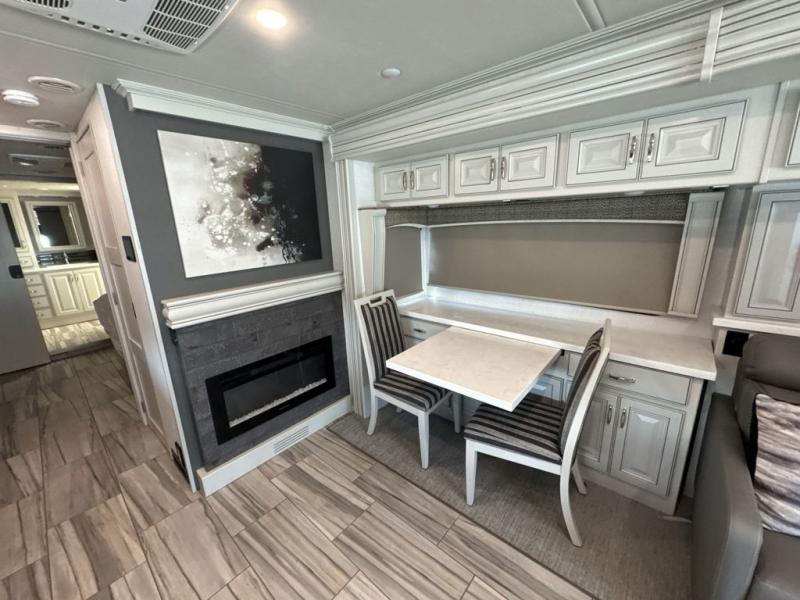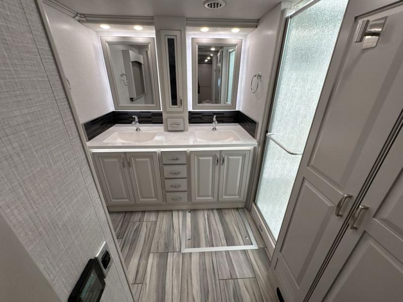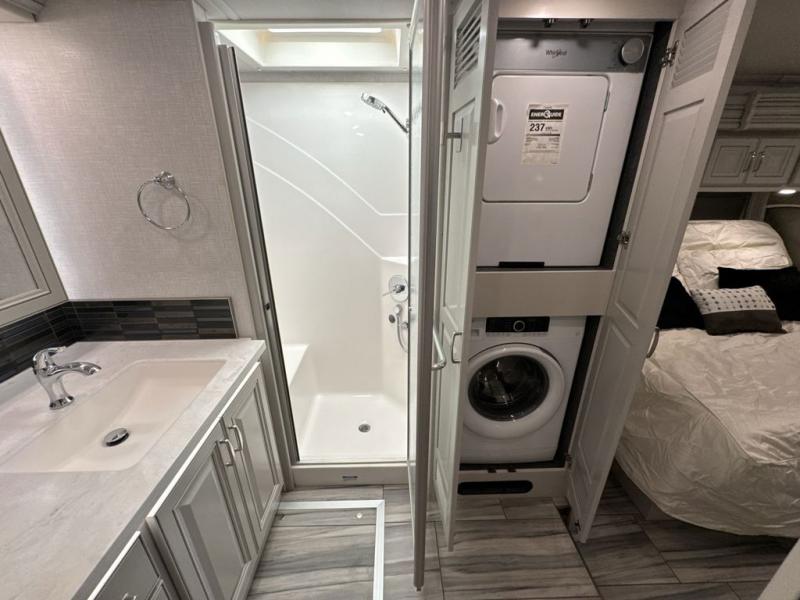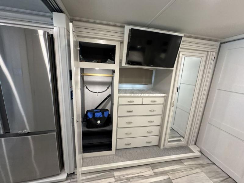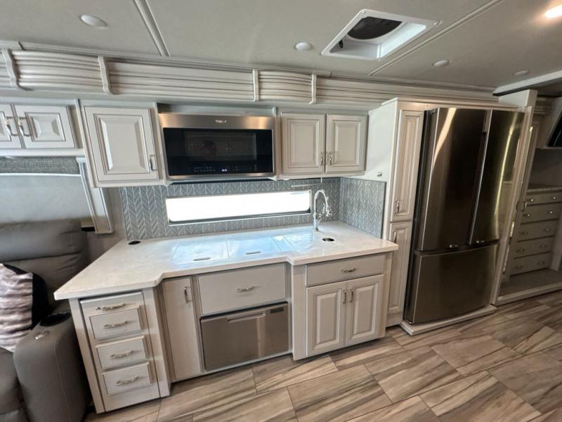 Whether you travel for business, pleasure, or both, you will appreciate all the comforts and luxury found throughout this coach! There is a spacious master bedroom with a king bed, dual wardrobes and an LED TV above a dresser, and a rear full bathroom with two sinks. You will be able to keep everything clean using the stackable washer/dryer, and there is a linen closet for storage. The mid-coach half bath is convenient especially when you have guests, and the sofa sleeper with a full mattress and the second sofa offer more sleeping space. And you might like to add the Hide-A-Bed power drop-down overhead bunk option so you can invite more overnight guests. The kitchen will make any cook happy with a convection microwave, a residential refrigerator with ice and water in the door, and the style of the polished solid surface galley countertop with lighting.