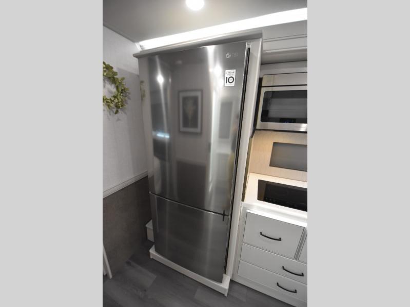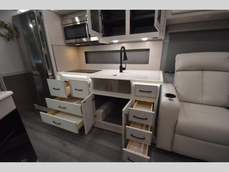 Chef-Inspired Kitchen: Equipped with solid-surface countertops, a residential refrigerator, a convection microwave, and a three-burner cooktop, this kitchen is designed to make cooking on the road as convenient as at home.