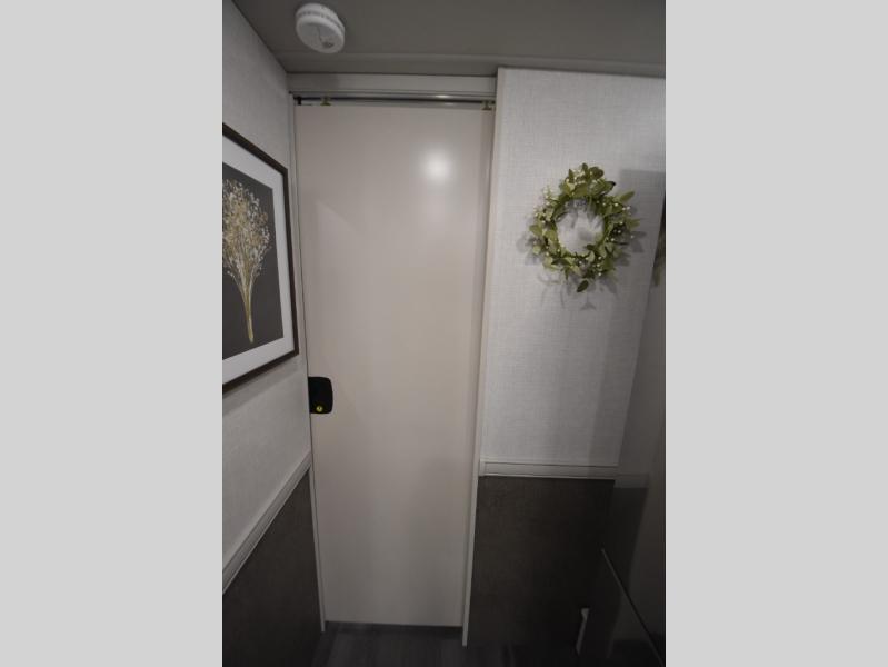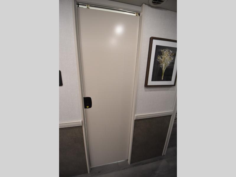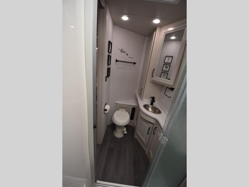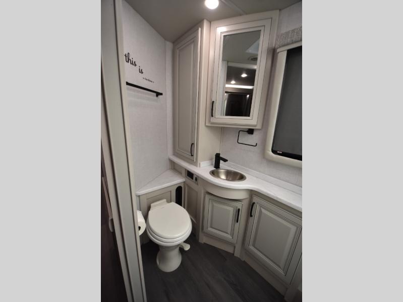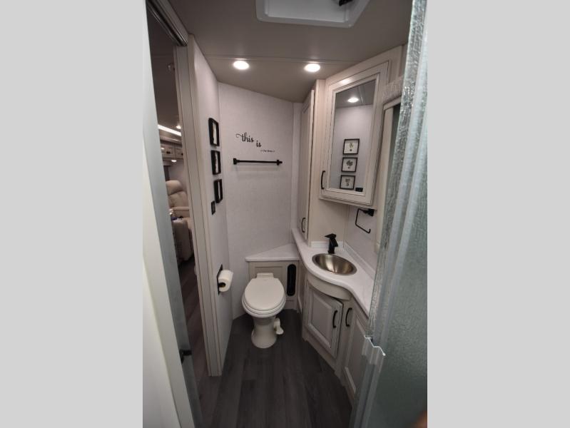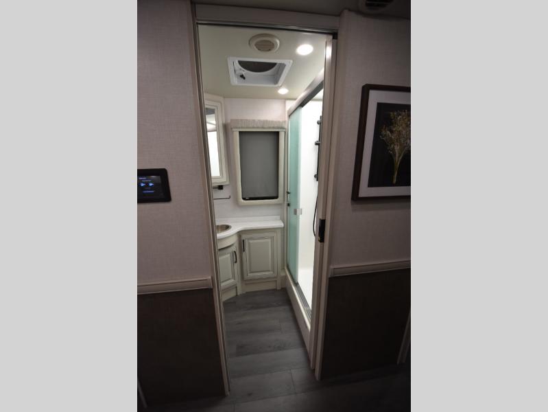 Full Bath with High-End Finishes: A large shower with glass doors, solid-surface vanity, and premium fixtures make the bathroom feel more like a spa retreat than an RV bath.