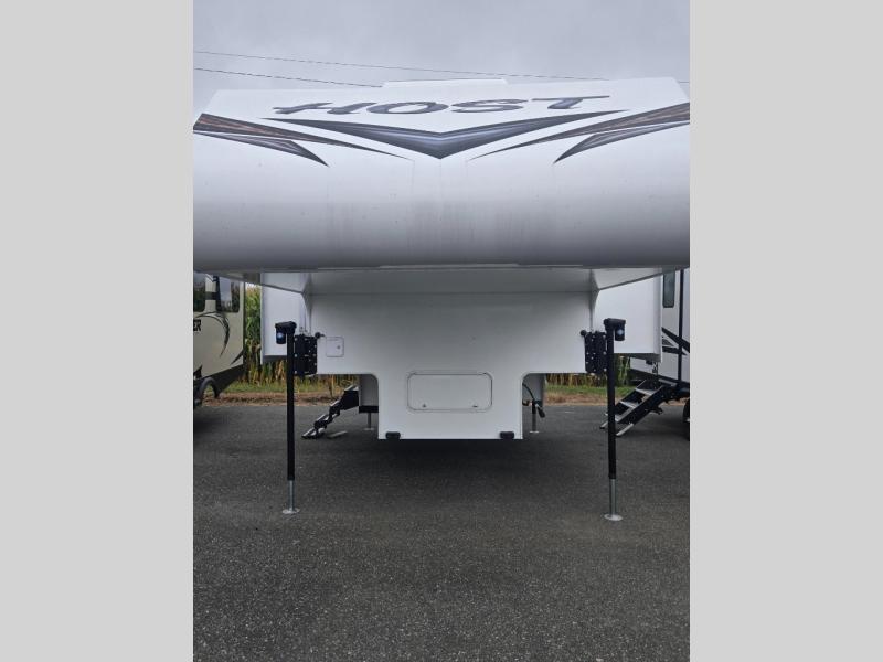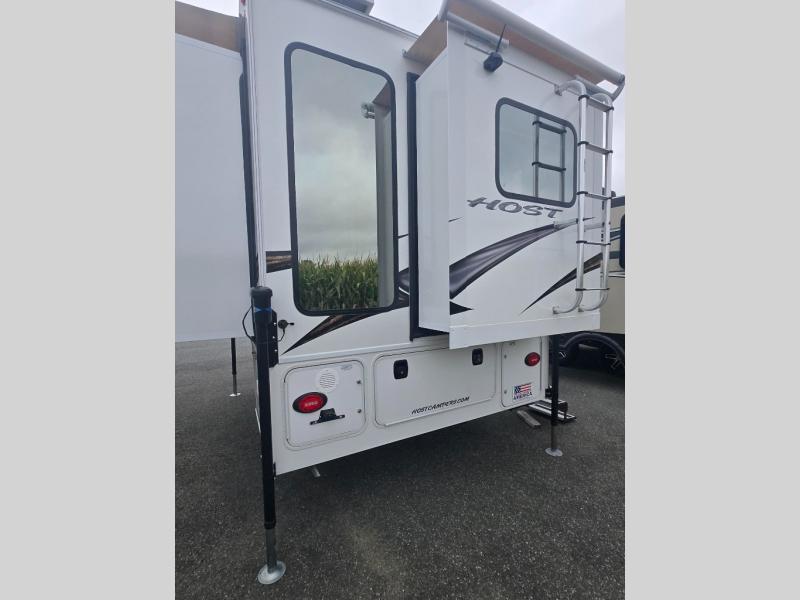 With any Host Industries Host Campers truck camper, there is ease of setting up with electric jacks with a wireless remote, and security when traveling thanks to the heavy duty camper tie down brackets. Each is constructed with two or three slide outs giving you more interior space on an Ultralite 100% aluminum structure with vacuum bonded foam insulated walls, a floor and a ceiling, plus there is a one-piece TPO roof. Some conveniences include an enclosed service center, enclosed and heated holding tanks, large J-rail rain gutters, and access panels for the slide out motors, water tank and holding tanks to mention a few. And the interior is just as impressive from the style, decor choices, the 12 volt LED lighting system, the Grani-coat solid surface countertops, and the many options you can add to customize your Host Camper!