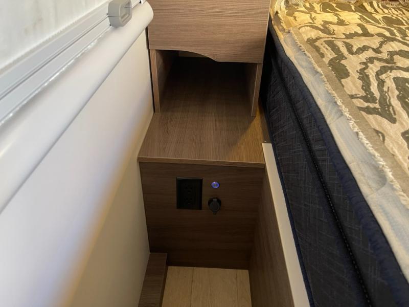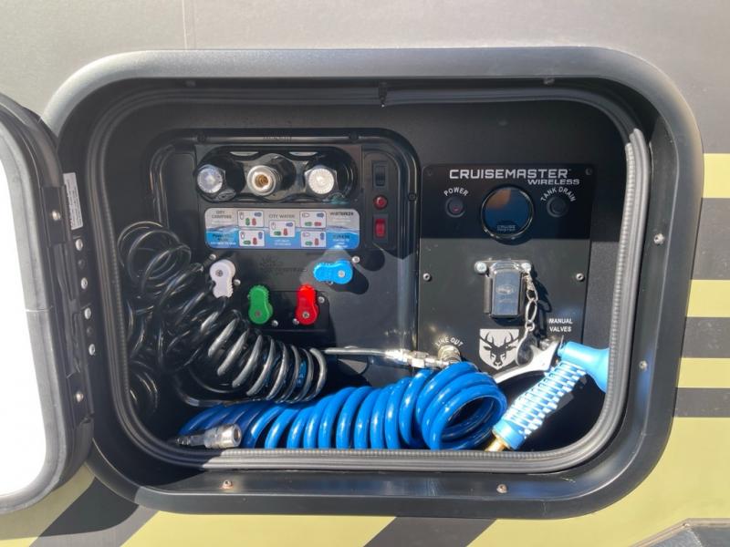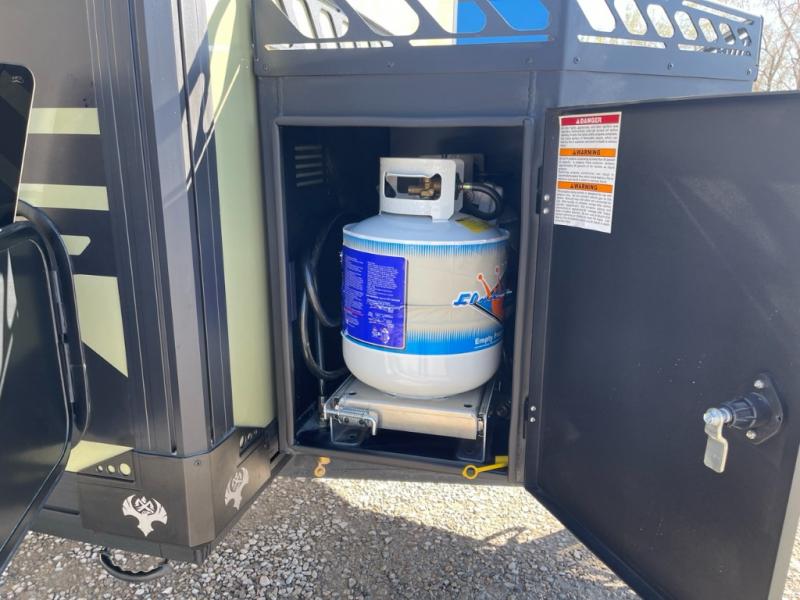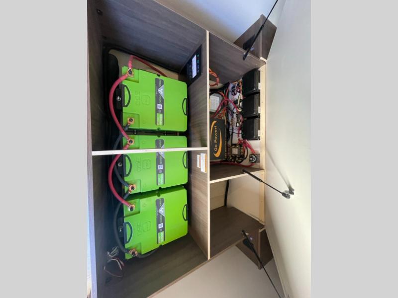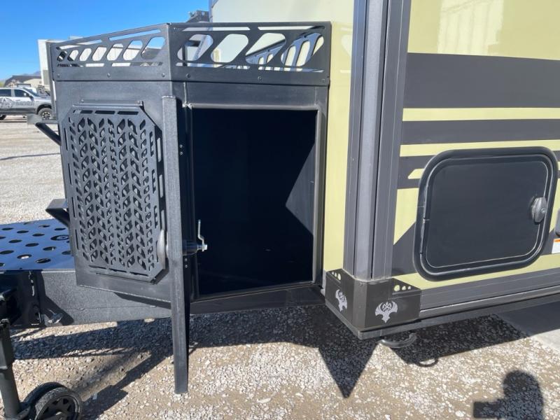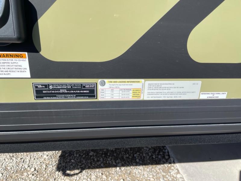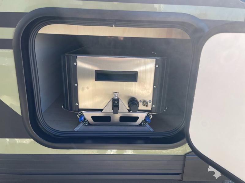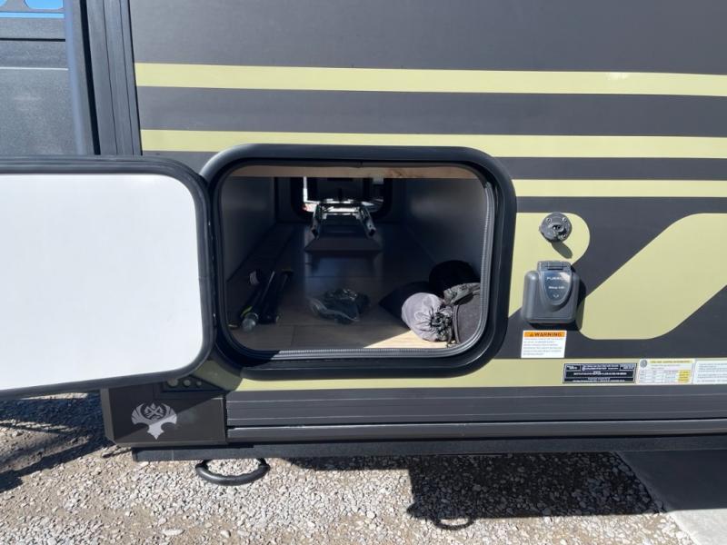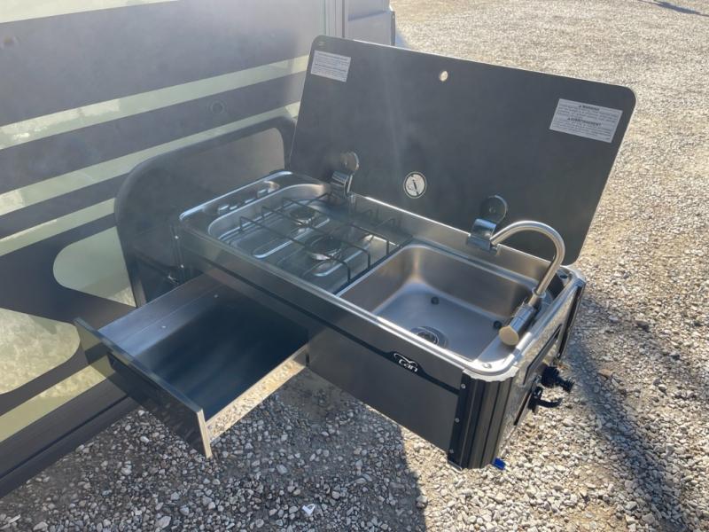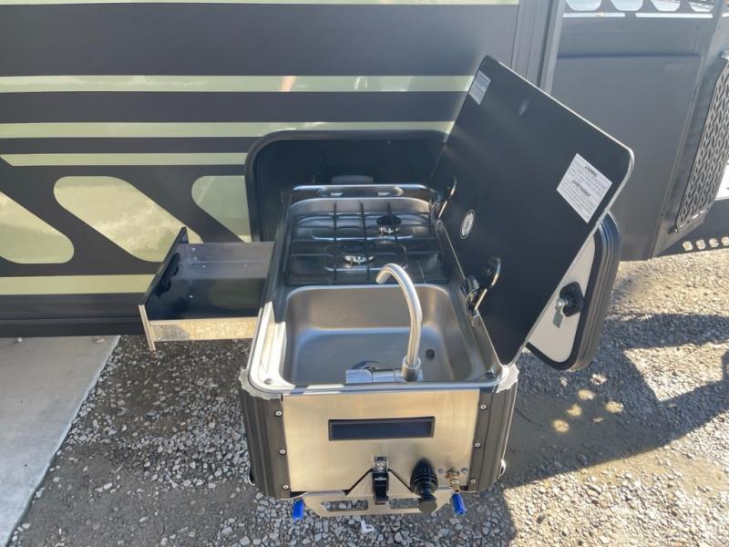 Make each camping trip count in this travel! When you get to your destination you can unload your gear from the exterior pass-through storage, then set up the 22' 6" batwing style awning. There is a full kitchen with a cooktop inside to prepare lunch on, plus a 6.9 cu. ft. refrigerator for food storage and a sink to clean up. Head out to find a trail or two, then come back to clean up in the full rear bath that includes a shower and a dry flush toilet, which eliminates the need for a black tank. The full size walk-around bed (RV full) will provide a great night's rest, and there is overhead storage space on each side of the bed for convenience.