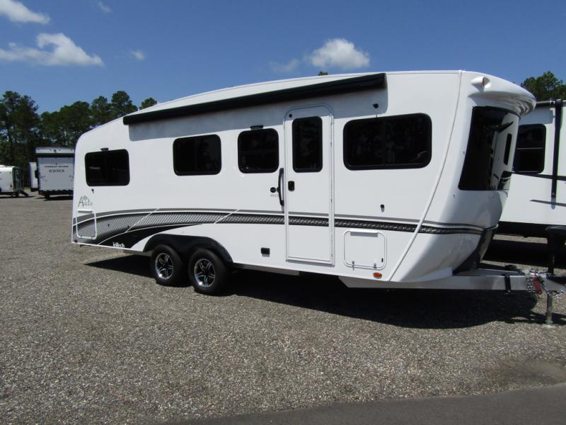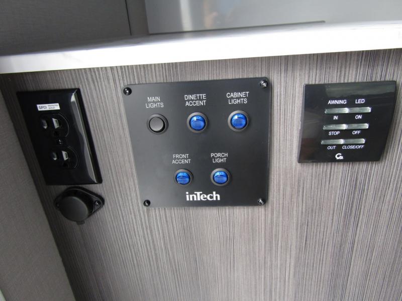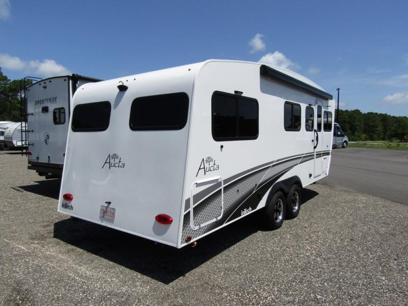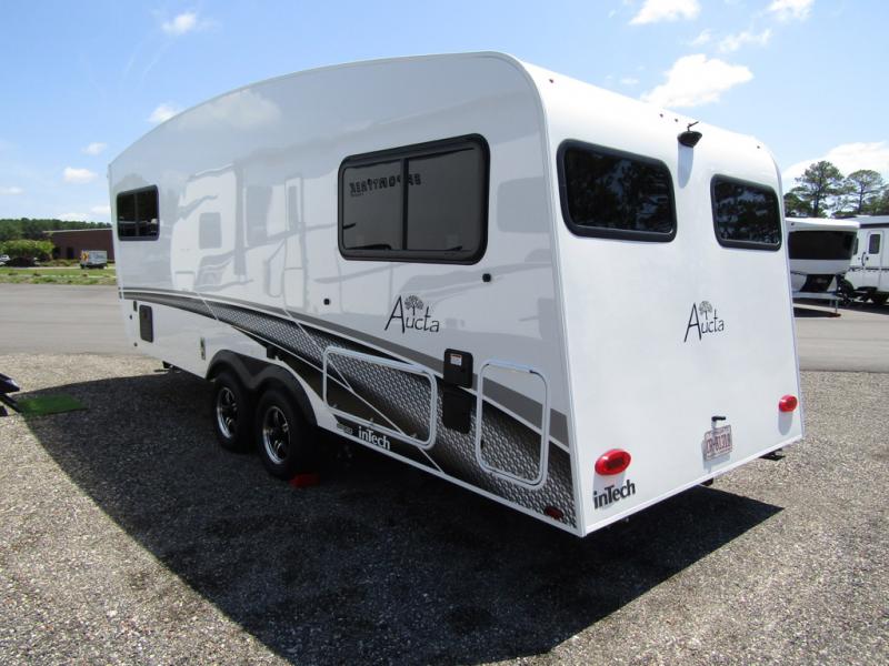 With any Aucta travel trailer by inTech RV you will enjoy creative interior spaces, luxury features, and smart storage spaces for a one-of-a-kind trailer. The one-piece fiberglass roof, all-aluminum cage frame, and Dexter torsion axle provide durable construction and smooth towing, and the fold-away double entry steps and power tongue jack will make set-up easier than ever. Inside, you'll find Infinity woven flooring, a large farmhouse sink, USB ports and 120V outlets, plenty of storage compartments, and MaxxAir vent fans to keep everything fresh. These models also include bubble foil insulation in the walls and ceiling, along with a 25K BTU furnace and a 15K BTU A/C so you can make memories year around!
